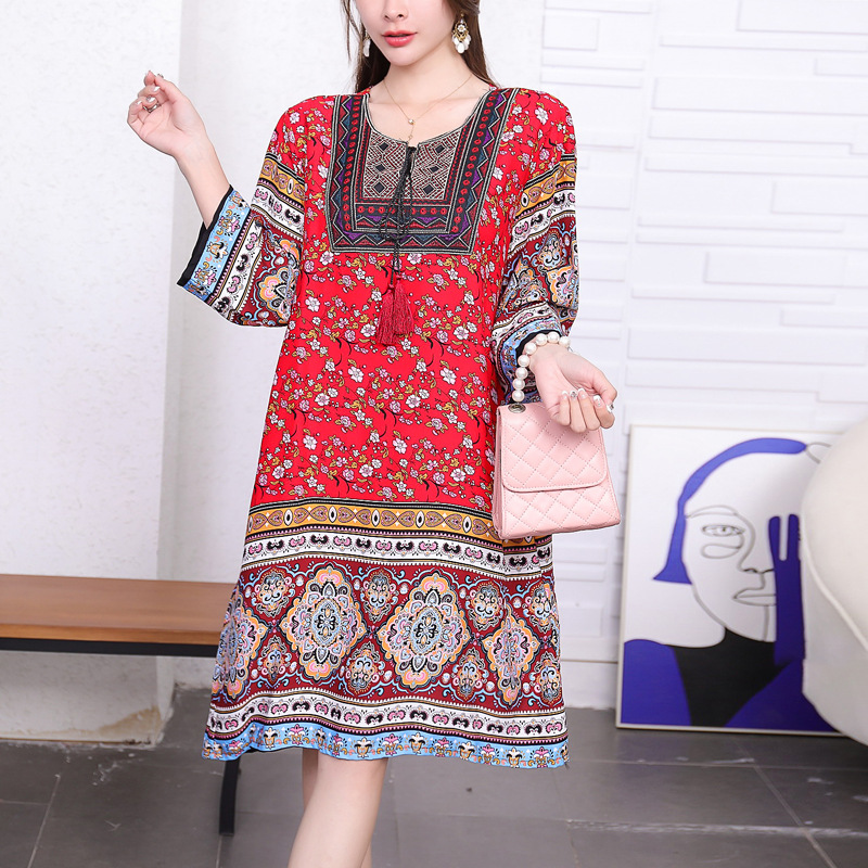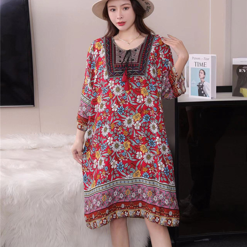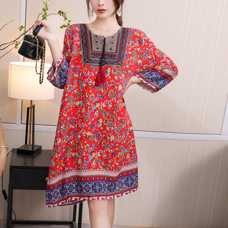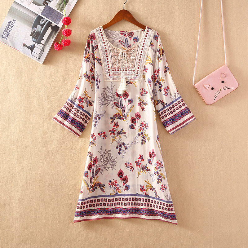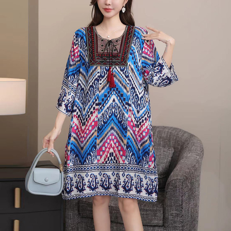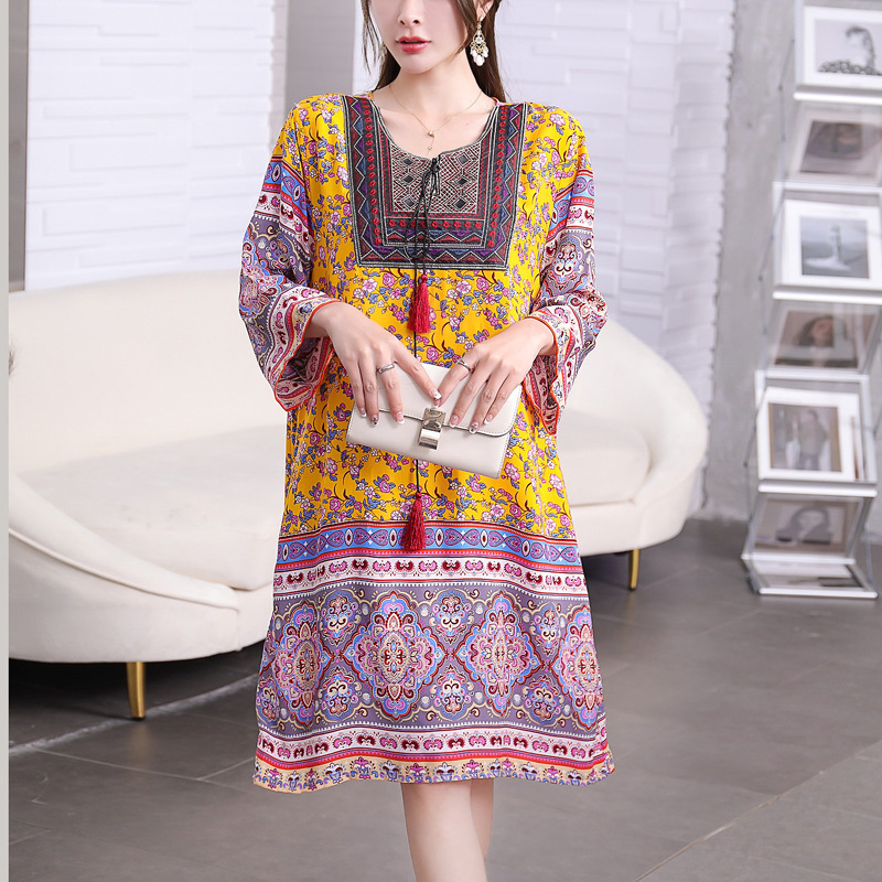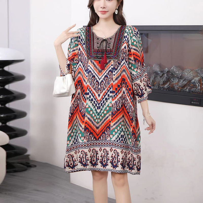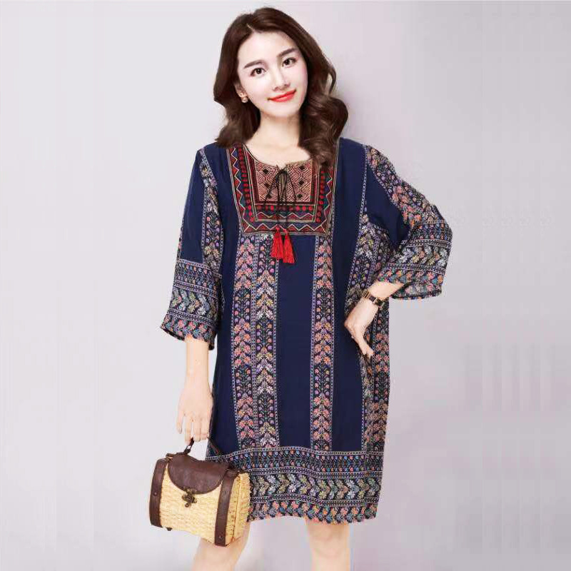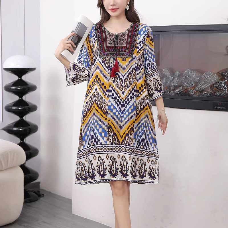 크로스보더 면 실크 원피스, 문학적 복고풍 민족 스타일 여성복, 태국 스타일 A라인 원피스, 면 원피스, 여름용스토어 가기