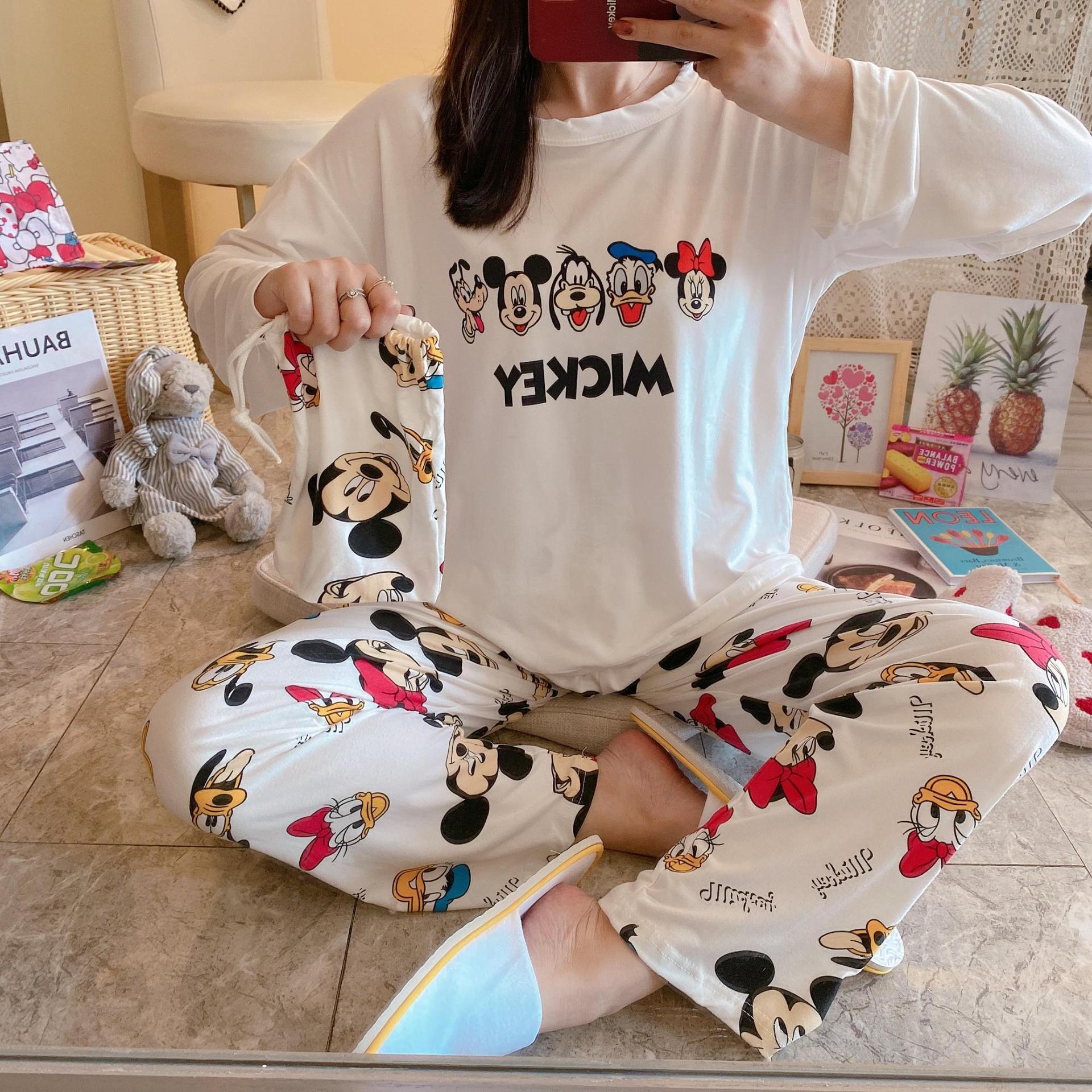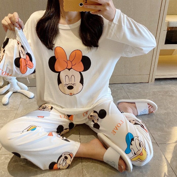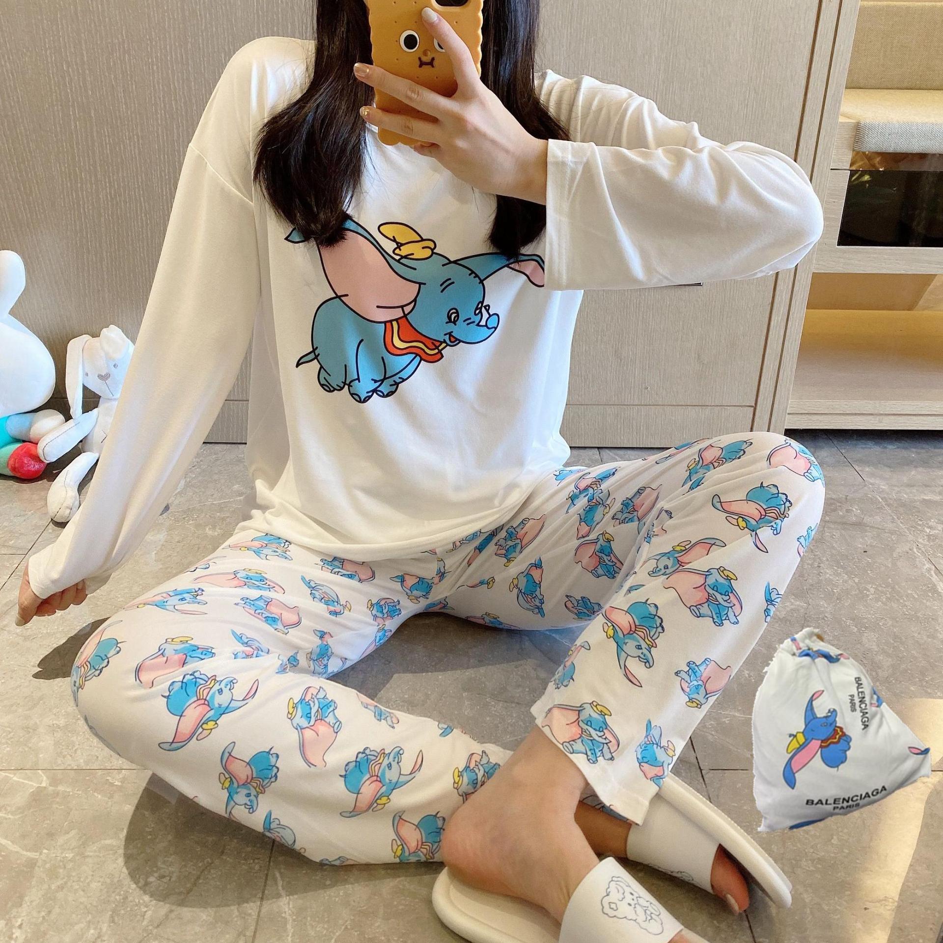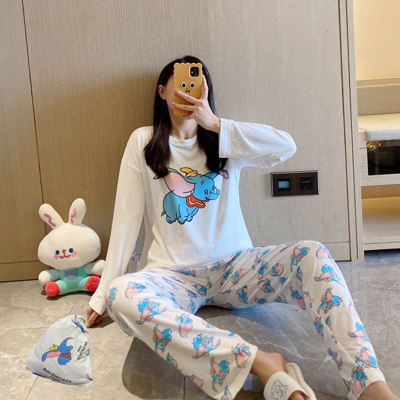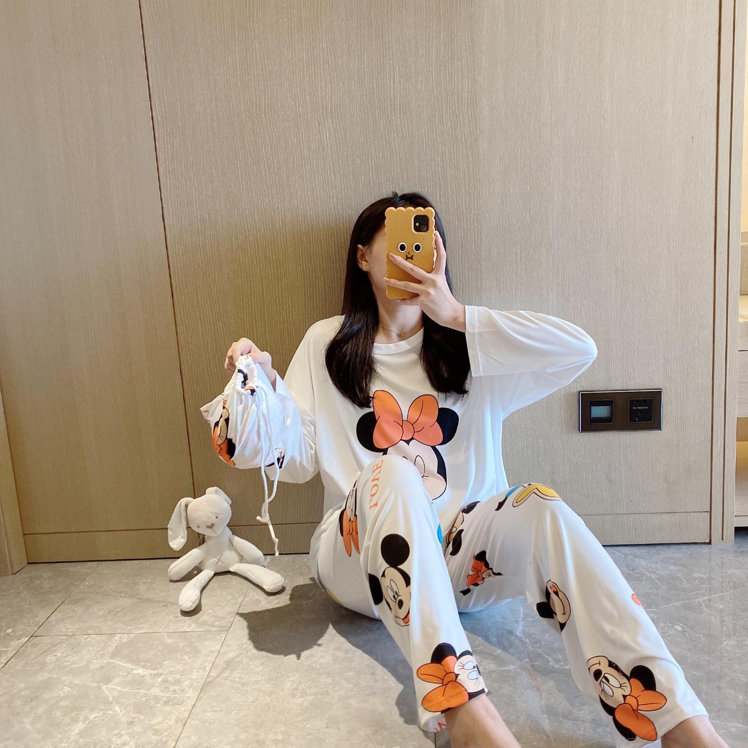 새로운 봄과 가을 잠옷 여자의 캐주얼 만화 귀여운 느슨한 긴 소매 가정 옷 세트 보관 가방