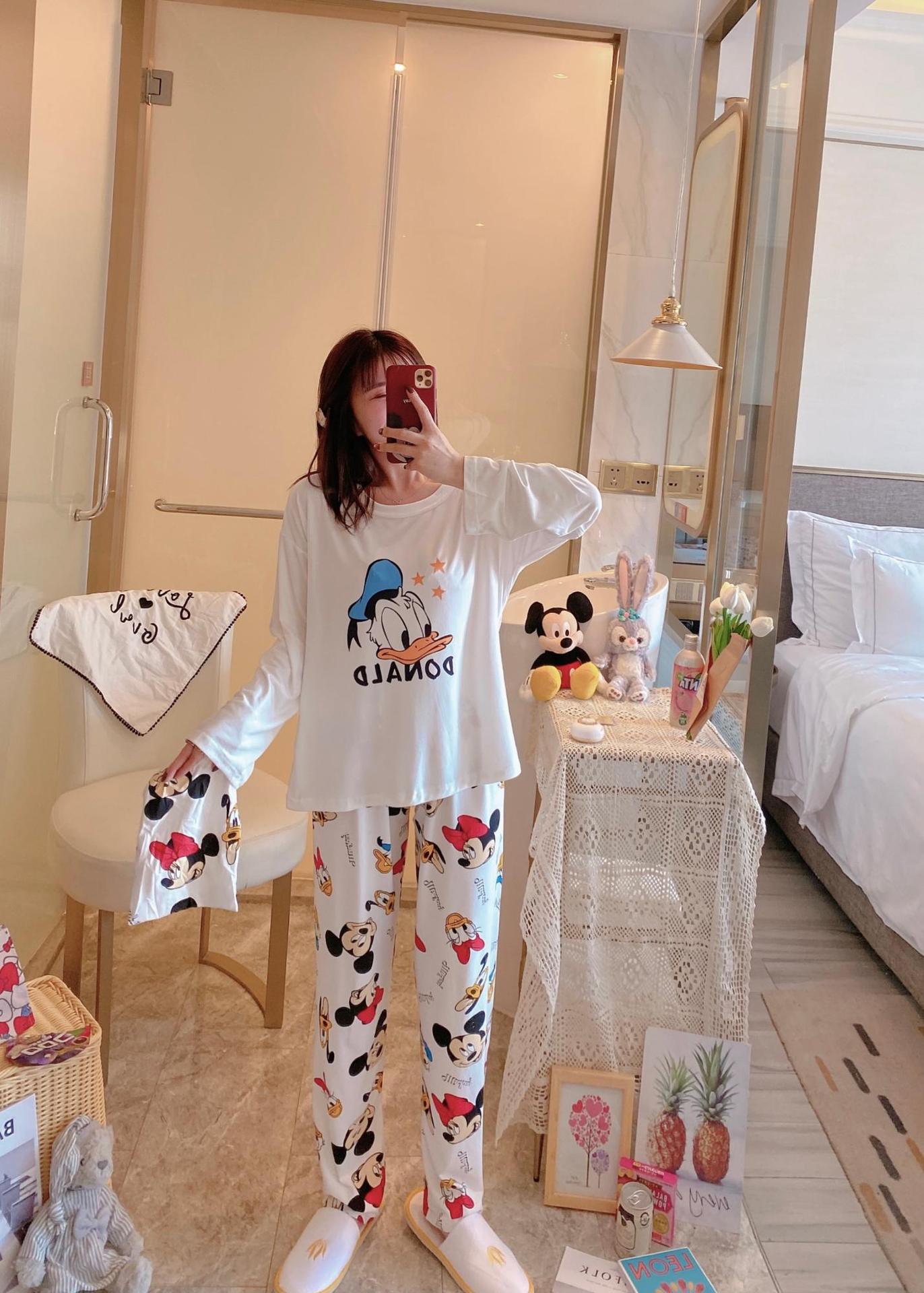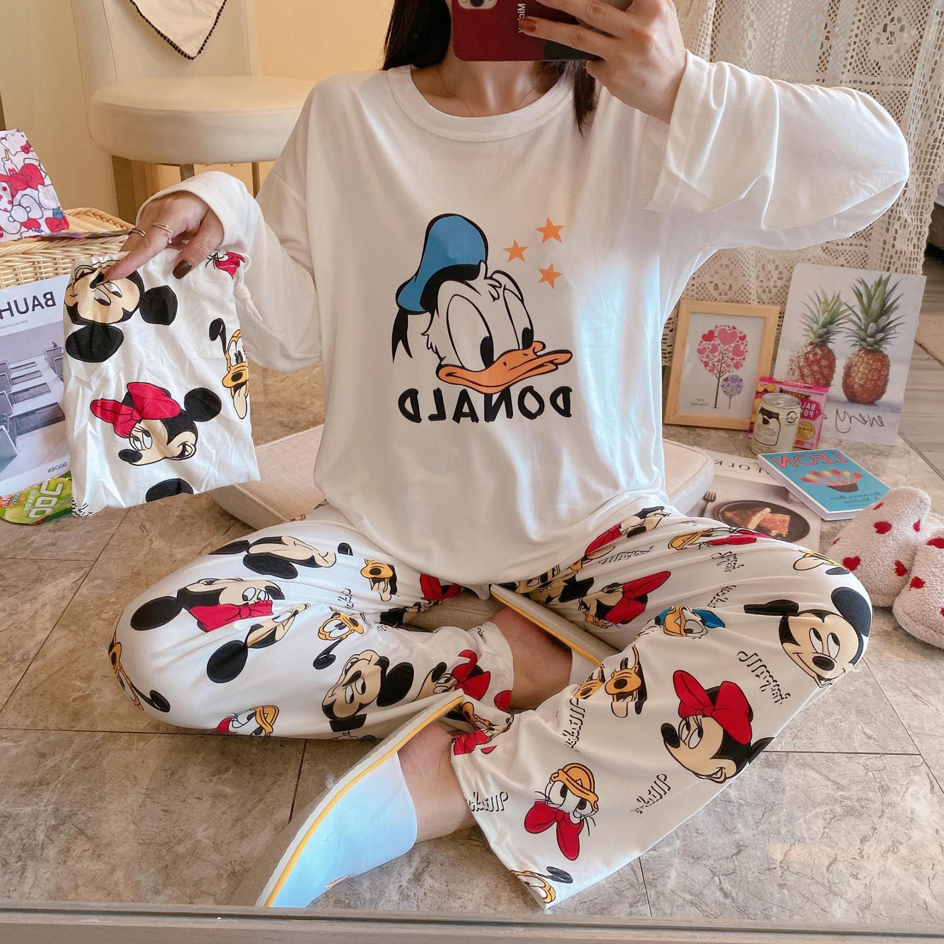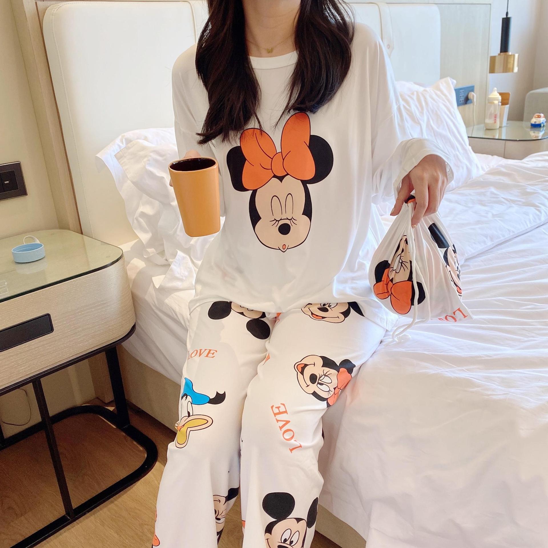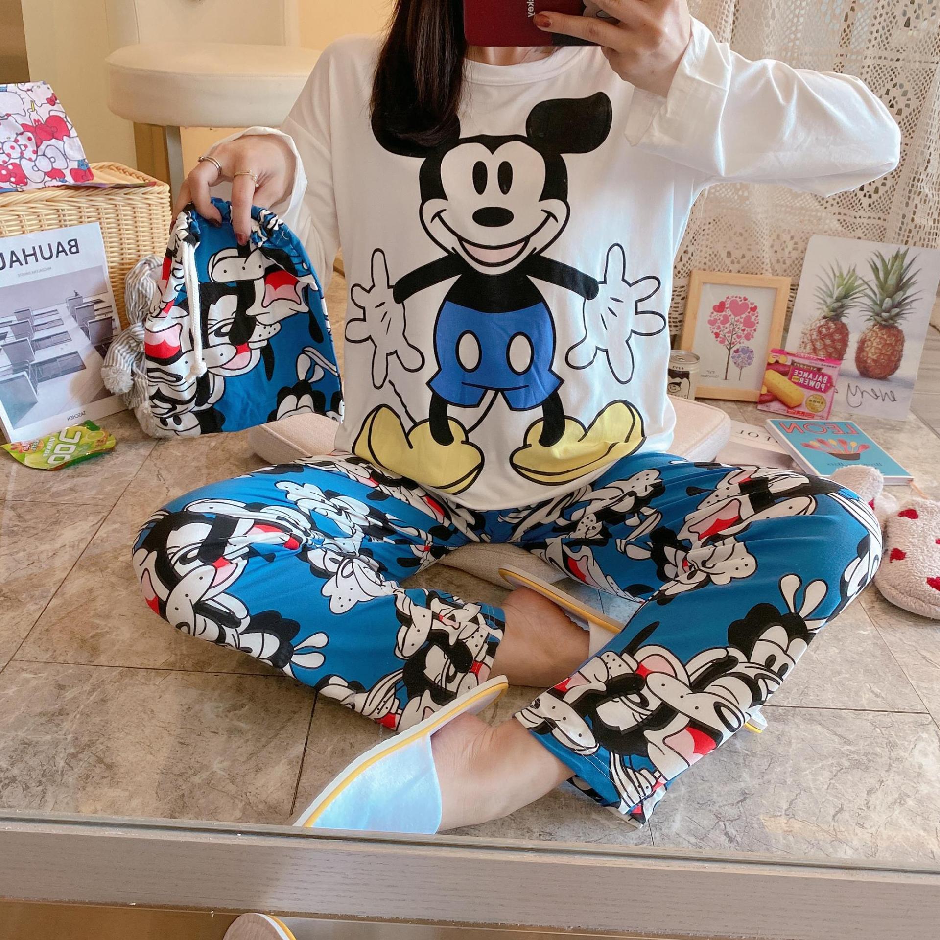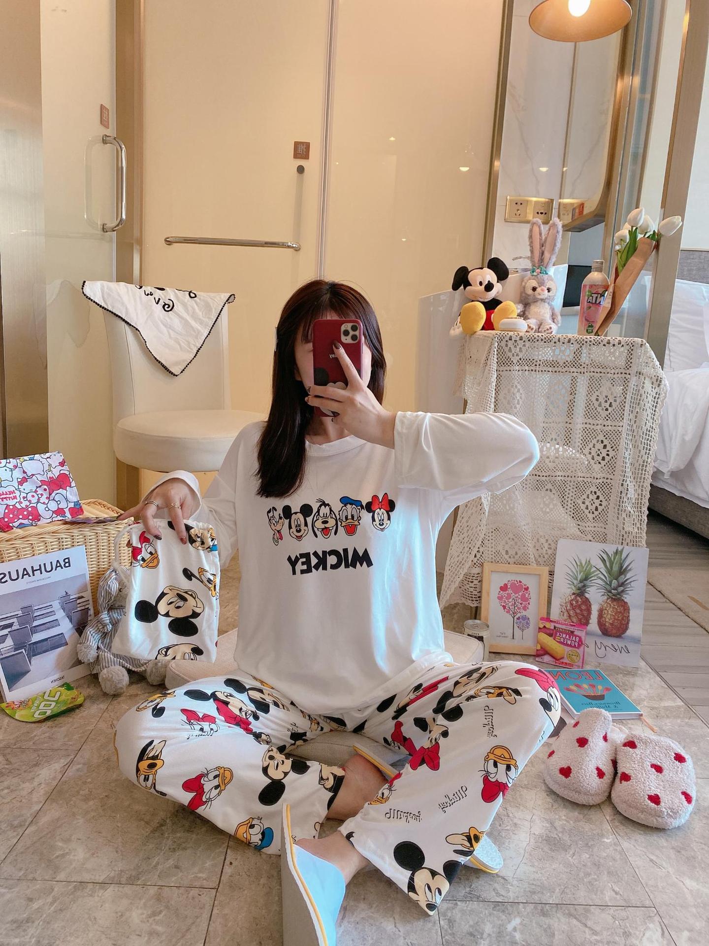 새로운 봄과 가을 잠옷 여자의 캐주얼 만화 귀여운 느슨한 긴 소매 가정 옷 세트 보관 가방