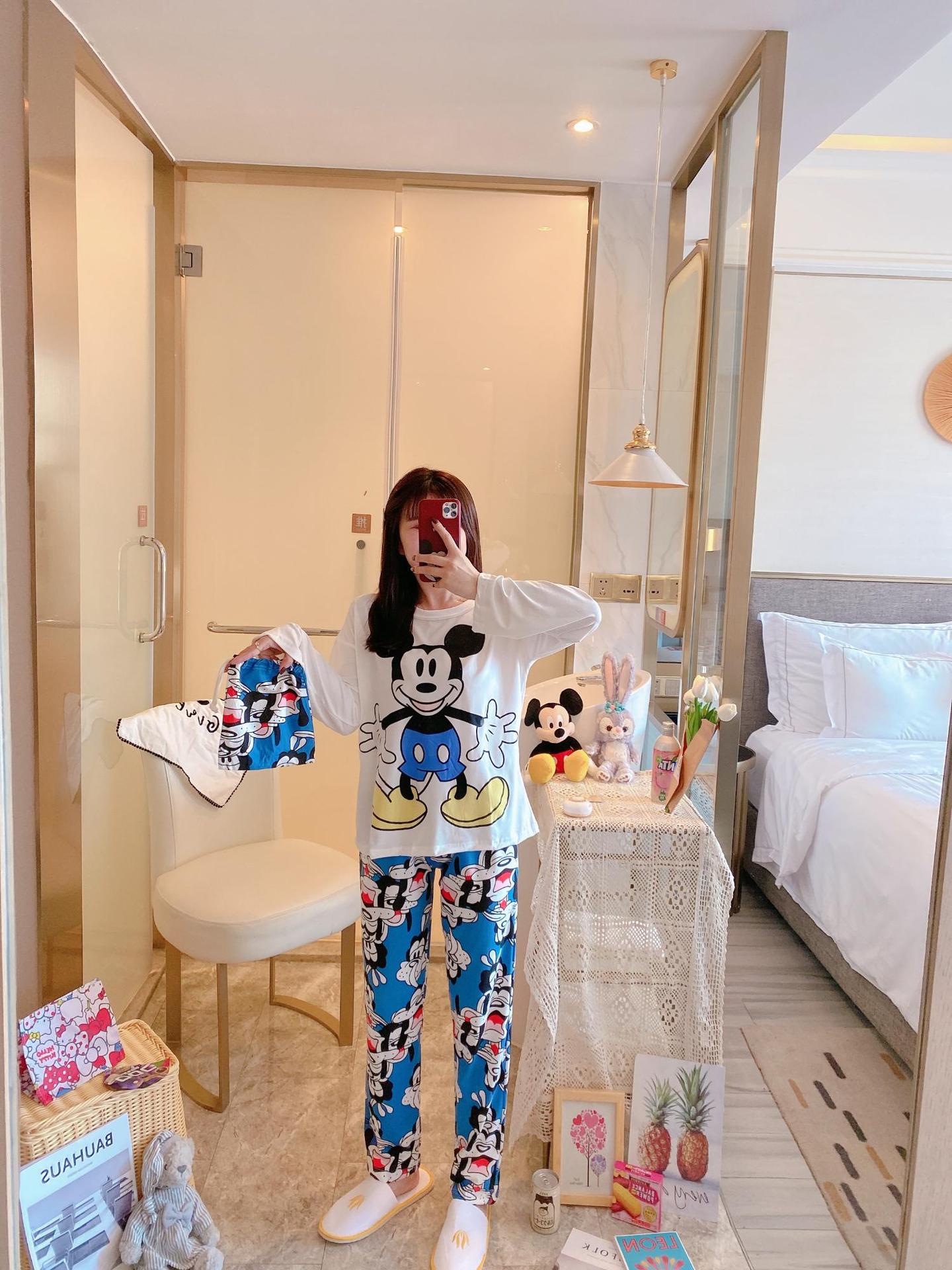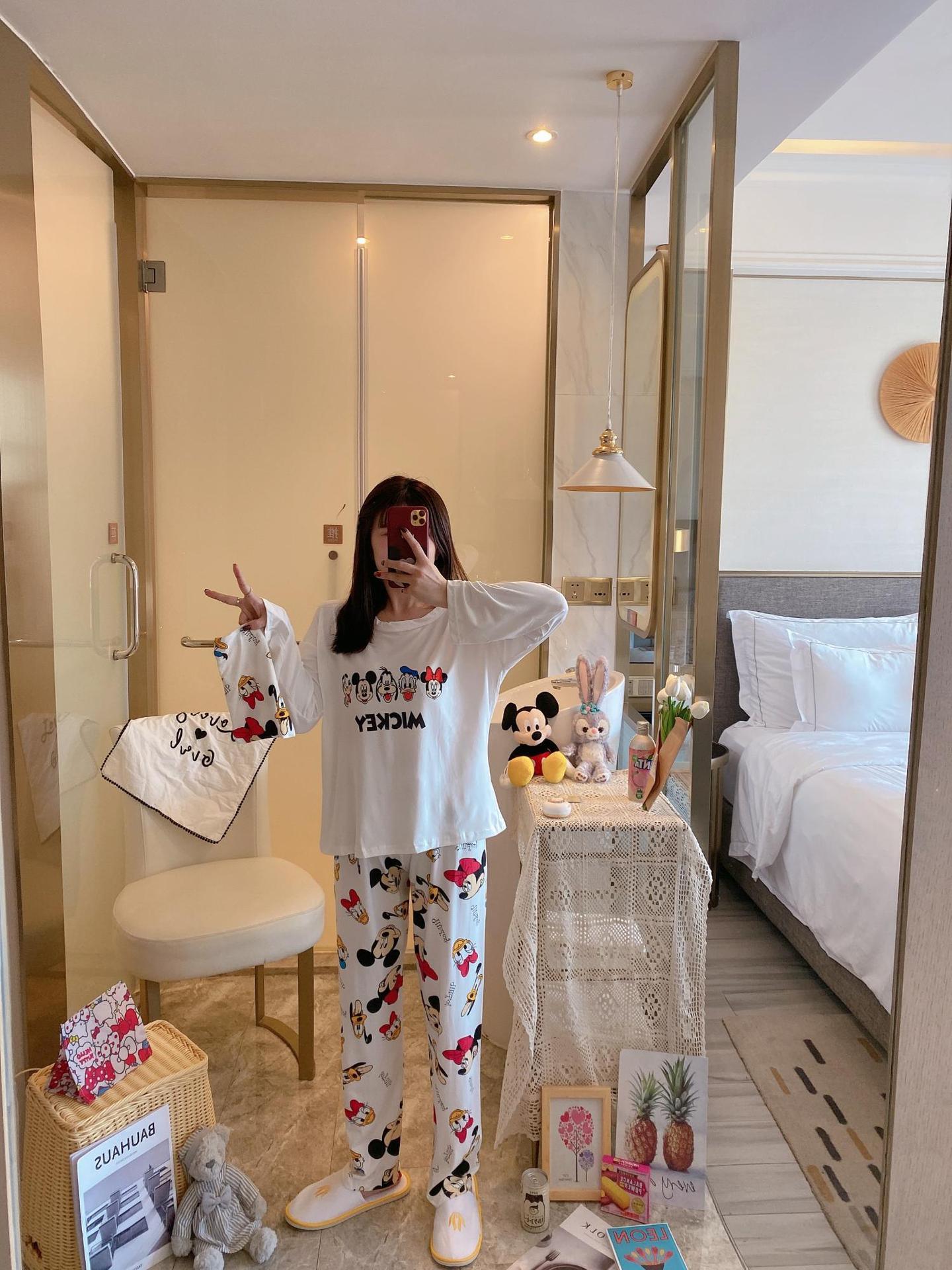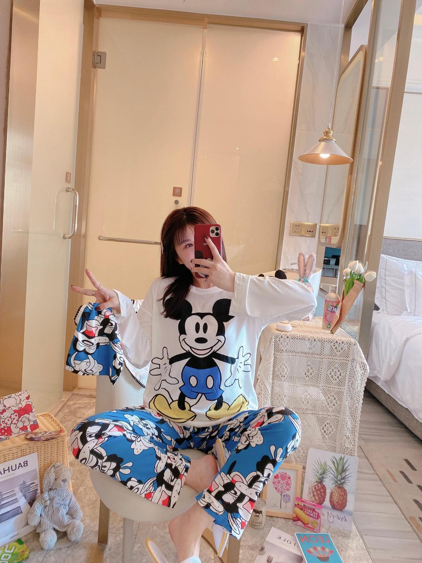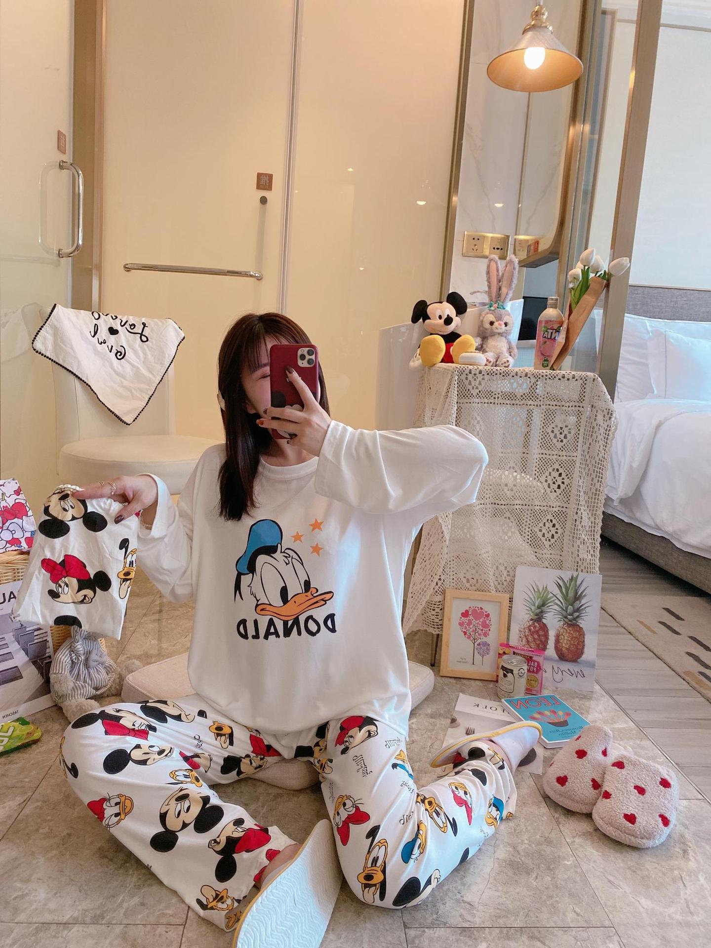 새로운 봄과 가을 잠옷 여자의 캐주얼 만화 귀여운 느슨한 긴 소매 가정 옷 세트 보관 가방