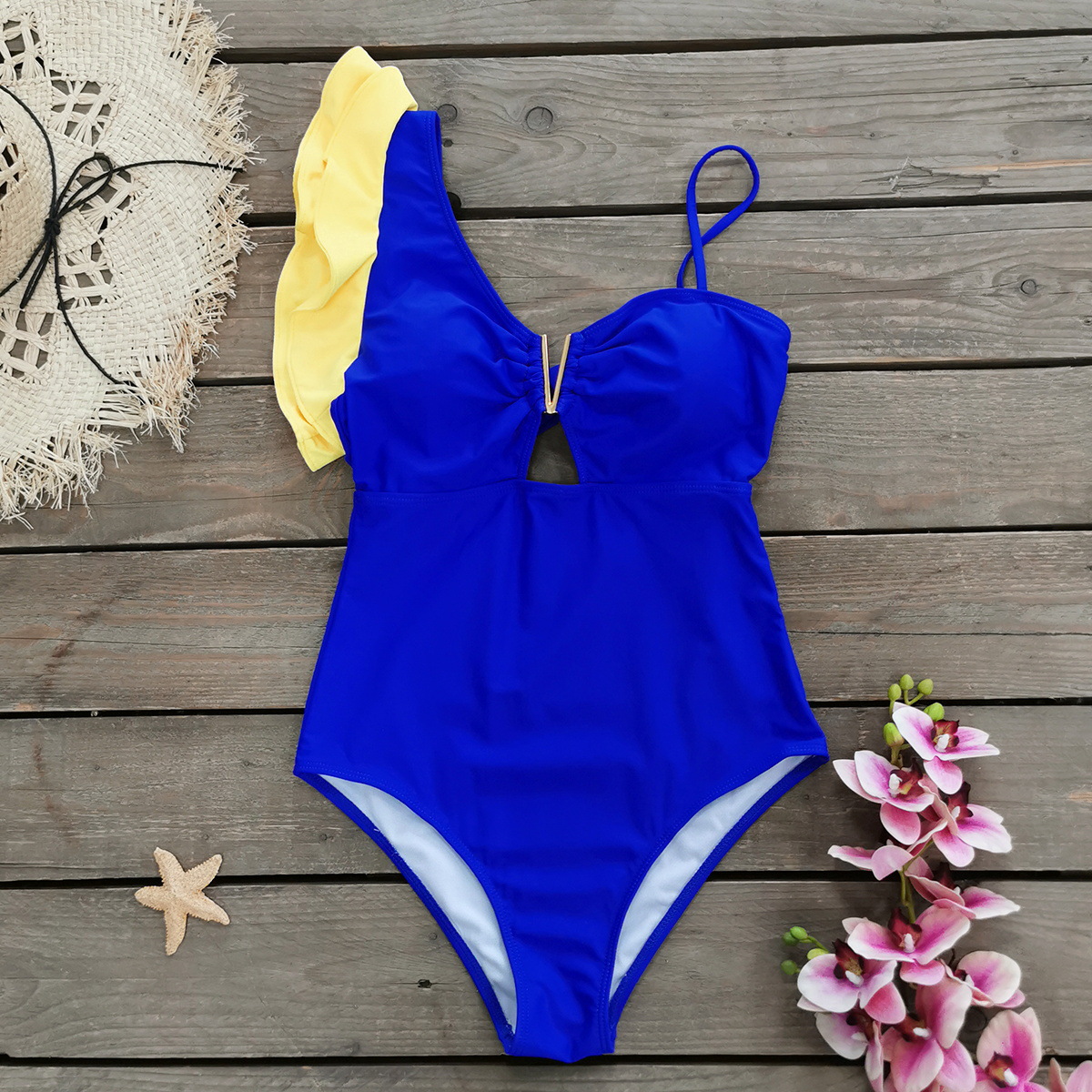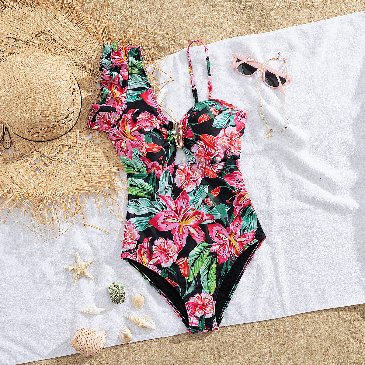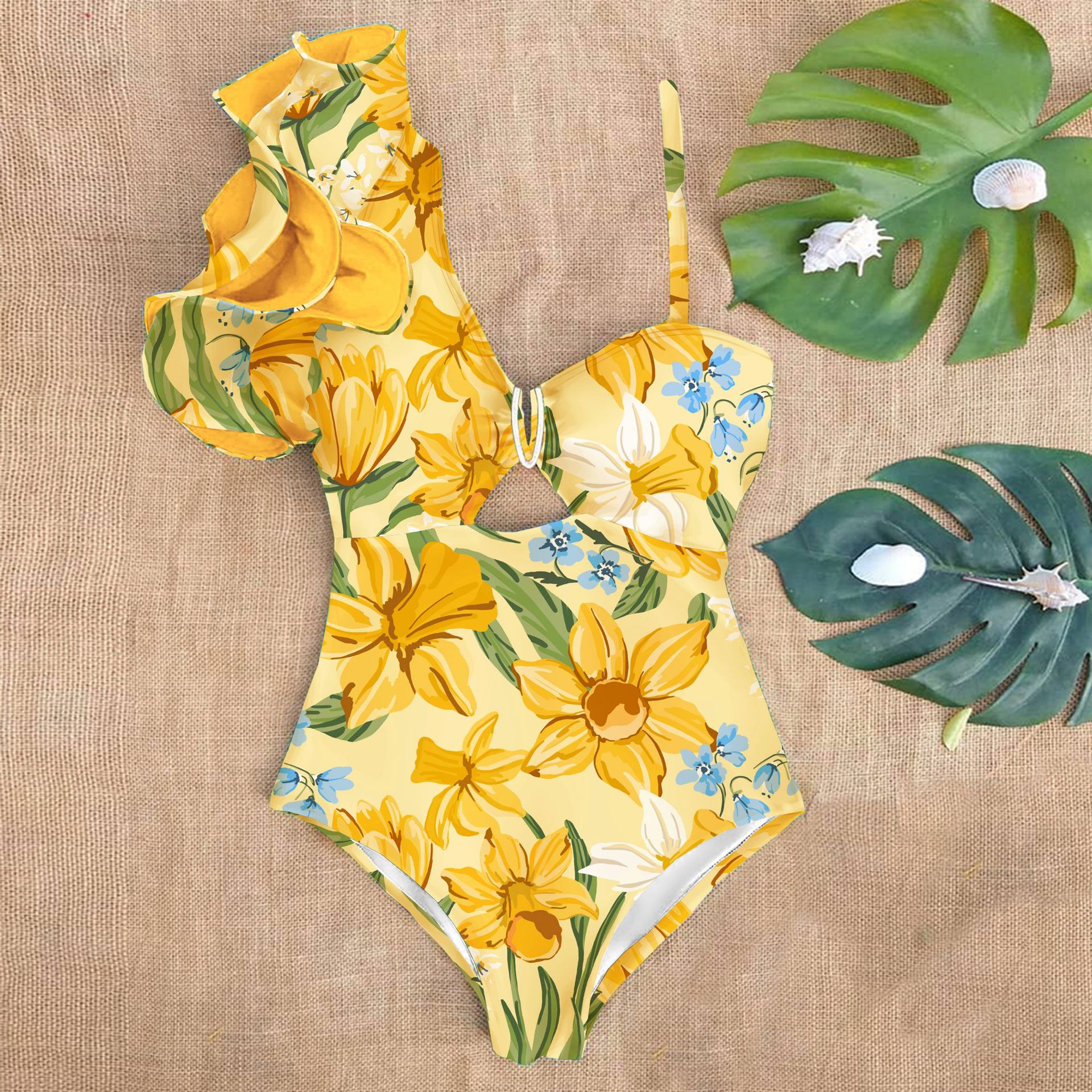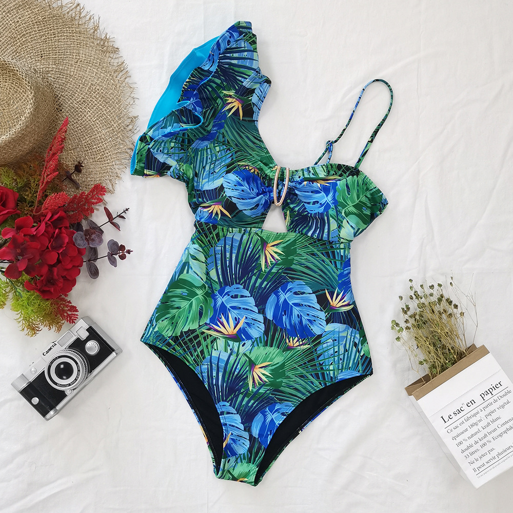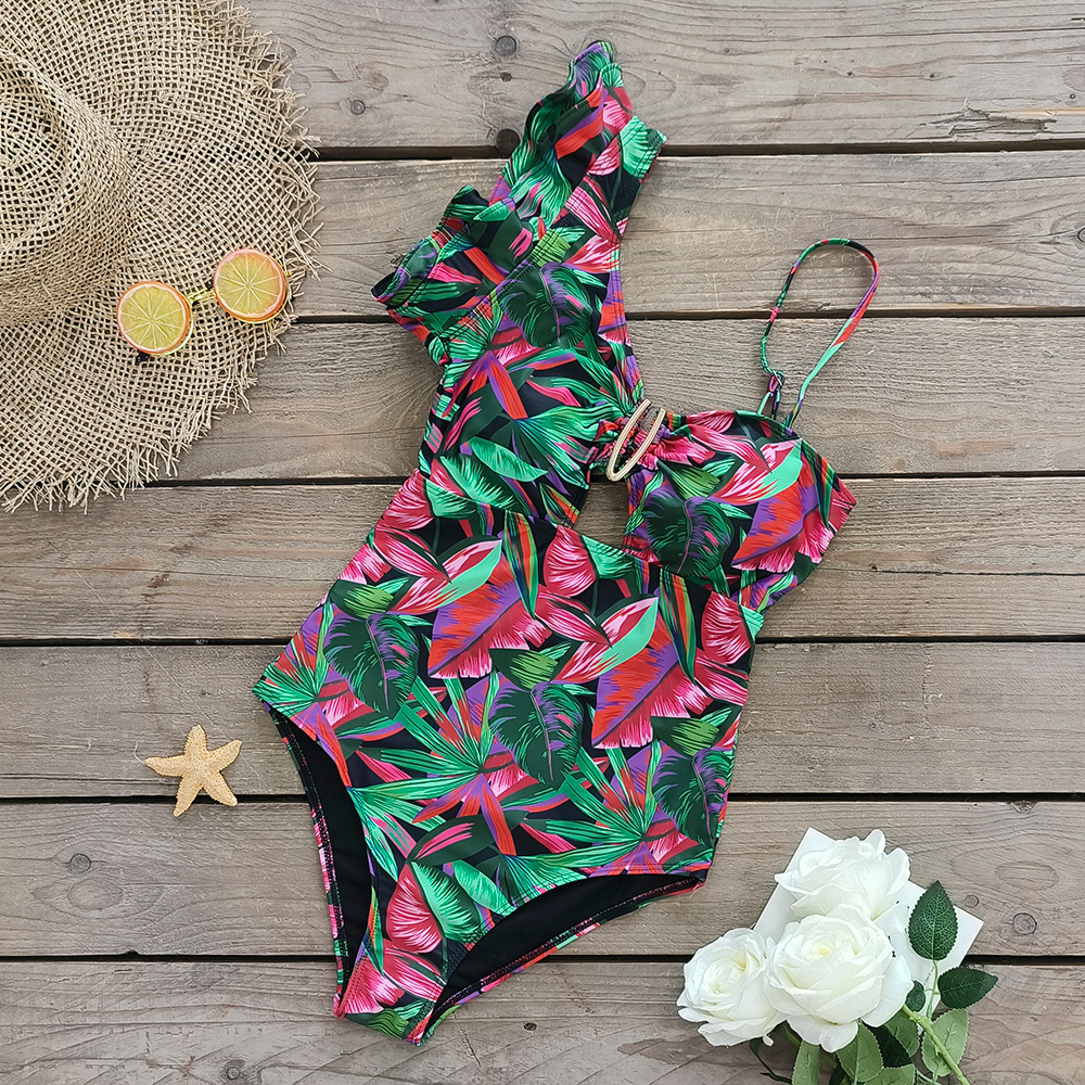 원 숄더 타이트 러플 원피스 수영복 여성 할로우 유럽 및 미국 크로스 보더 수영복 백리스 섹시 프린트 2025 새로운 스타일