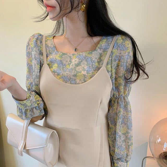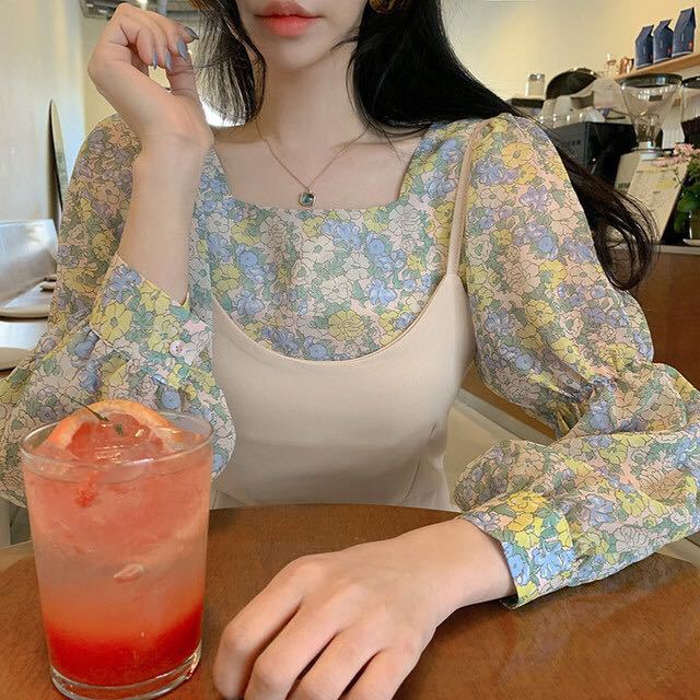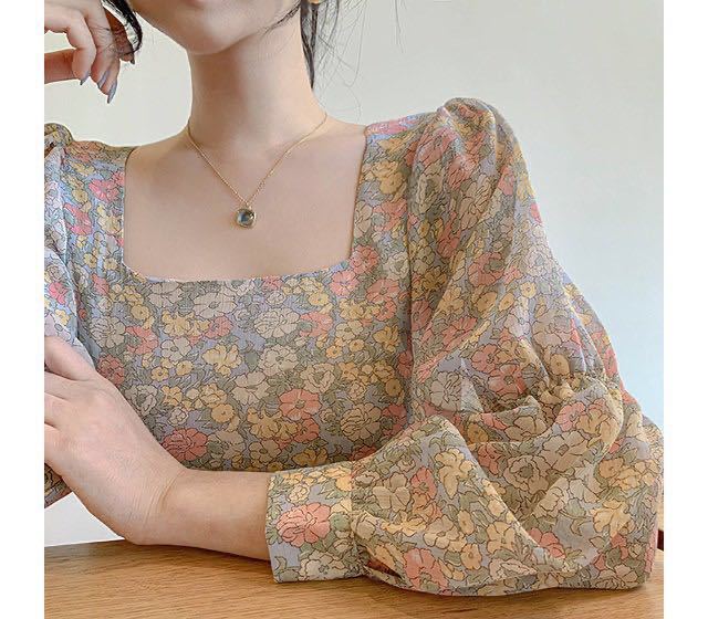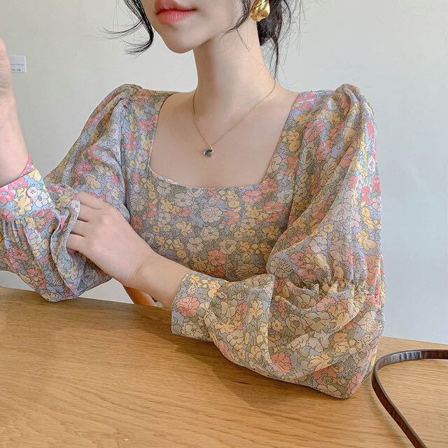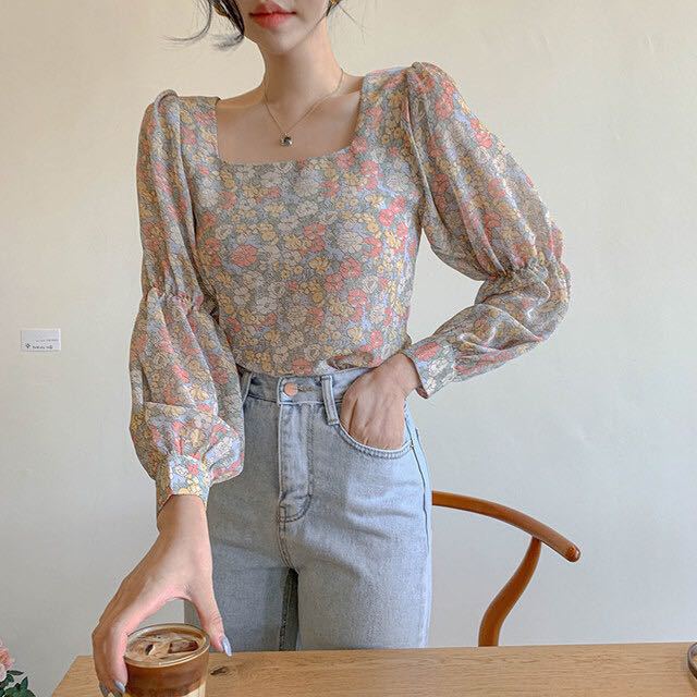 한국 세련된 부드러운 달콤한 작은 꽃 슬림 스퀘어 칼라 리키 콜라본 느슨한 올매치 랜턴 슬리브 톱 여성