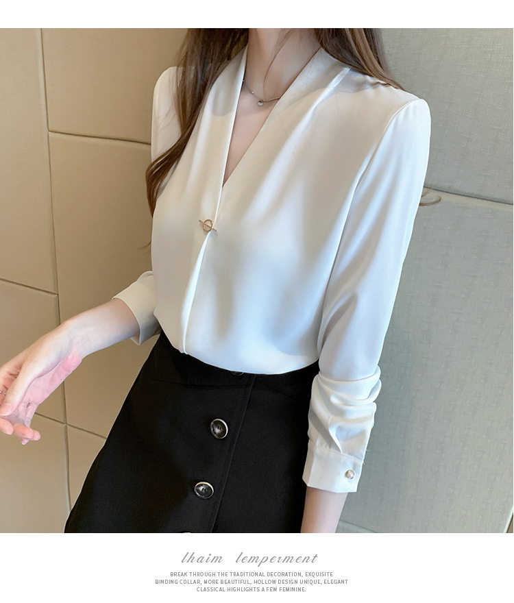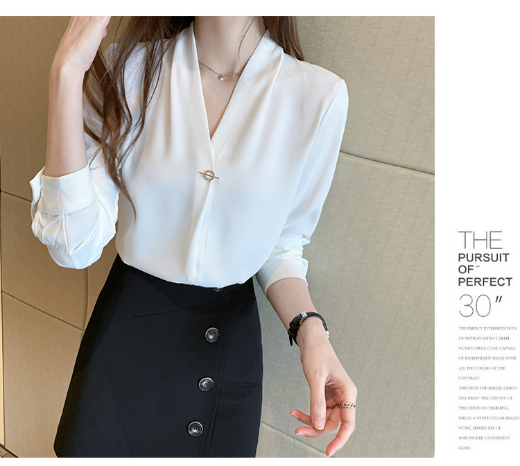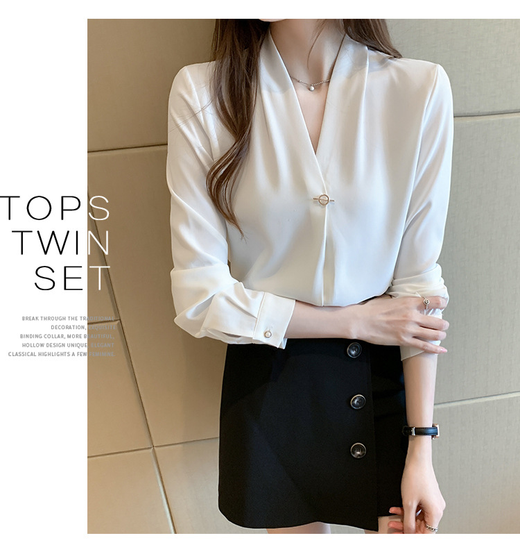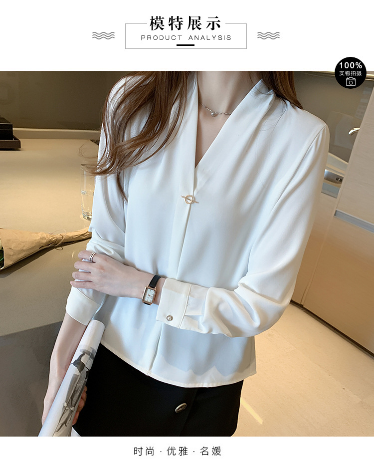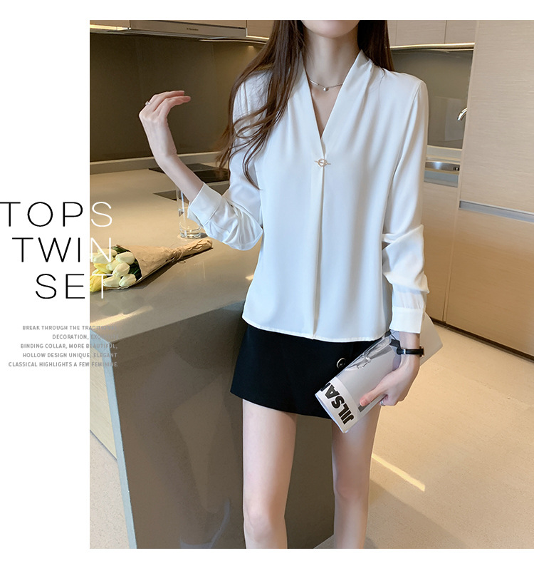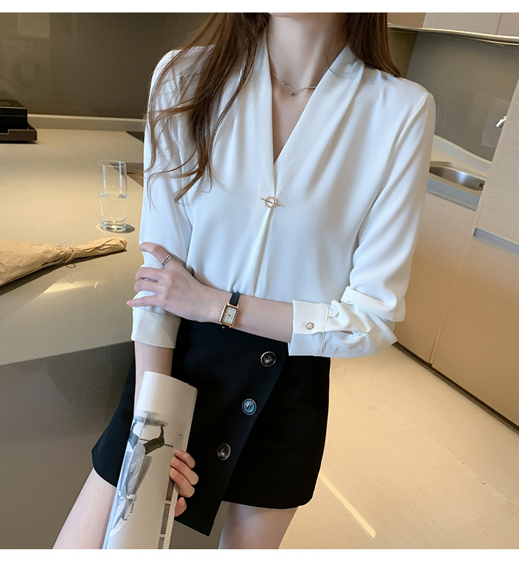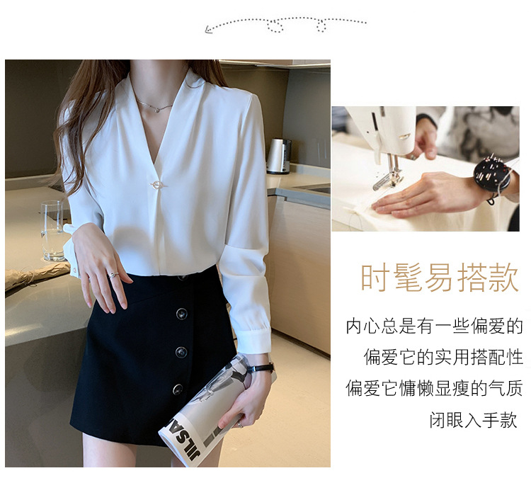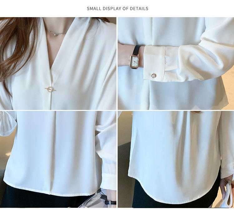 2025 봄 신상 V넥 쉬폰 화이트 셔츠, 초가을 상의, 가볍고 성숙한 디자인, 라운드넥, 레트로, 명사 스타일, 가볍고 성숙한 스타일스토어 가기