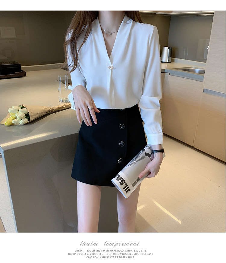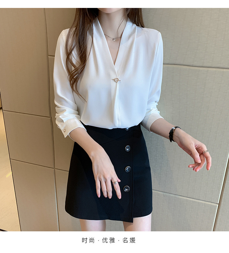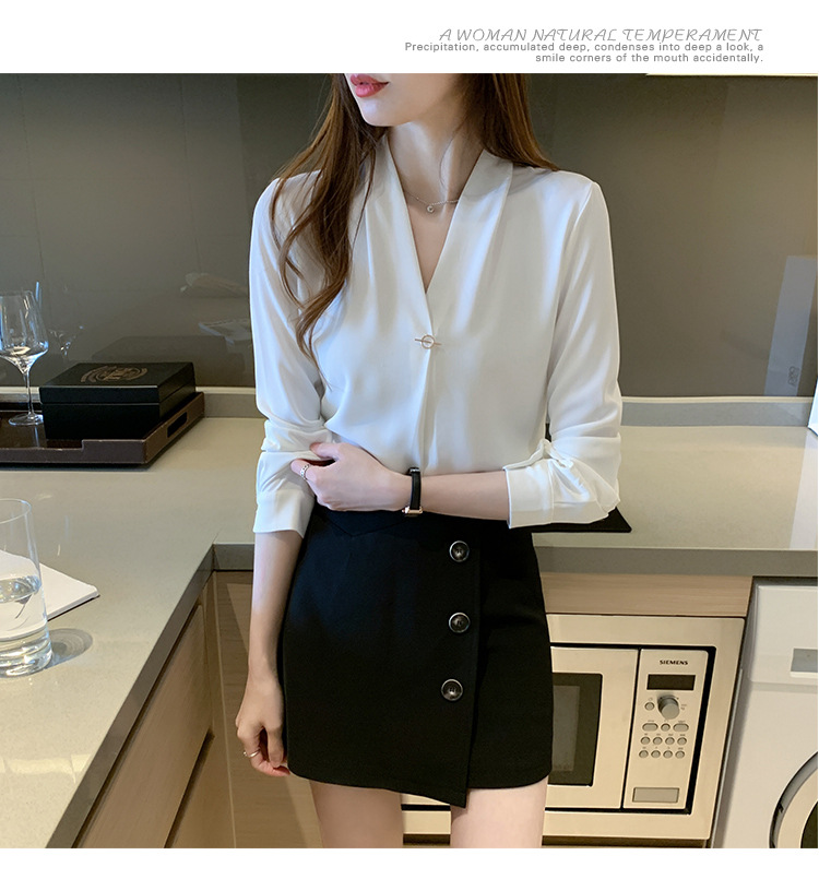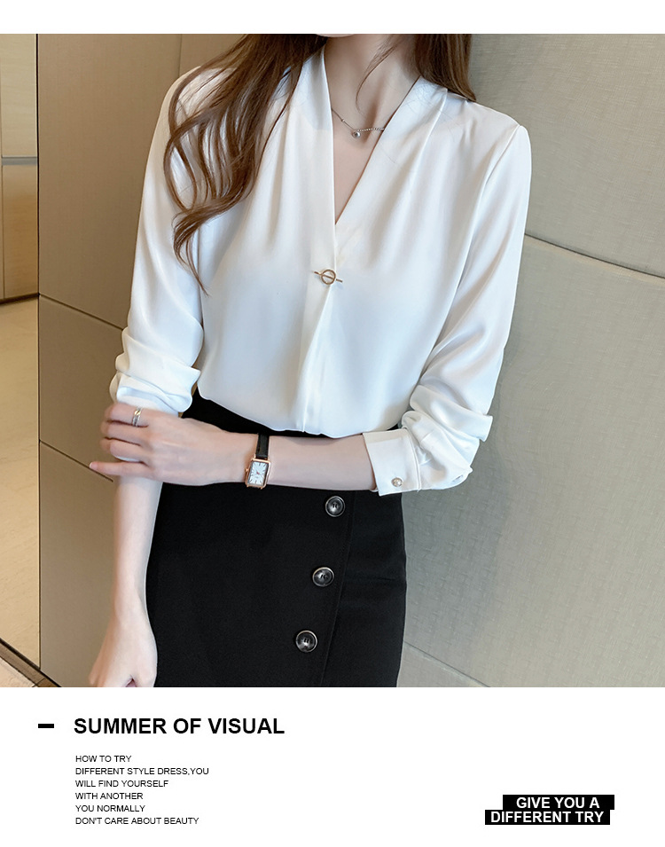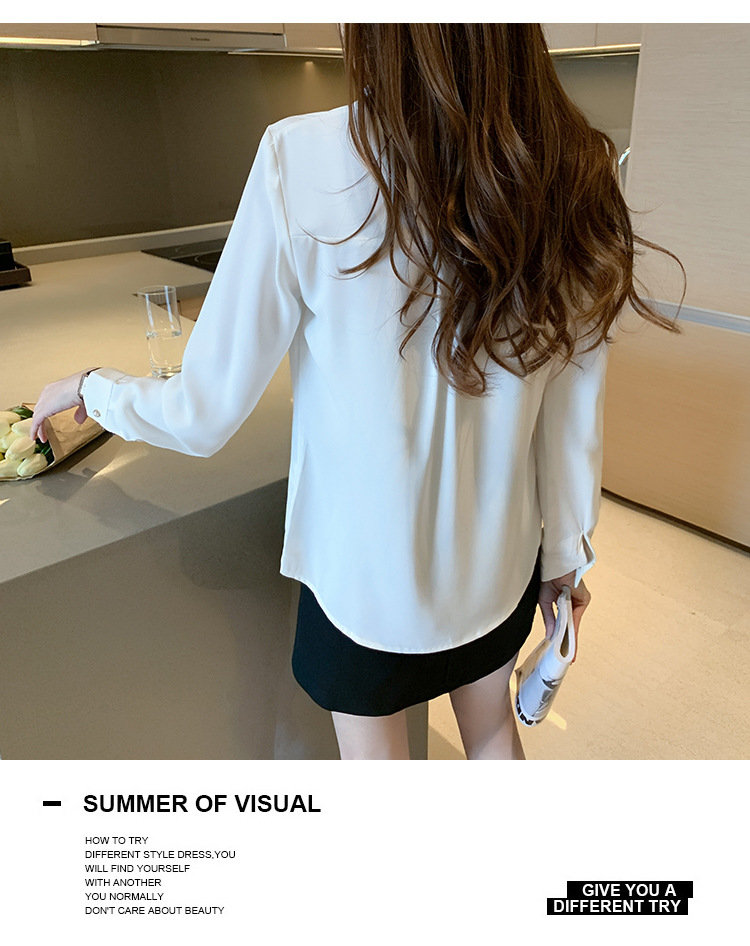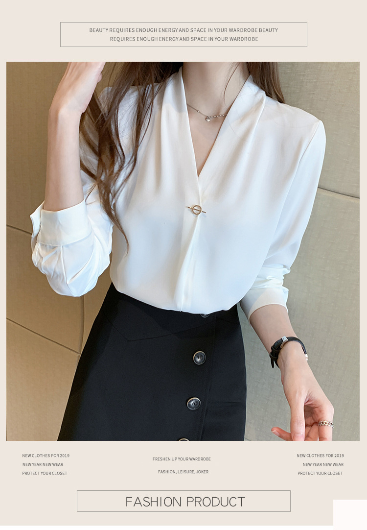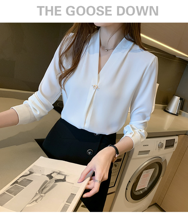 2025 봄 신상 V넥 쉬폰 화이트 셔츠, 초가을 상의, 가볍고 성숙한 디자인, 라운드넥, 레트로, 명사 스타일, 가볍고 성숙한 스타일스토어 가기