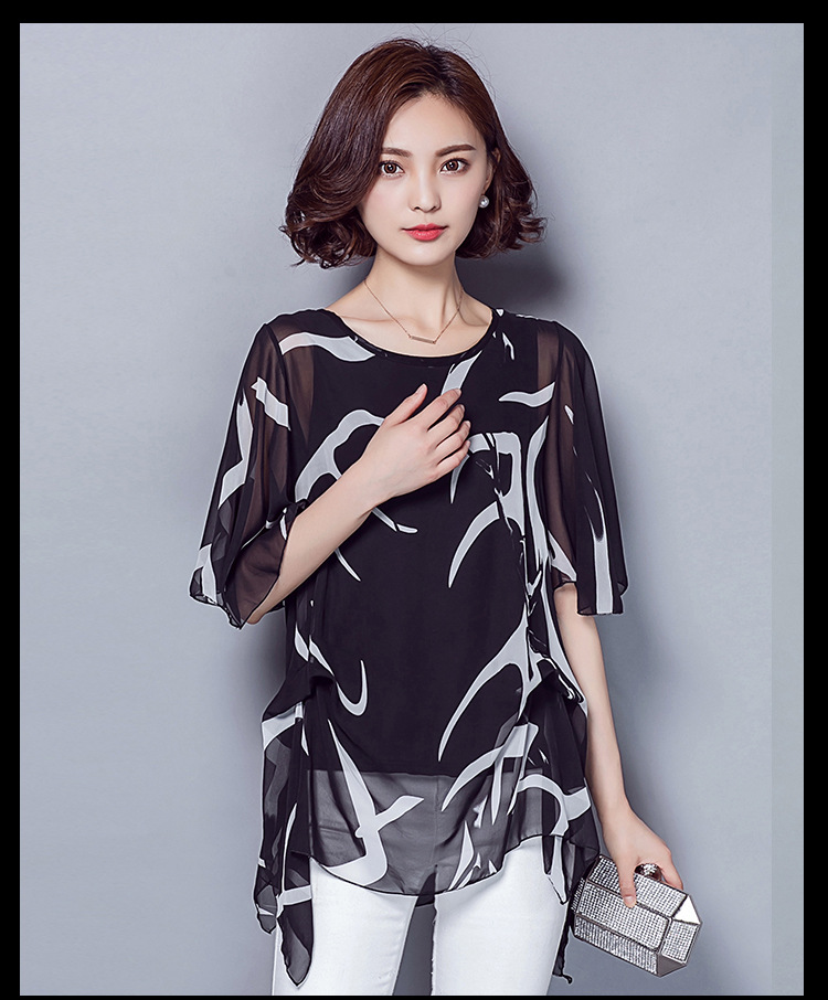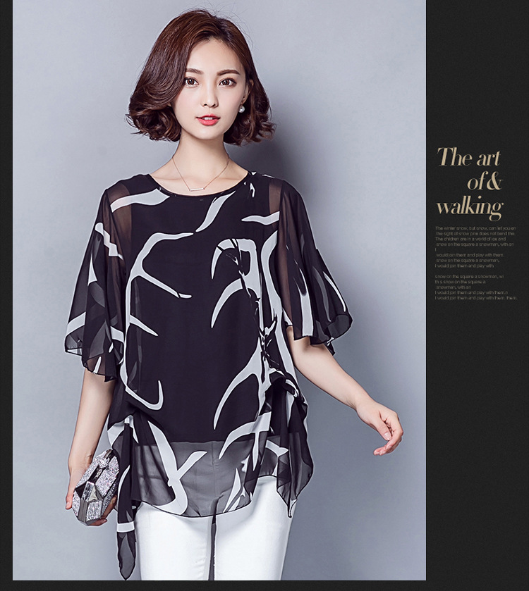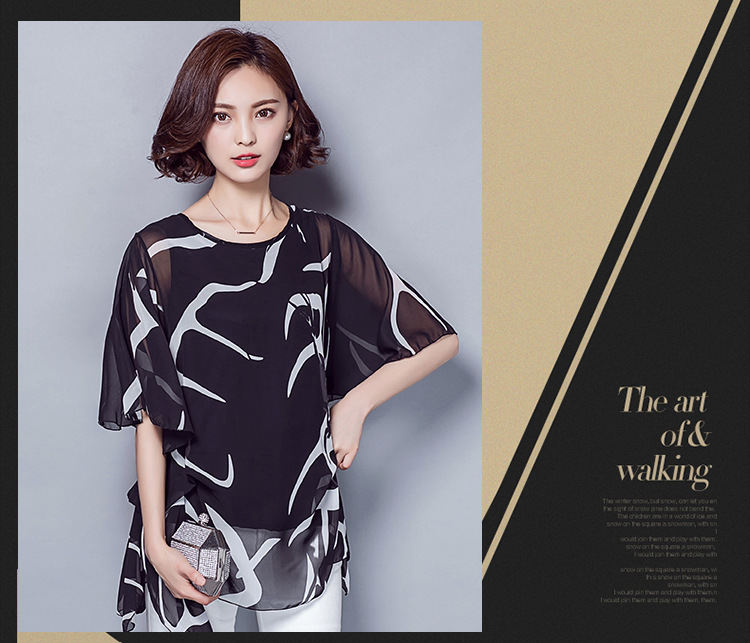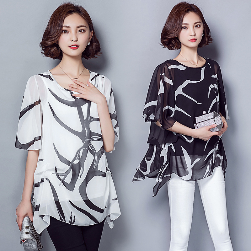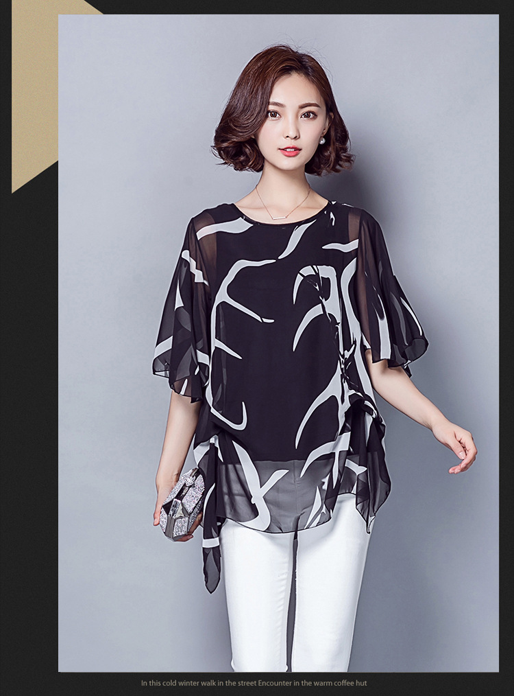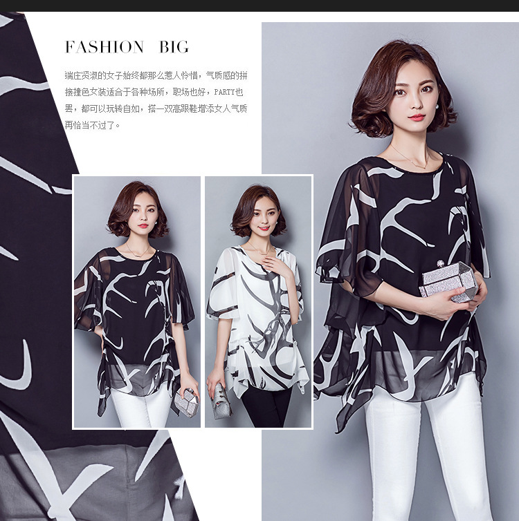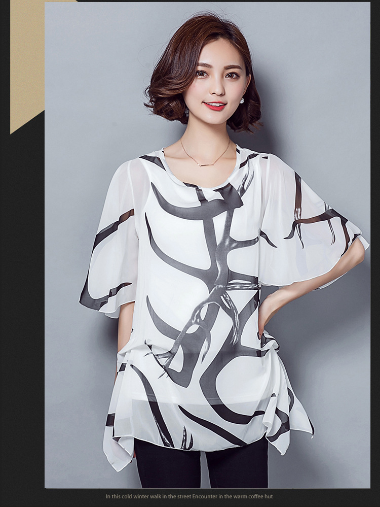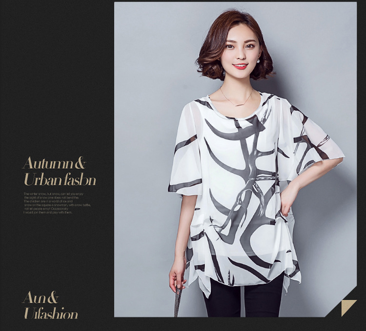 2023 봄 쉬폰 셔츠 플러스 사이즈 가짜 투피스 프린트 반팔 중간 길이 느슨한 혼 소매 탑 여성 의류스토어 가기