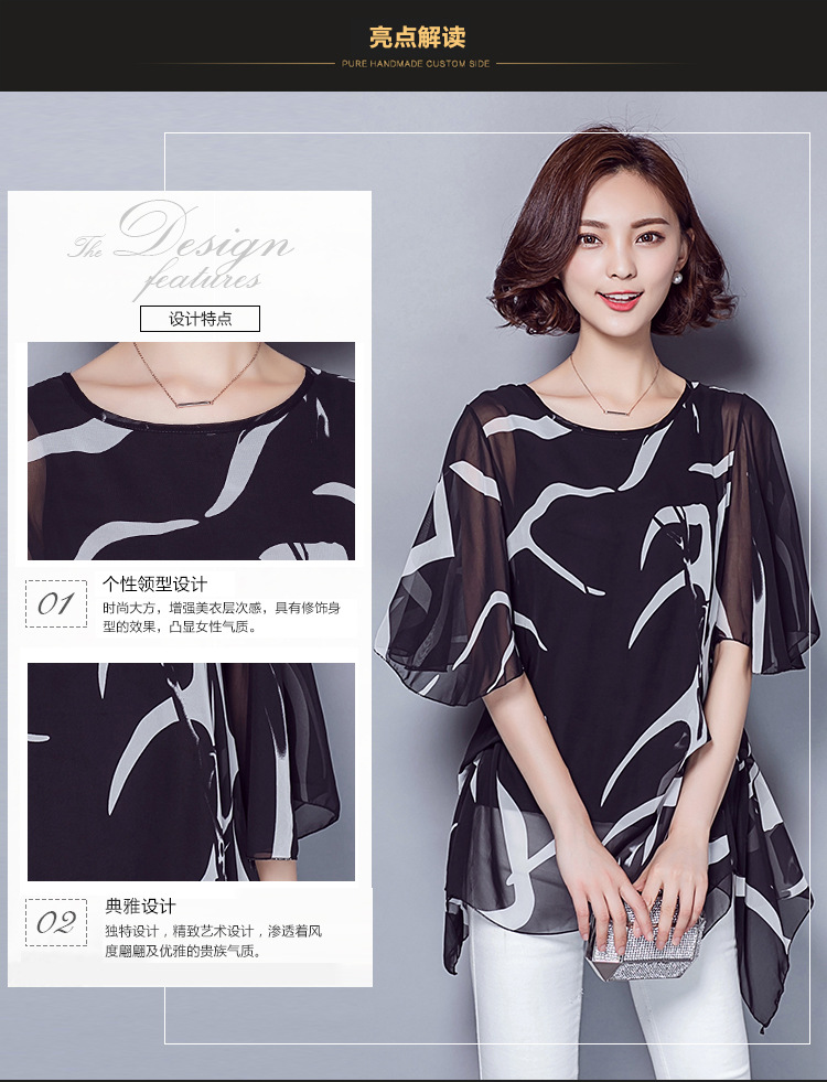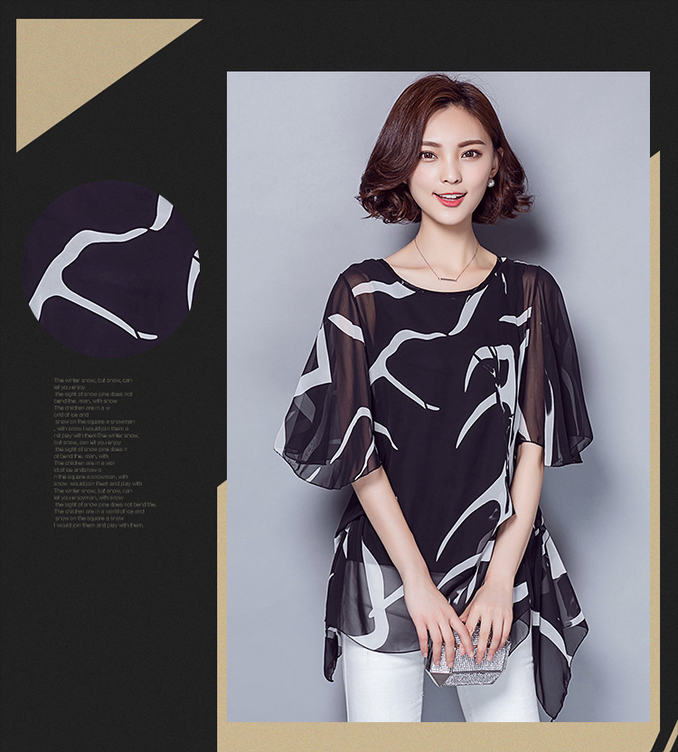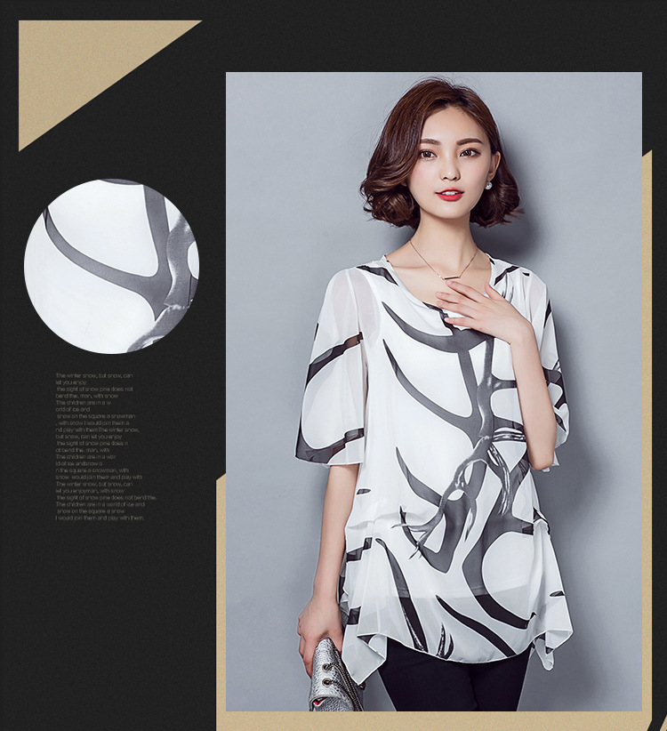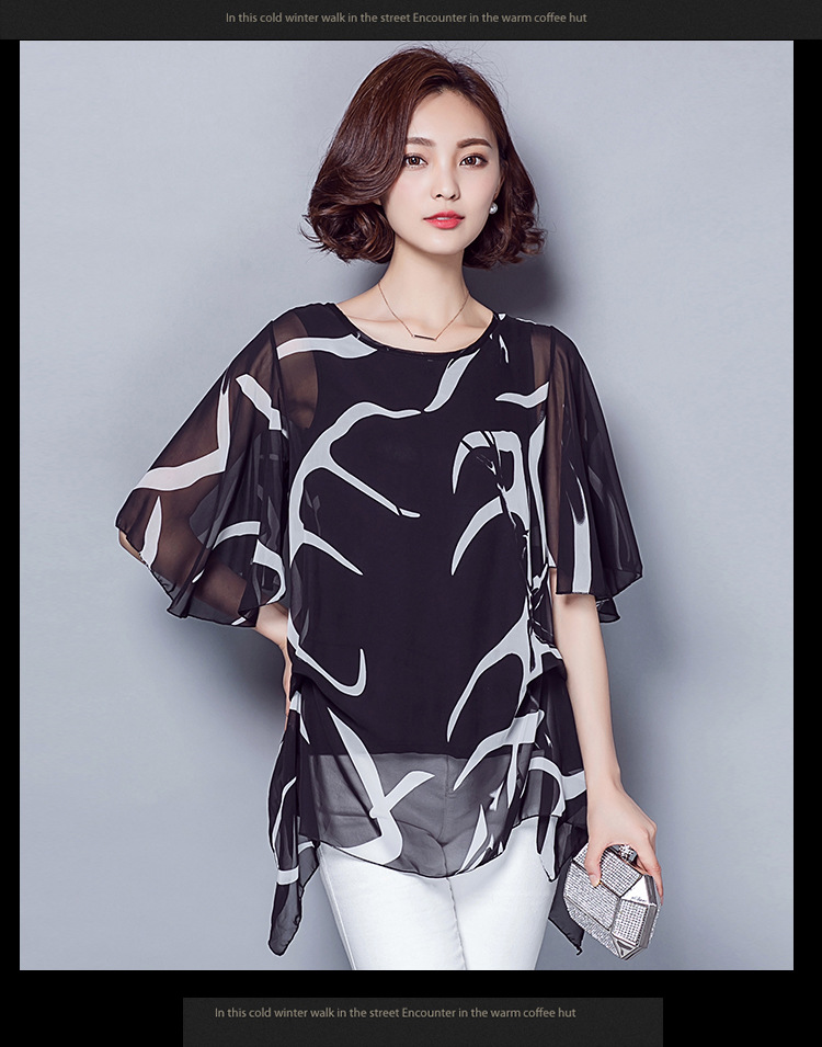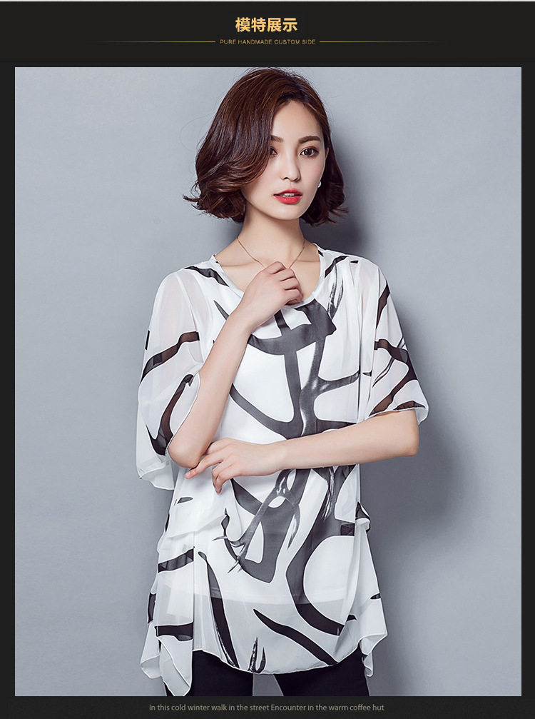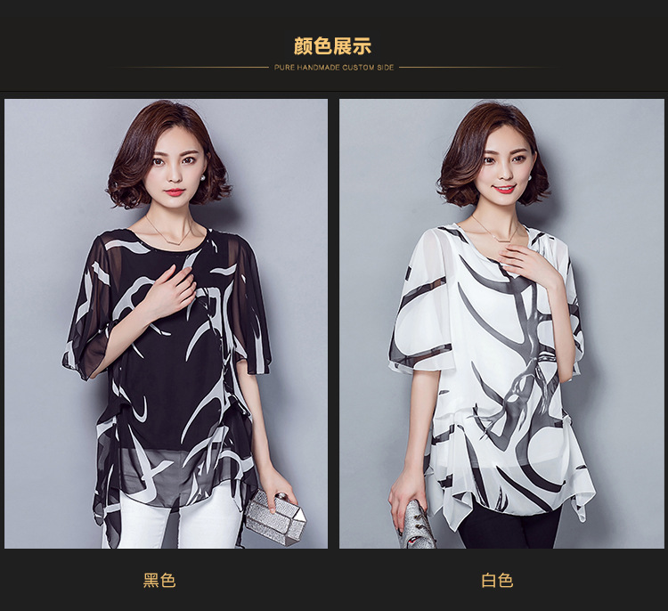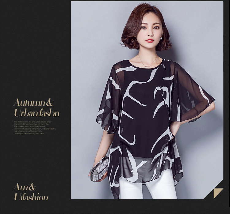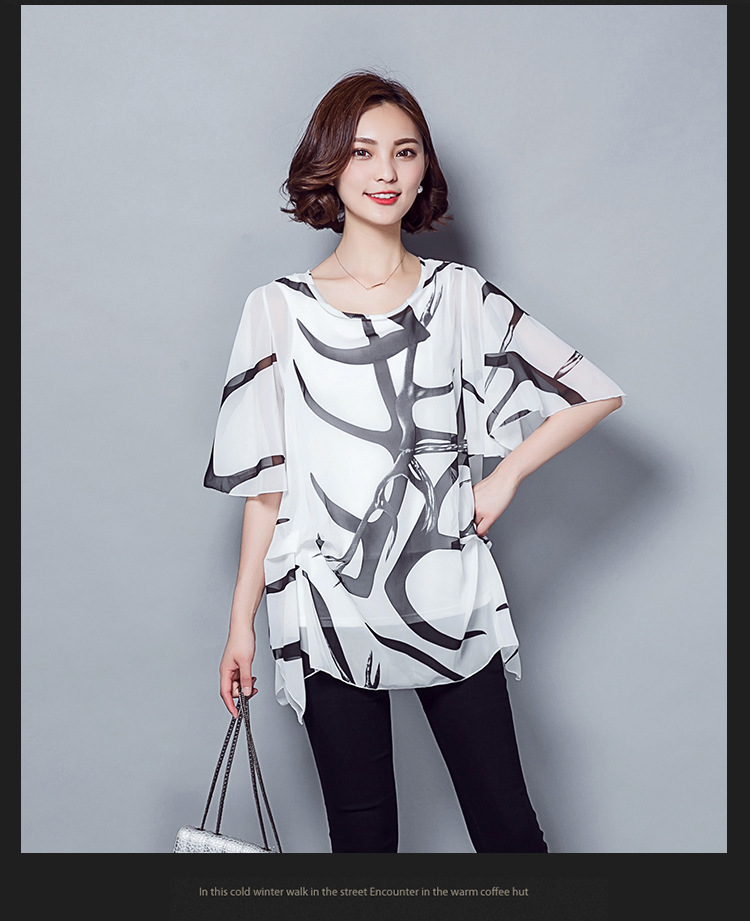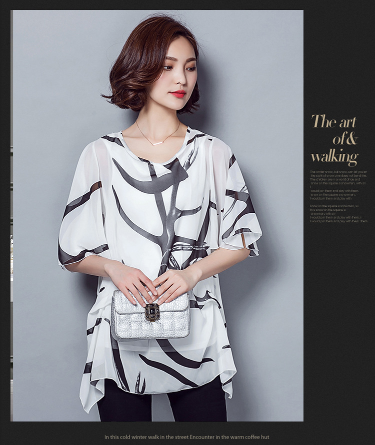 2023 봄 쉬폰 셔츠 플러스 사이즈 가짜 투피스 프린트 반팔 중간 길이 느슨한 혼 소매 탑 여성 의류스토어 가기