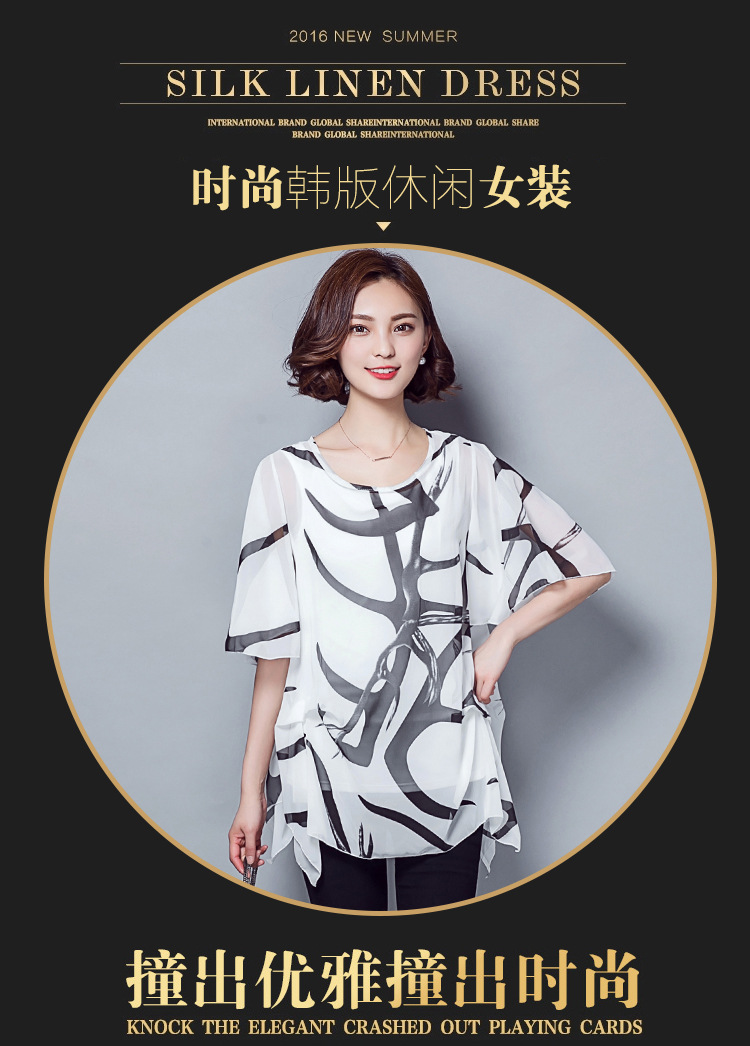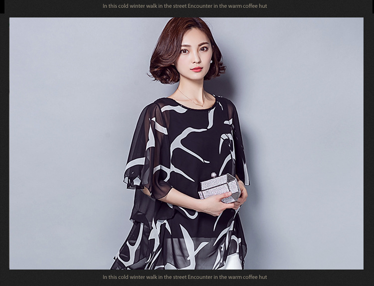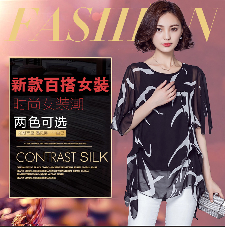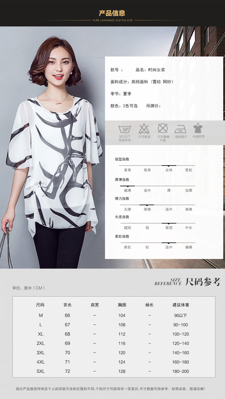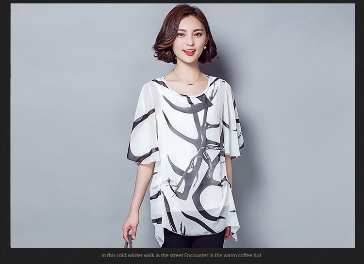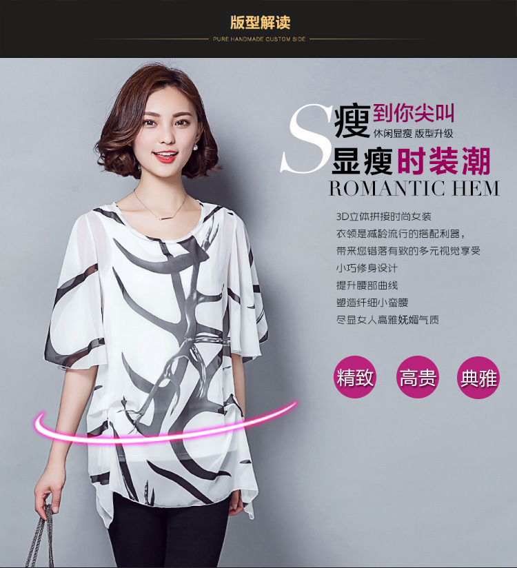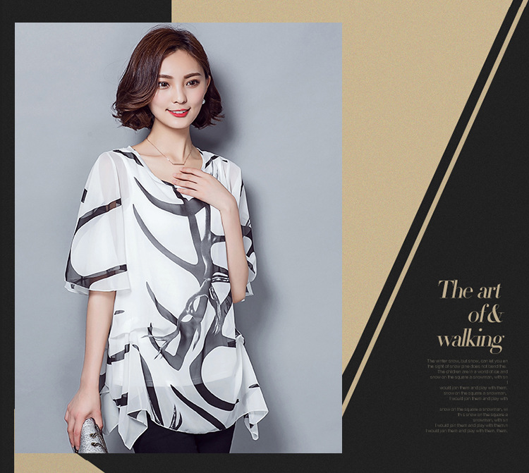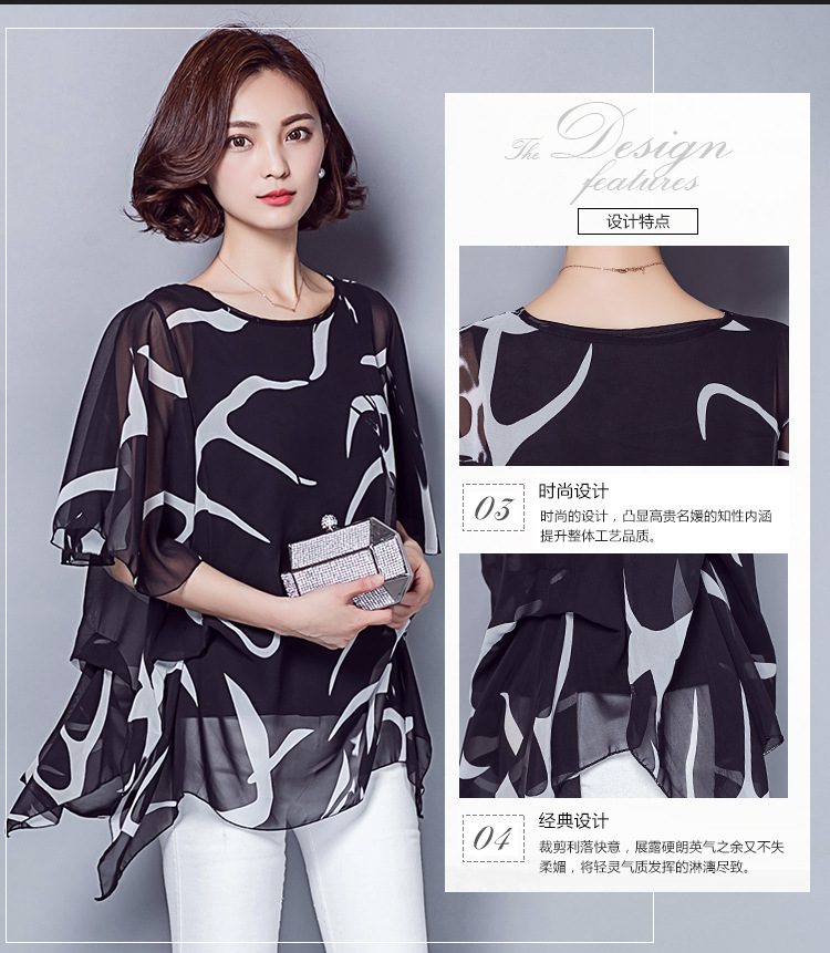 2023 봄 쉬폰 셔츠 플러스 사이즈 가짜 투피스 프린트 반팔 중간 길이 느슨한 혼 소매 탑 여성 의류스토어 가기