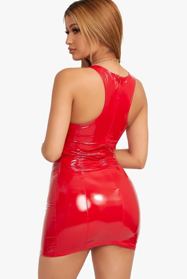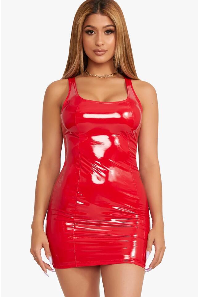 2025 컬러풀 인조가죽 드레스 지퍼 PU 고탄성 라운드넥 드레스 짧은 스커트 4방향 스트레치 가죽 스커트 힙 커버 스커트스토어 가기