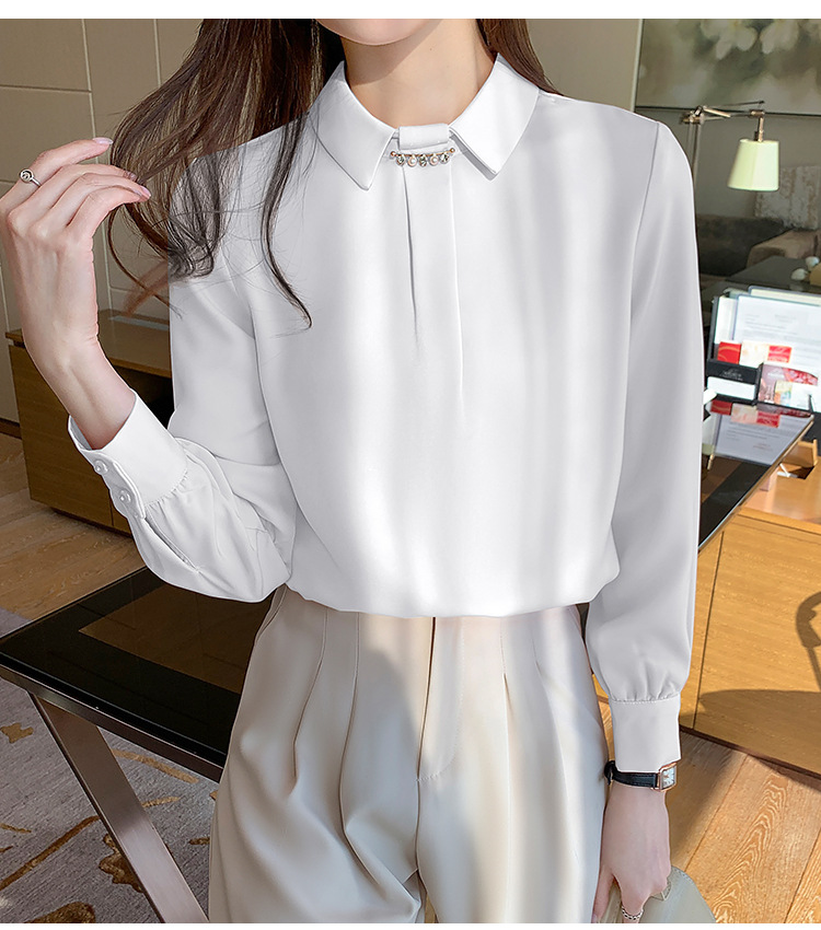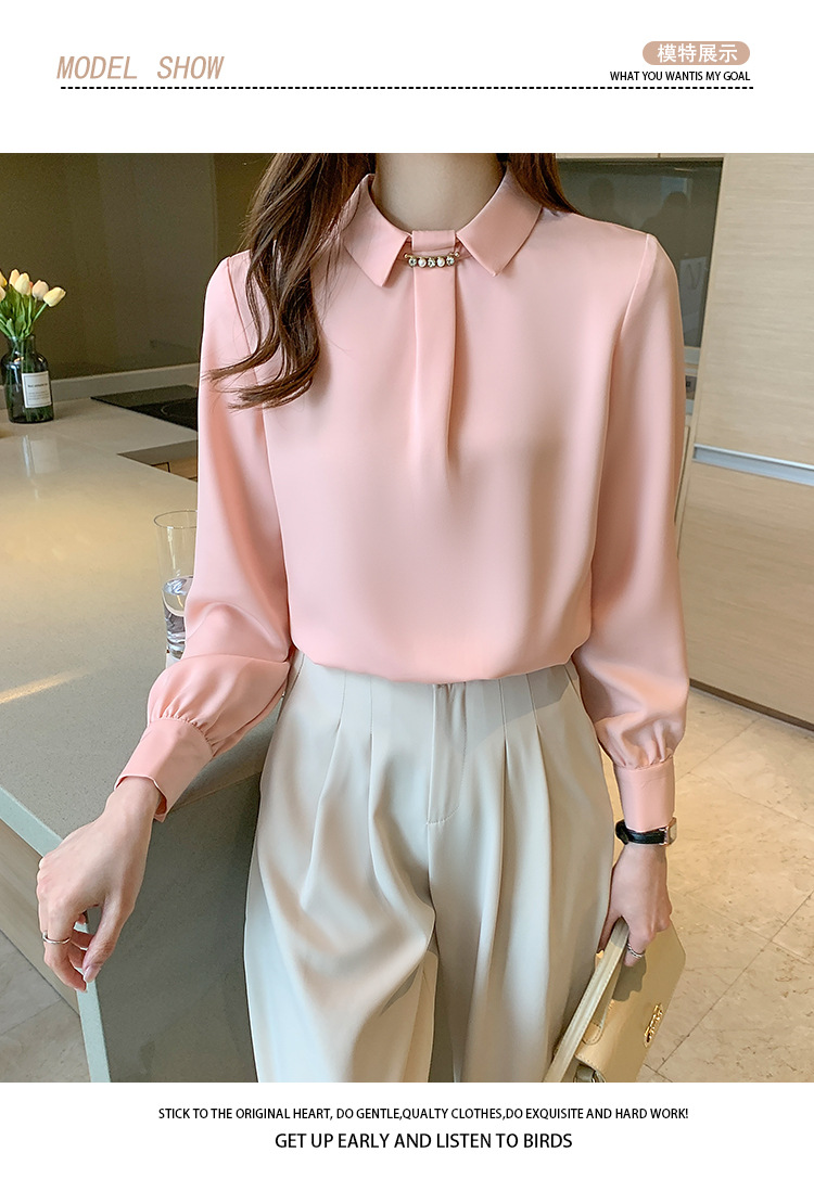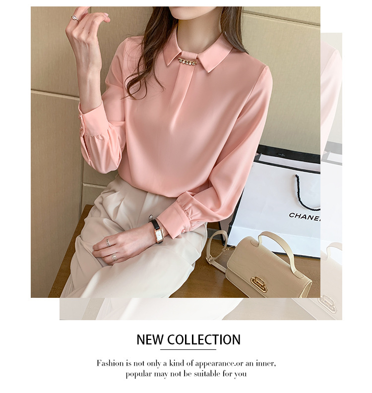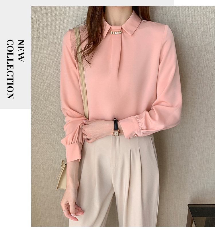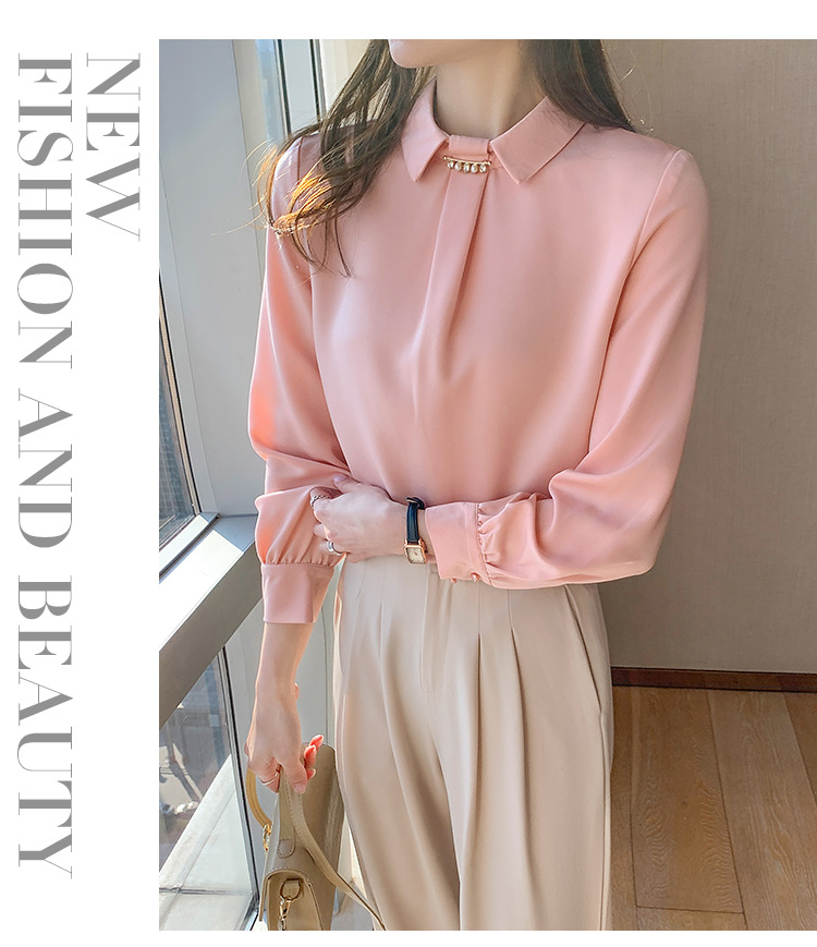 여성을위한 새틴 셔츠 2025 봄 새로운 스타일 달콤한 기질 넥 라인 구슬 패션 디자인 외국 스타일 쉬폰 탑스토어 가기