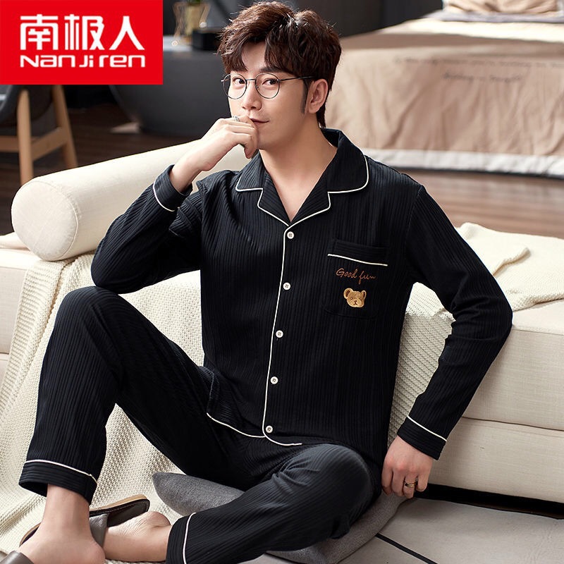 남자 잠옷 남자의 봄과 가을 100 면 긴팔 단색 가정 옷 면 녹색 중년 투피스 세트스토어 가기