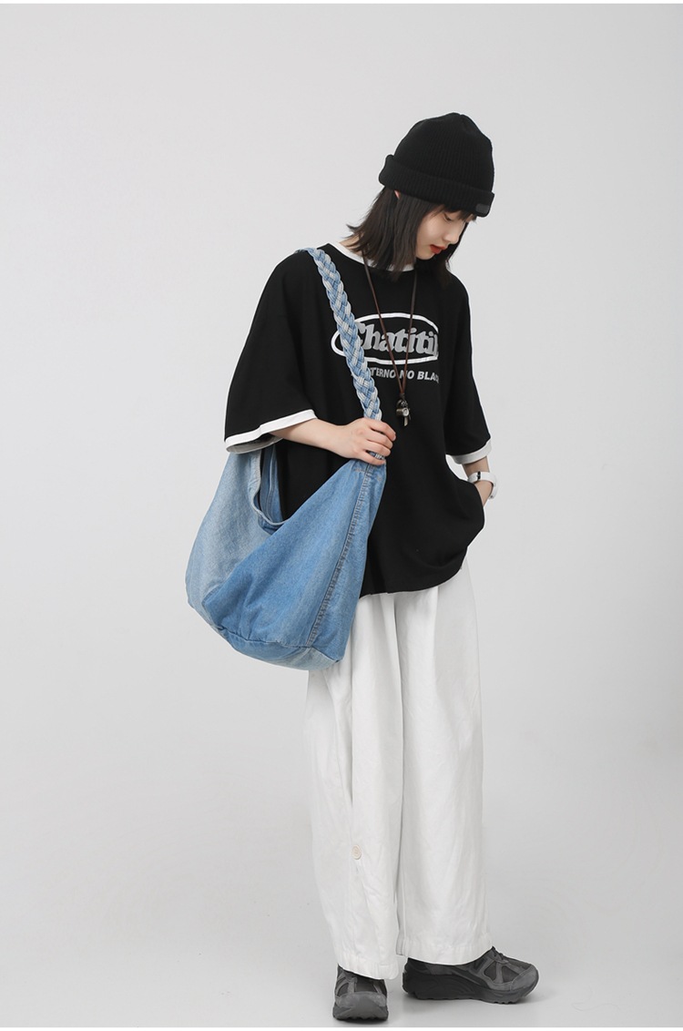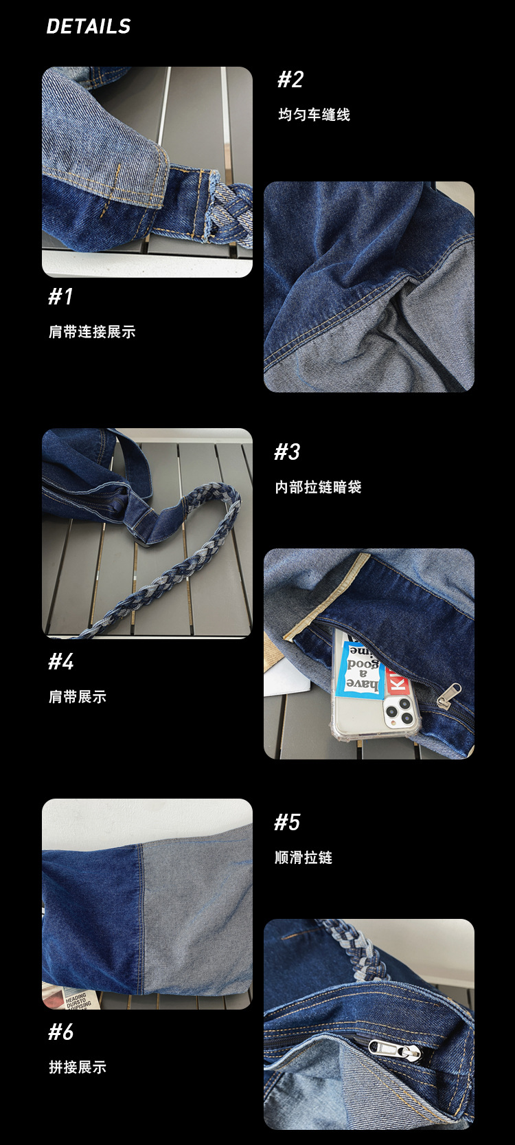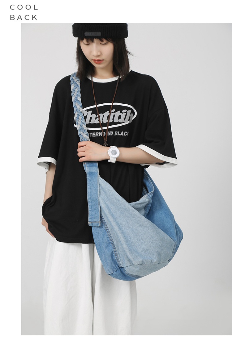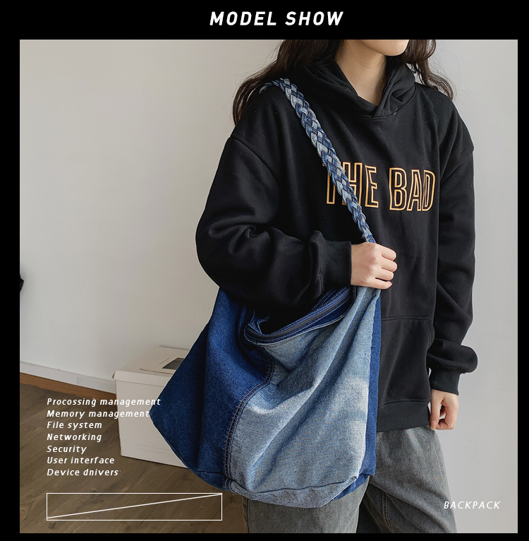 컬러블록 데님 크로스백 여성용 레이지 스타일 대용량 숄더백 예술 학생 백팩 스타일 다용도