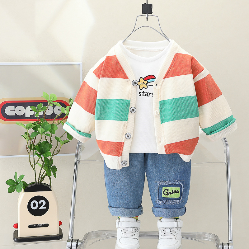 2021 봄 가을 아동복 도매 소년 한국 줄무늬 귀여운 카디건 긴팔 스웨터 바지 쓰리피스 재킷스토어 가기