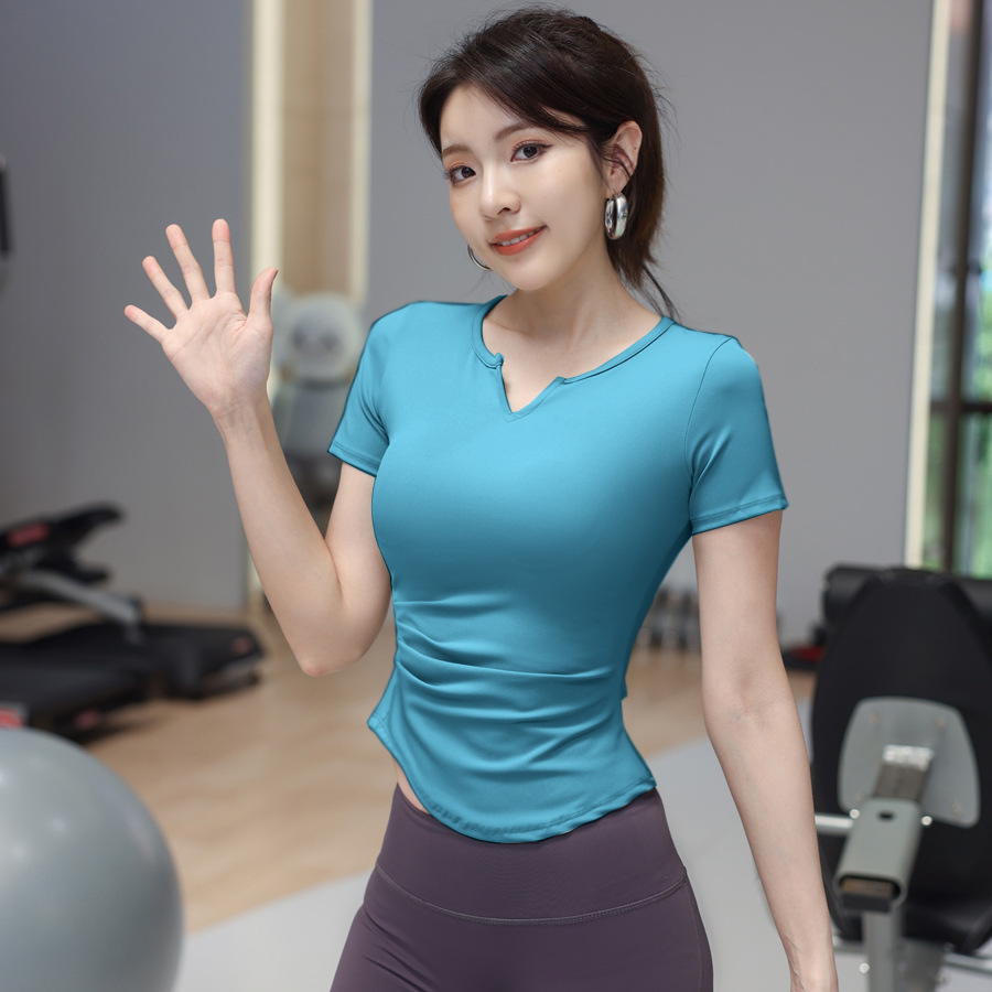 티셔츠 V-넥 요가 탑 나일론 양면 얇은 반팔 여성 피트니스 의류 짧은 요가 탑스토어 가기