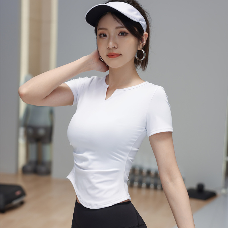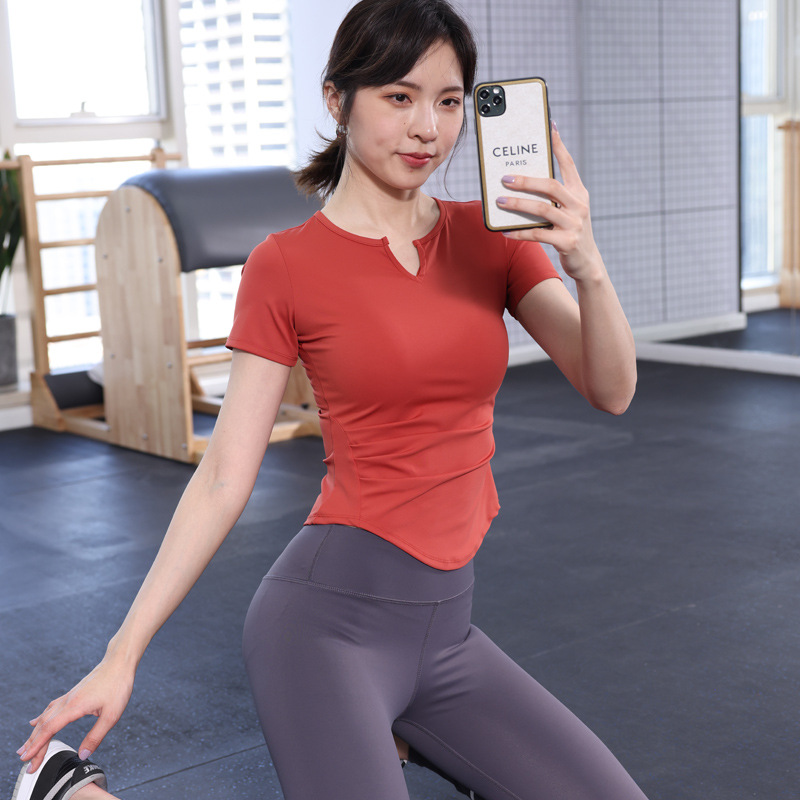 티셔츠 V-넥 요가 탑 나일론 양면 얇은 반팔 여성 피트니스 의류 짧은 요가 탑