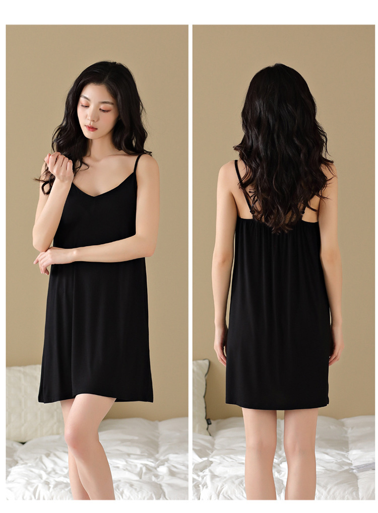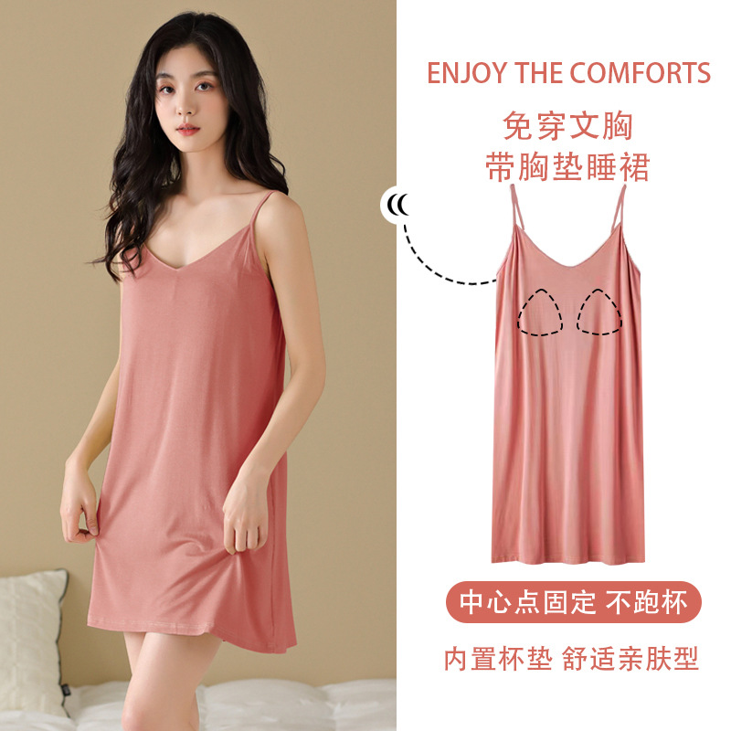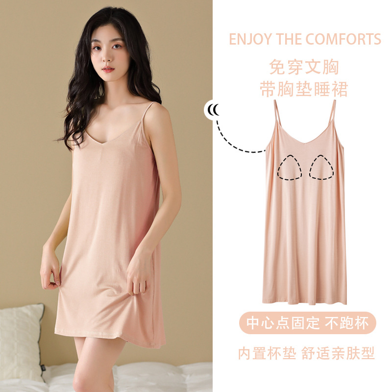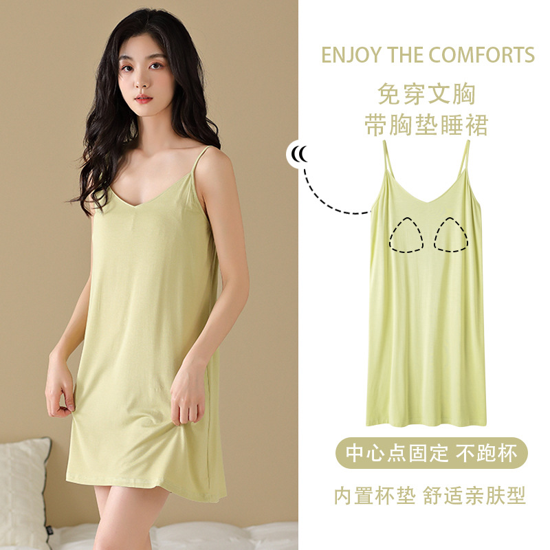여학생을 위한 여름 편안하고 통기성 좋은 면 실크 서스펜더 스커트, 가슴 패드가 있는 여성용 순수한 섹시 스타일 모란디 컬러 잠옷
