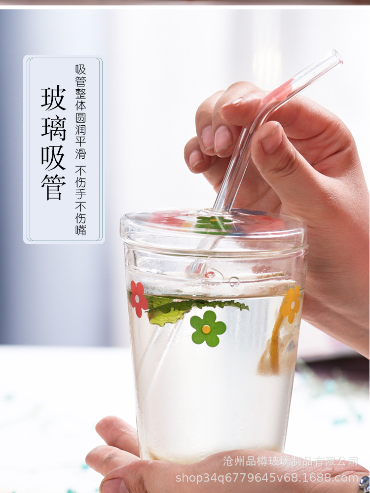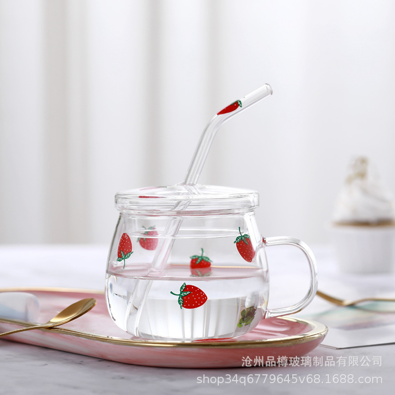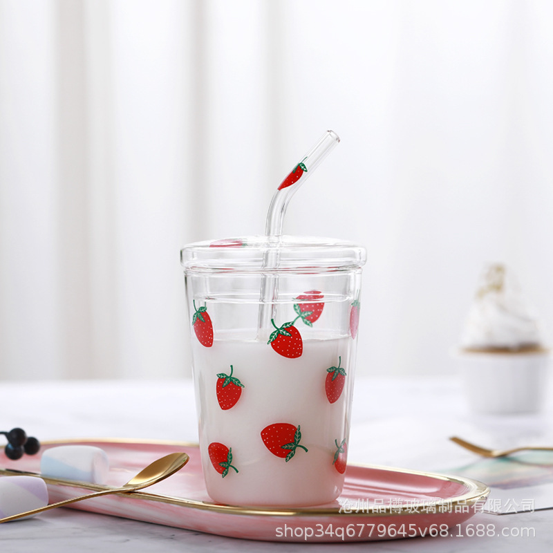 작은 꽃 딸기 유리 빨대 컵 작은 신선한 주스 우유 아침 식사 컵 레몬 뚜껑이있는 우유 컵 커플 컵스토어 가기