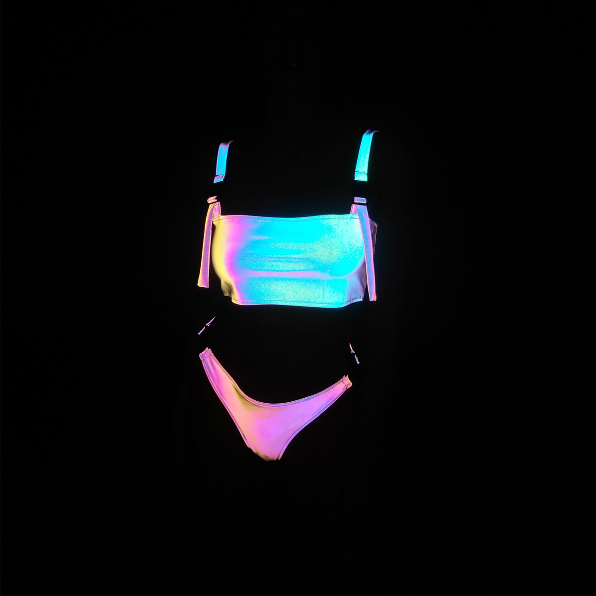新款欧美跨境外贸炫彩反光比基尼ins性感绑带分体泳衣镭射bikini