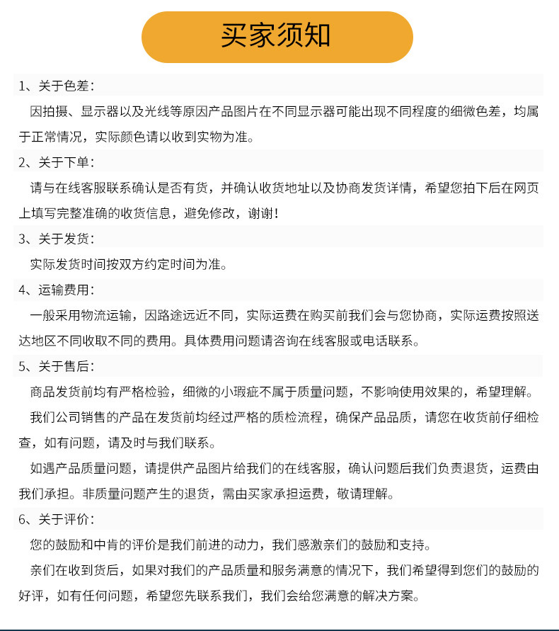 亲爱的顾客,感谢您的关注与支持。为了我们能够拥有愉快的交易,请购物前多花几分钟看看下面的文字,祝您购物愉快!