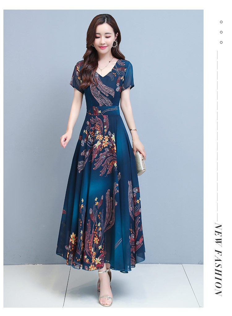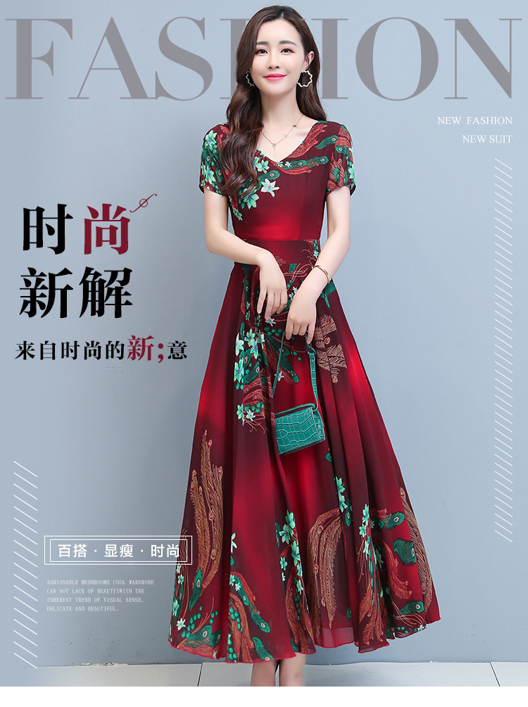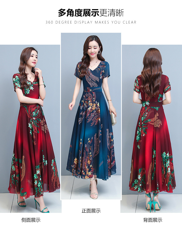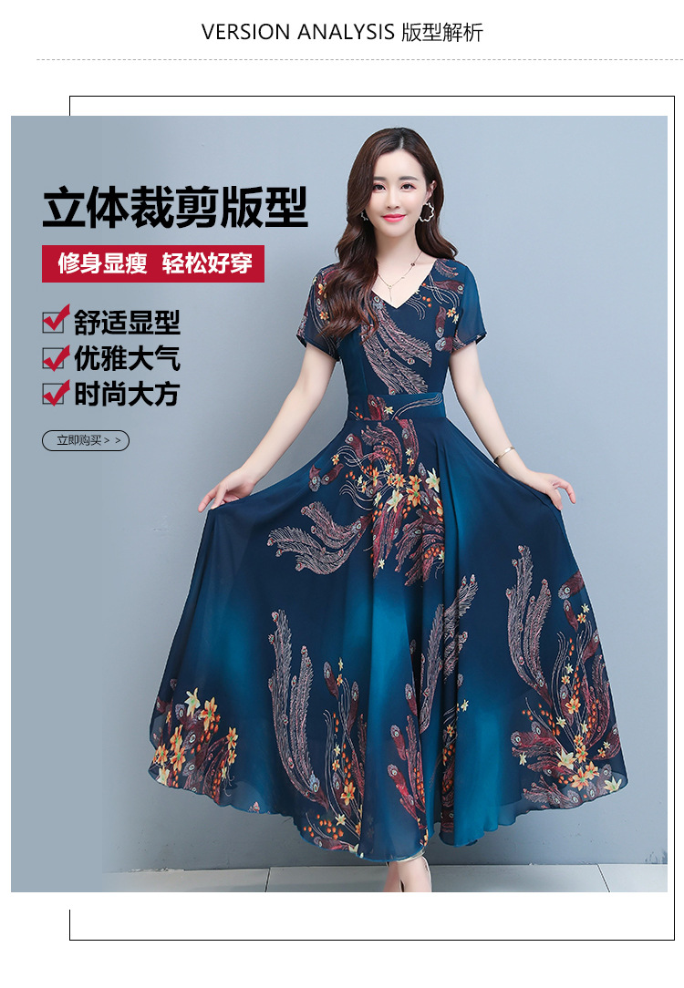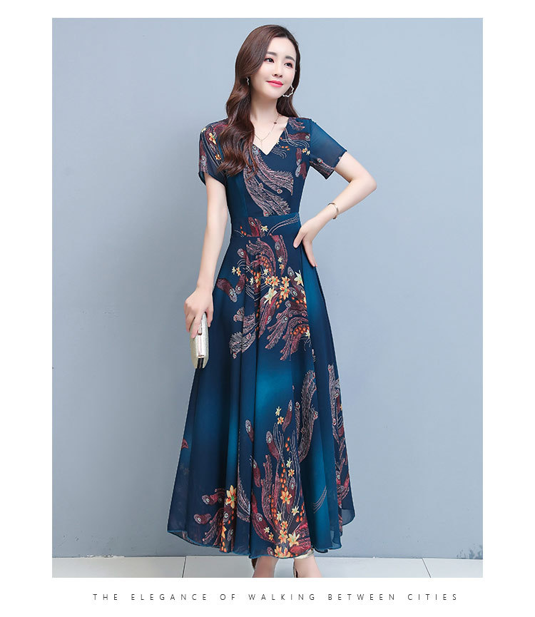 2021 여름 여성 오버니 브이넥 대형 스윙 원피스 우아한 한국 인쇄 슬림 중년 여성 원피스스토어 가기