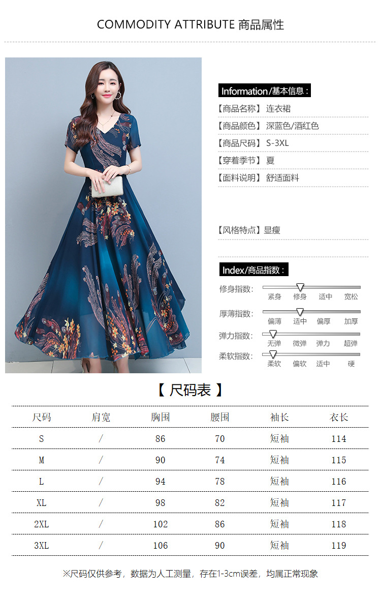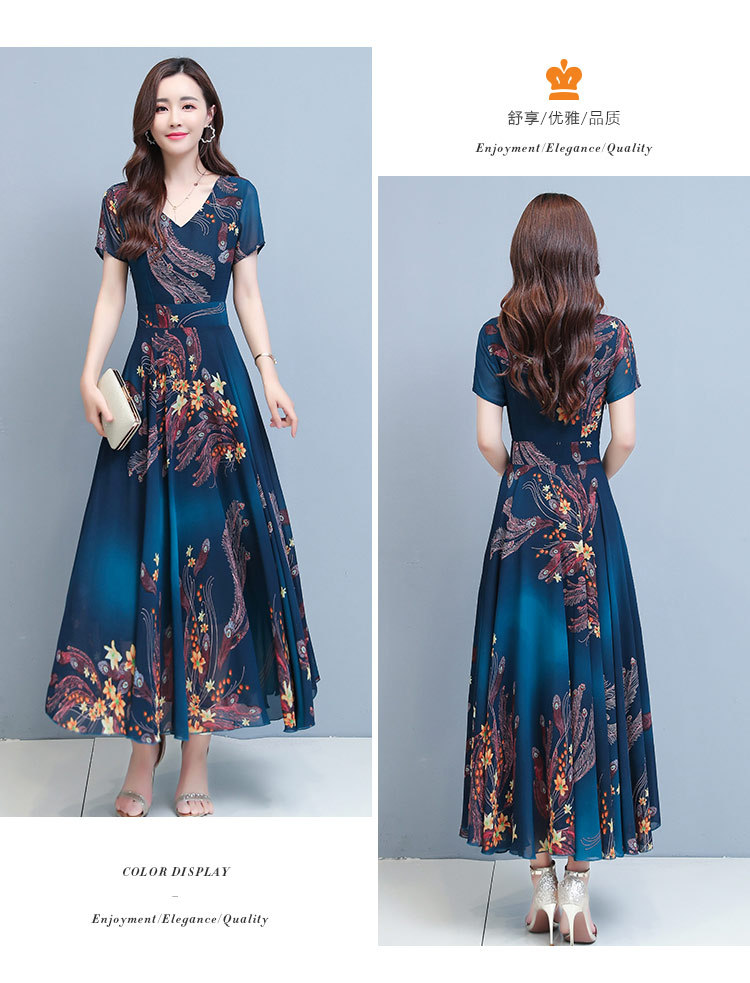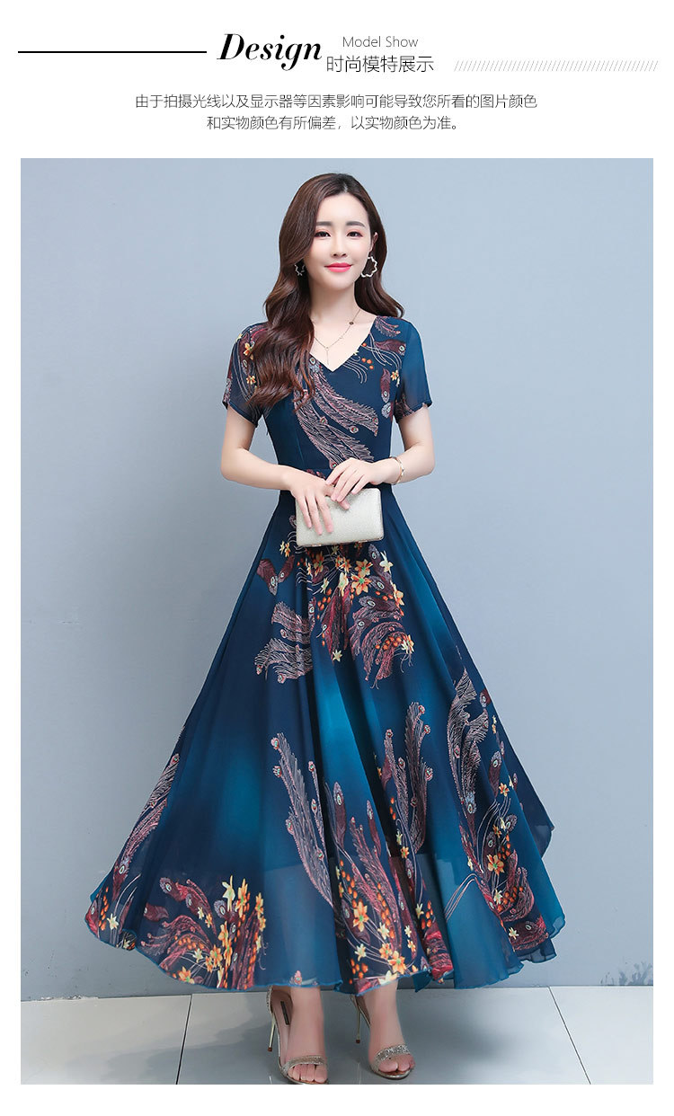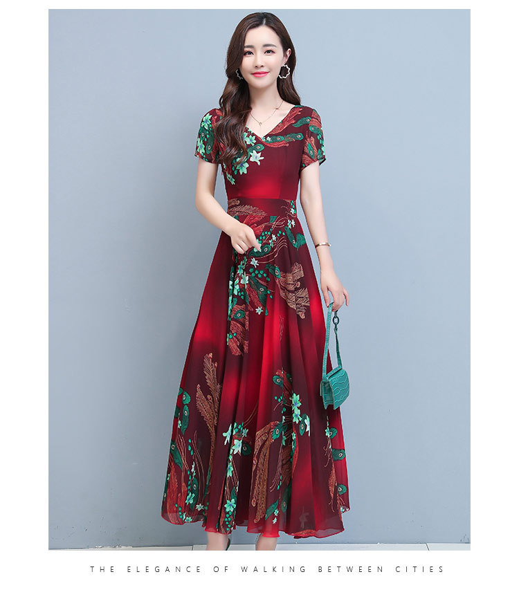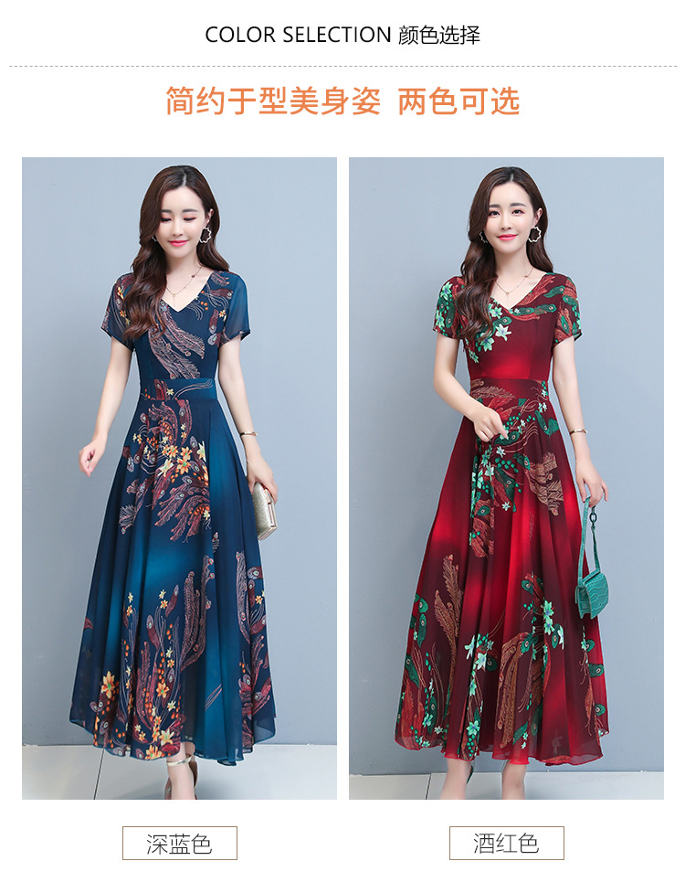 2021 여름 여성 오버니 브이넥 대형 스윙 원피스 우아한 한국 인쇄 슬림 중년 여성 원피스스토어 가기