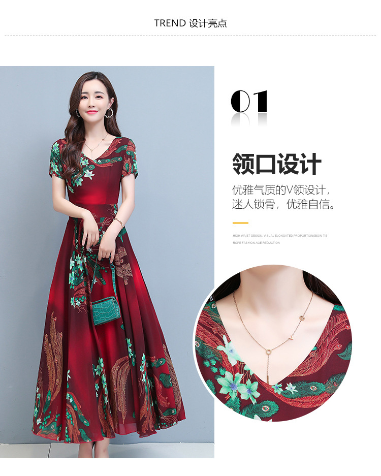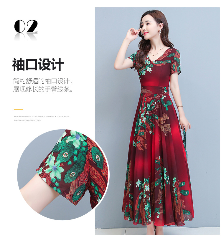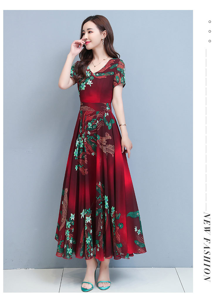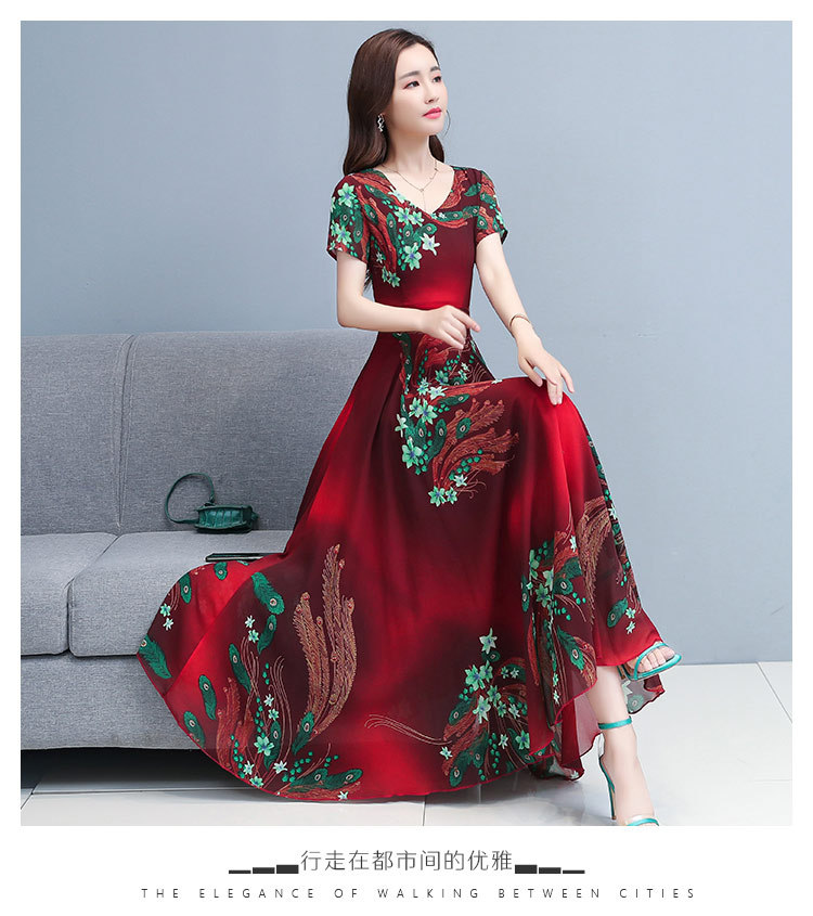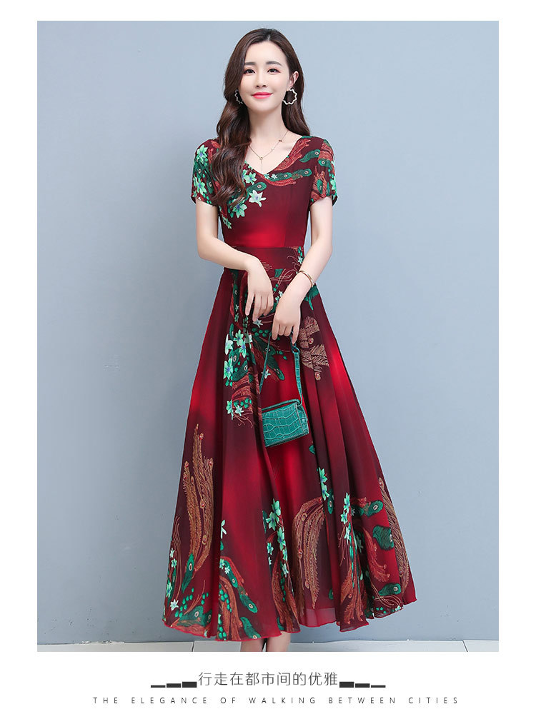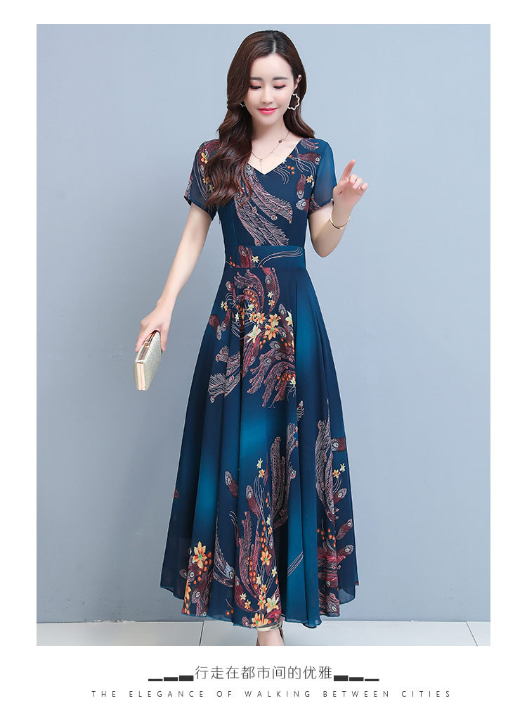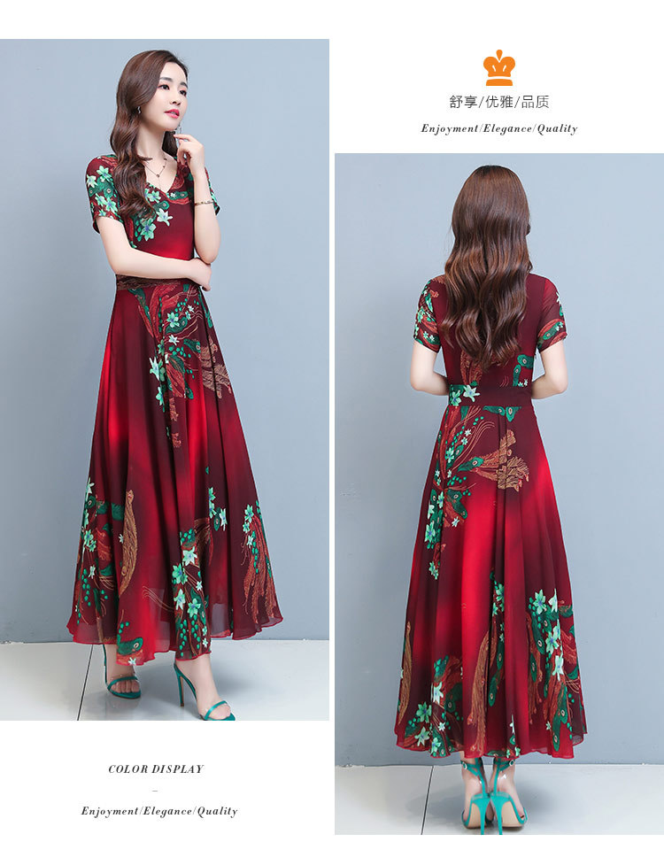 2021 여름 여성 오버니 브이넥 대형 스윙 원피스 우아한 한국 인쇄 슬림 중년 여성 원피스