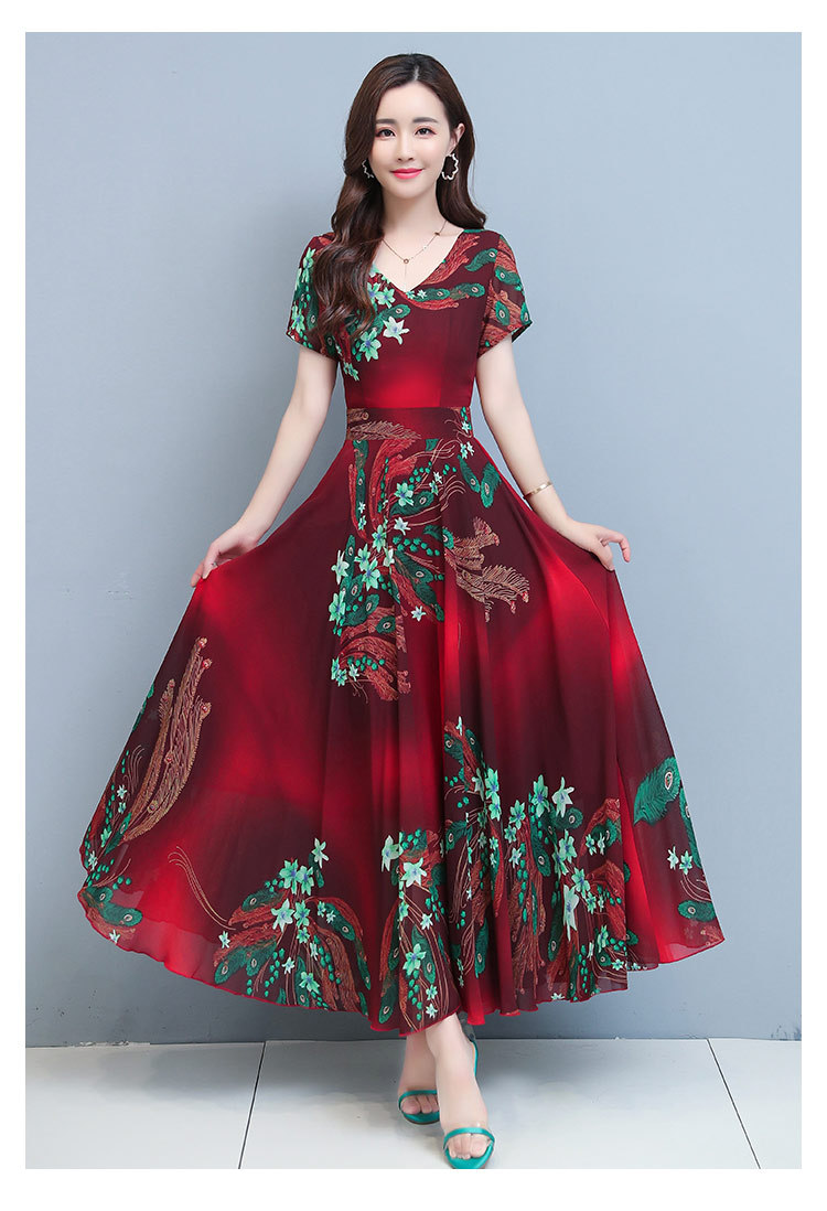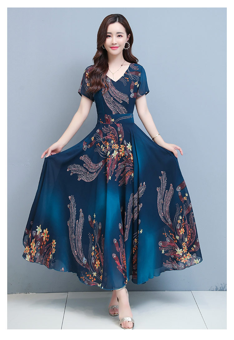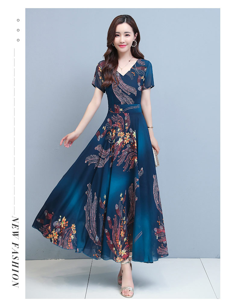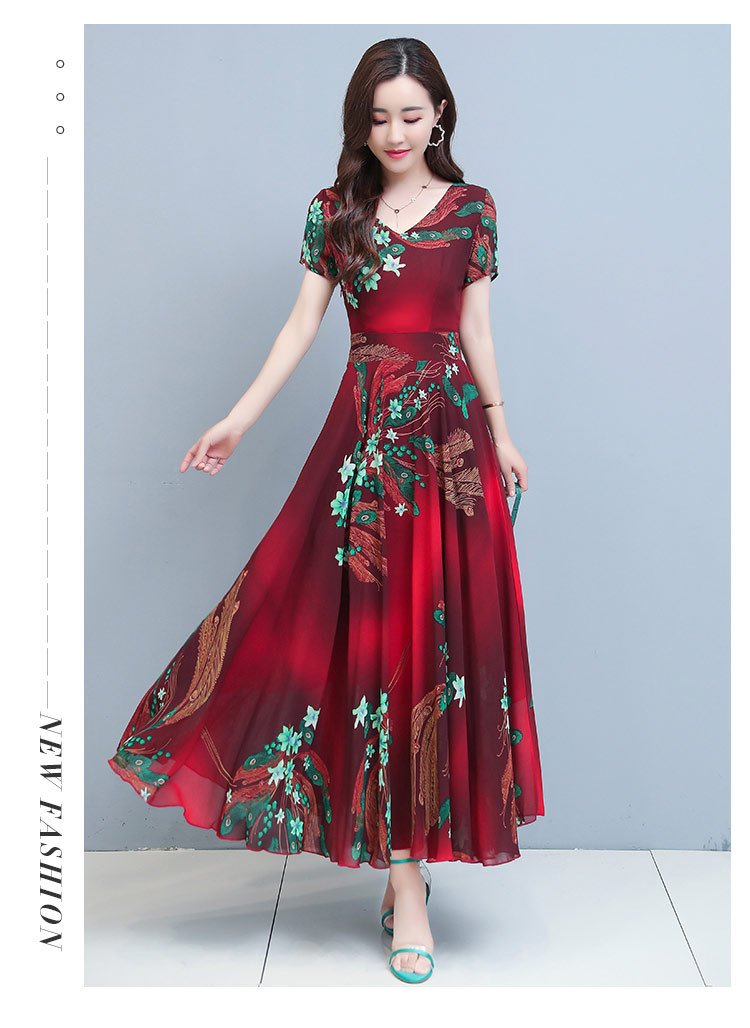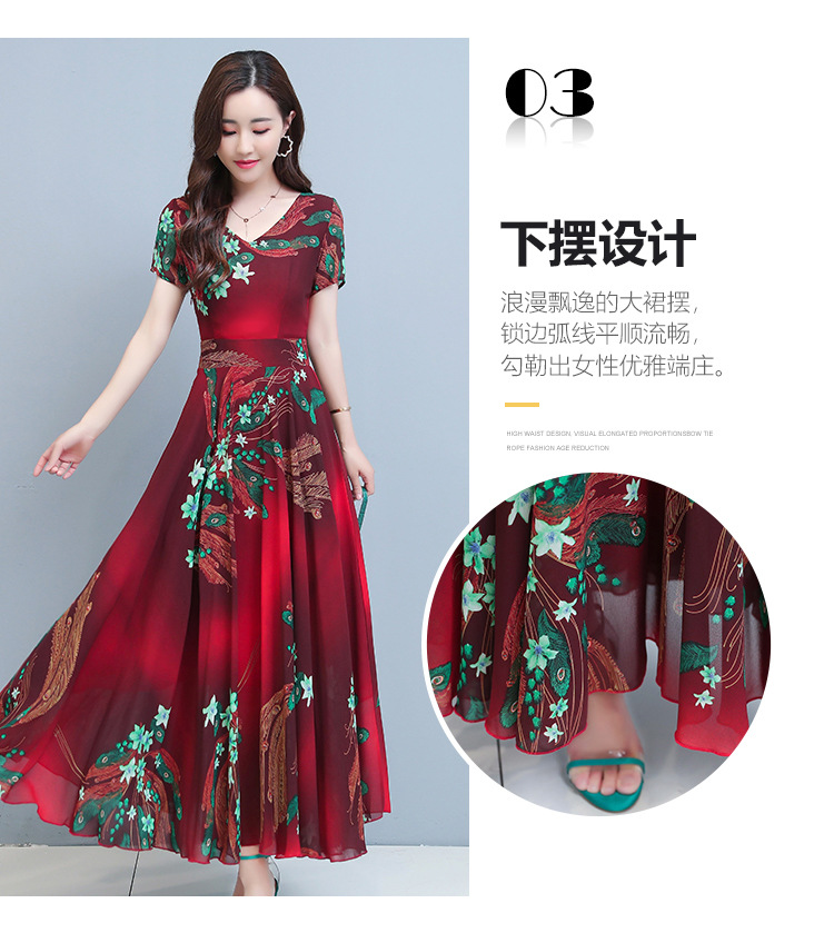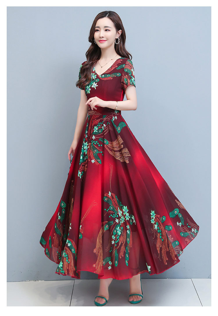 2021 여름 여성 오버니 브이넥 대형 스윙 원피스 우아한 한국 인쇄 슬림 중년 여성 원피스