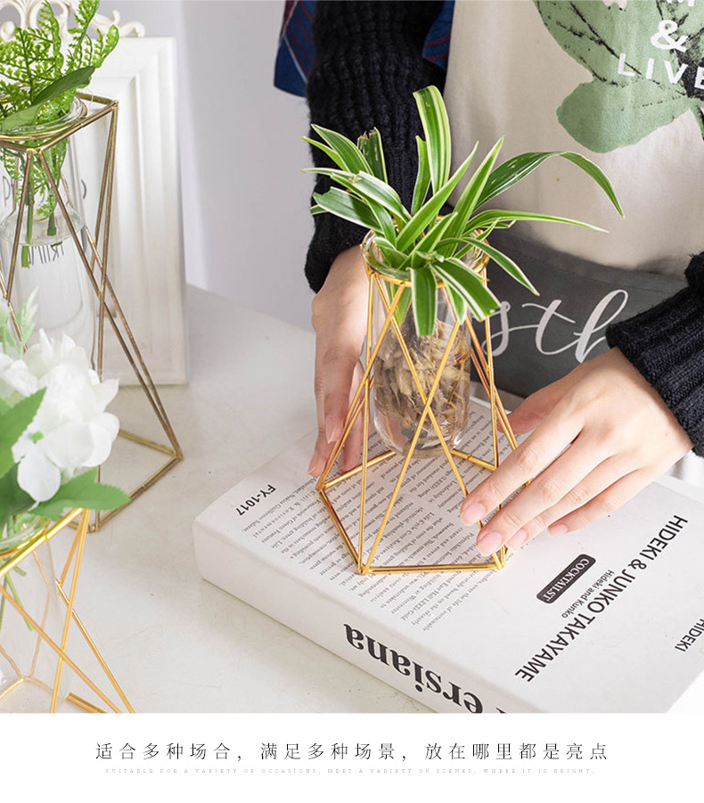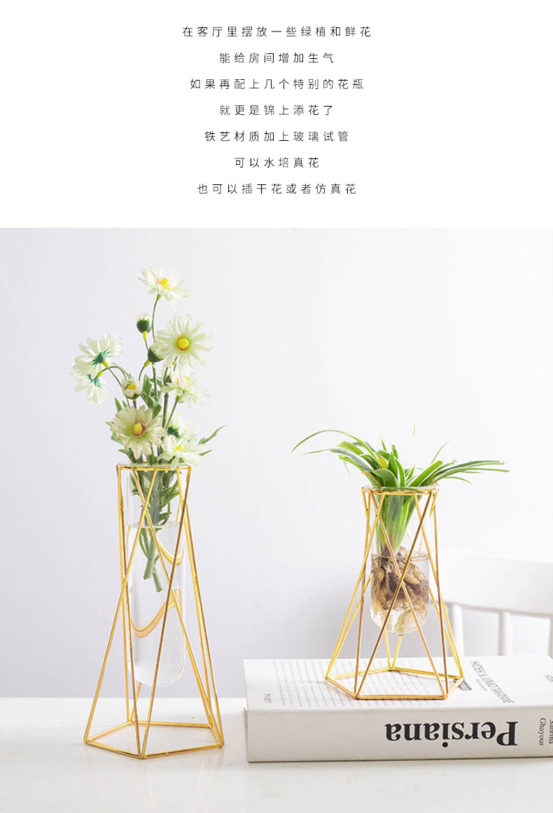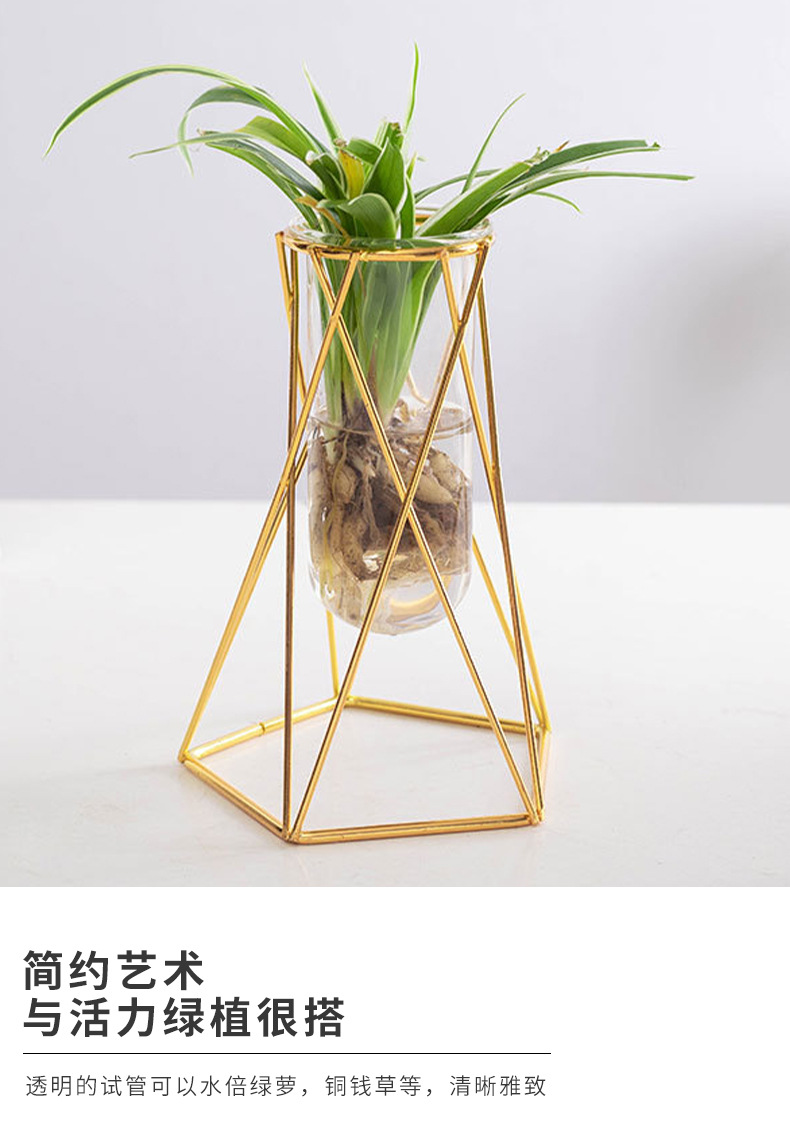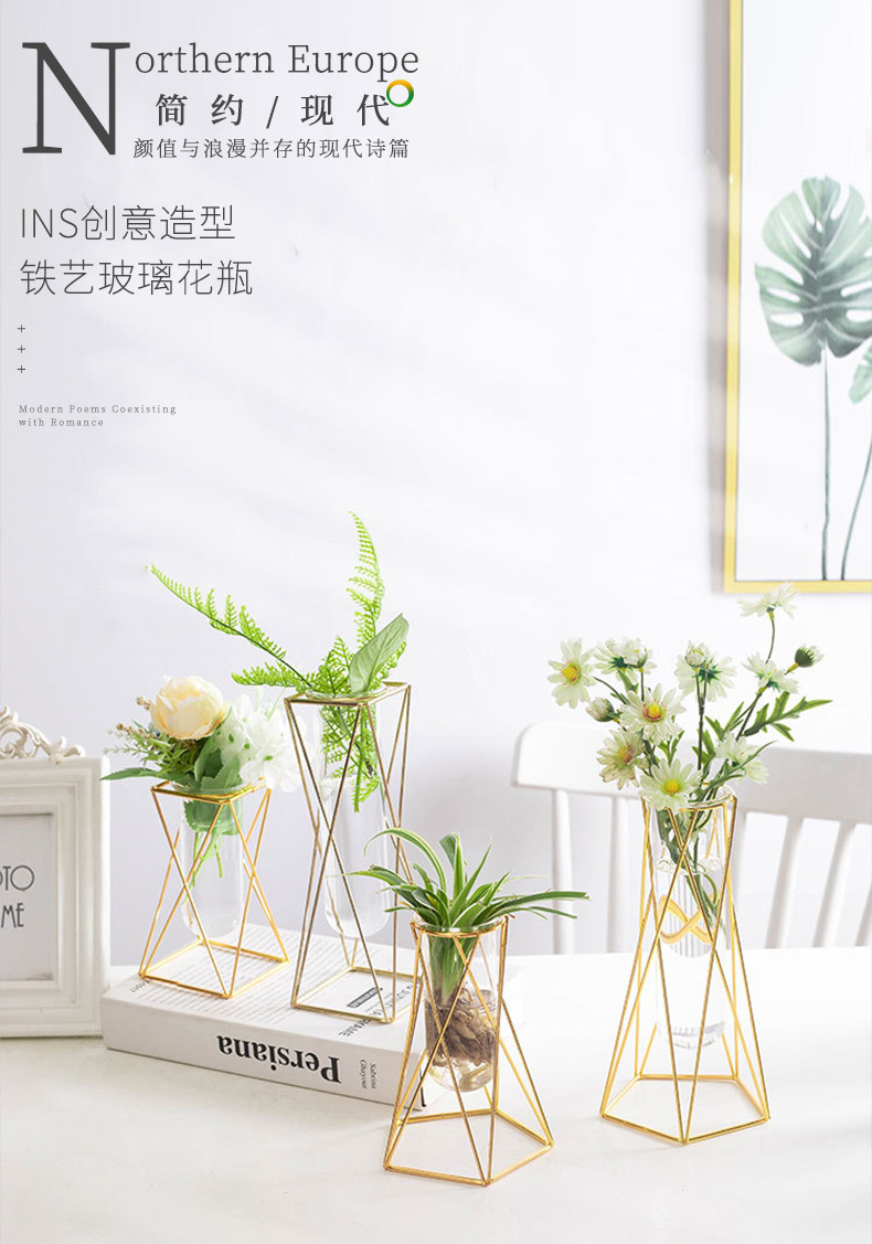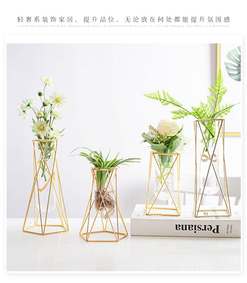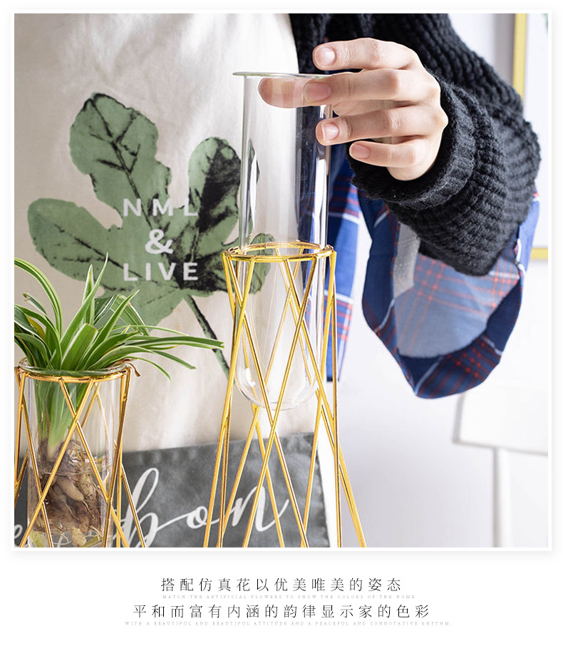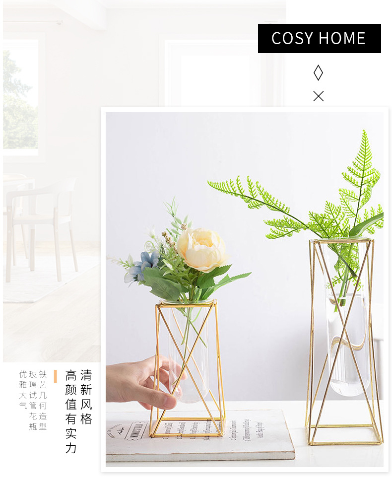 유리 꽃병, 금색 기하학적 철제 꽃병, 인스 스타일 탁상 장식품, 수경재배 용기, 유리 시험관 꽃꽂이