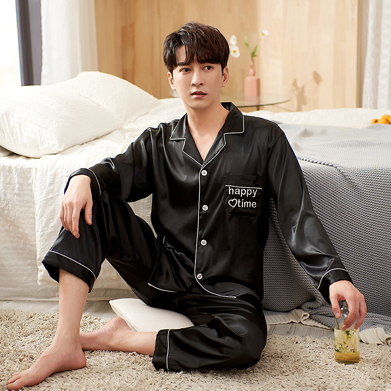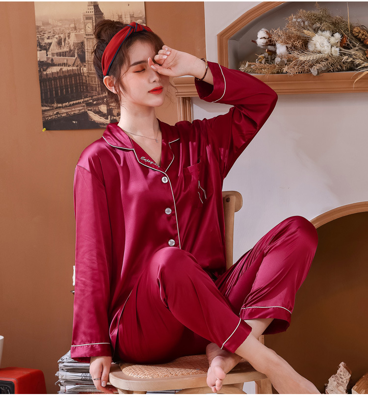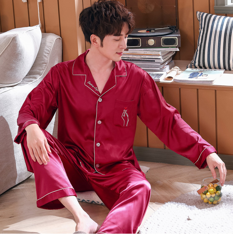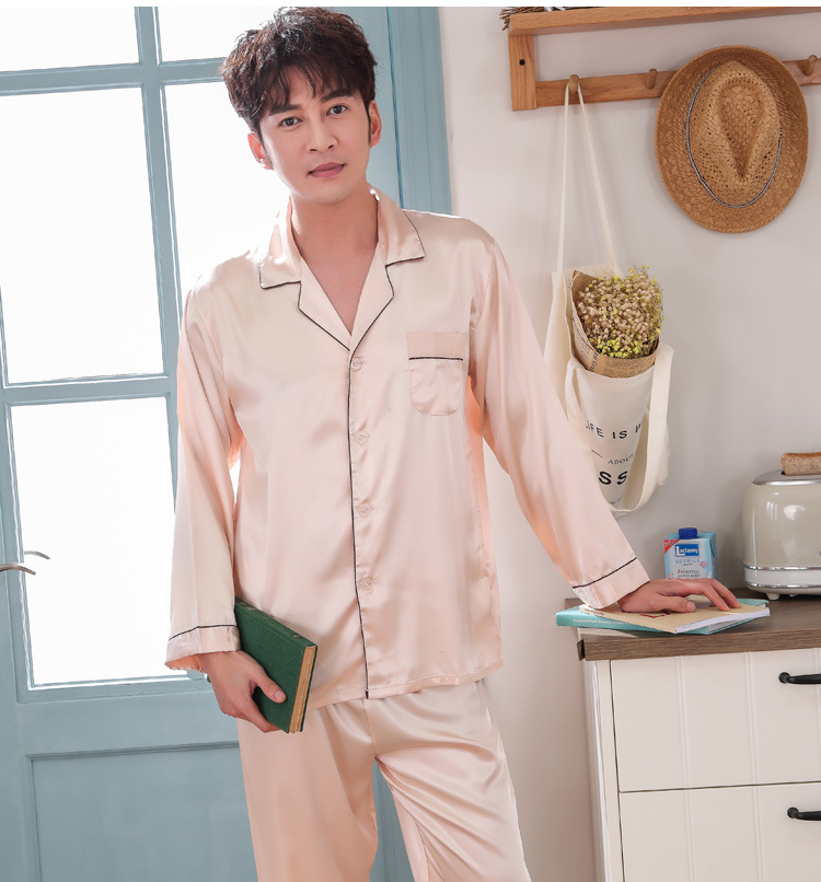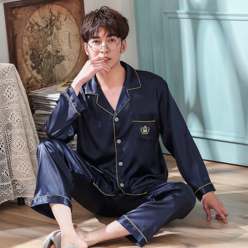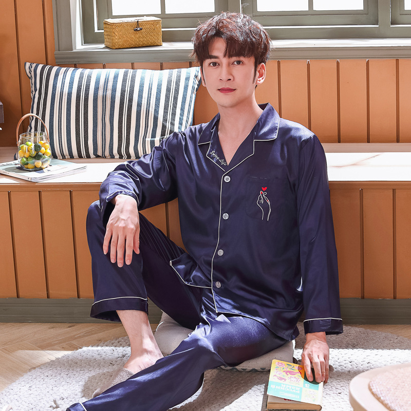 봄과 가을 커플 잠옷 여자의 인공 실크 한국식 긴팔 가디건 아이스 실크 세트 남자의 플러스 사이즈 가정 옷 얇은스토어 가기