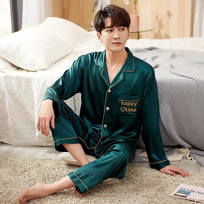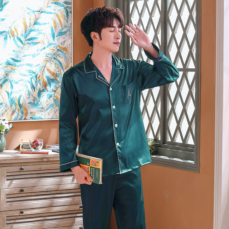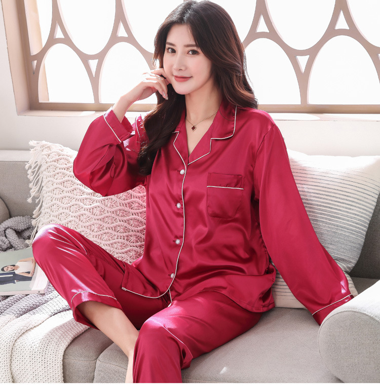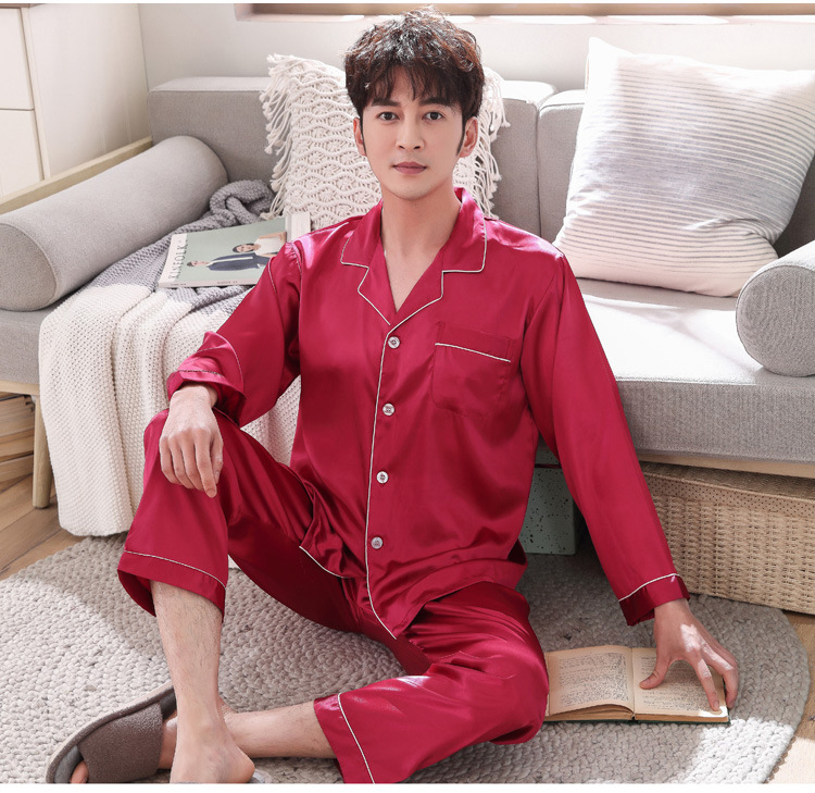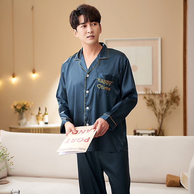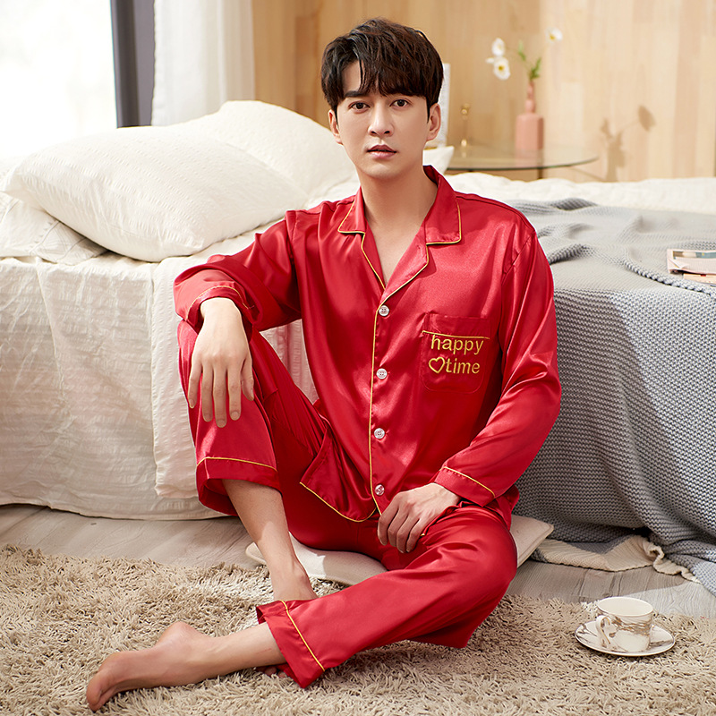 봄과 가을 커플 잠옷 여자의 인공 실크 한국식 긴팔 가디건 아이스 실크 세트 남자의 플러스 사이즈 가정 옷 얇은스토어 가기