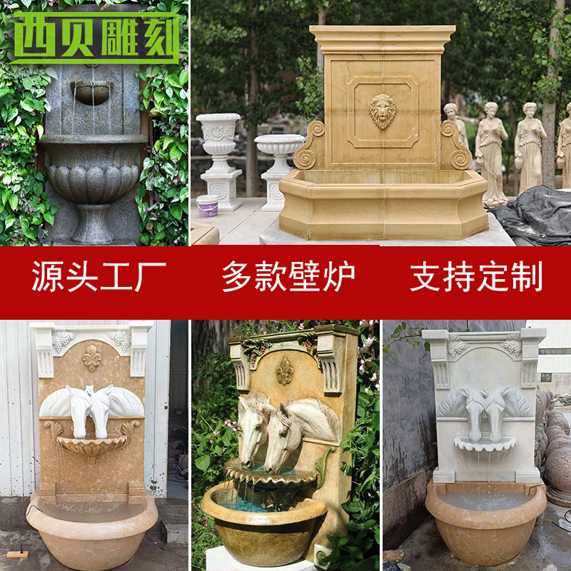石雕壁泉 欧式雕花壁泉 狮子头造型石材壁泉定制 西方动物组合