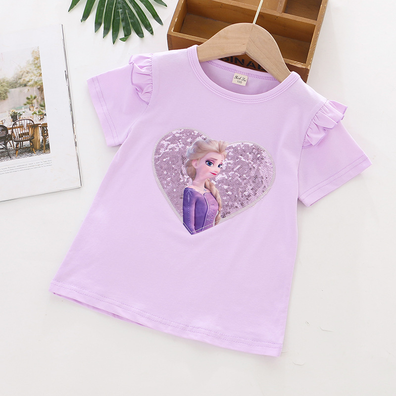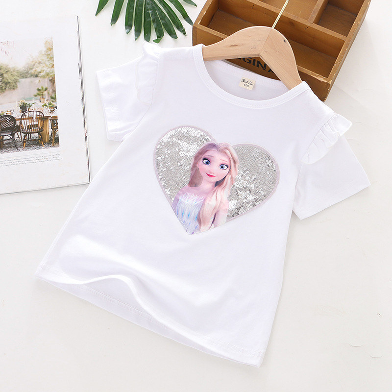 크로스 보더 ~ 여름 소녀 얼음과 눈 만화 스팽글 티셔츠 소녀 사랑 플립 스팽글 하프 슬리브 탑베이스 코트 면스토어 가기