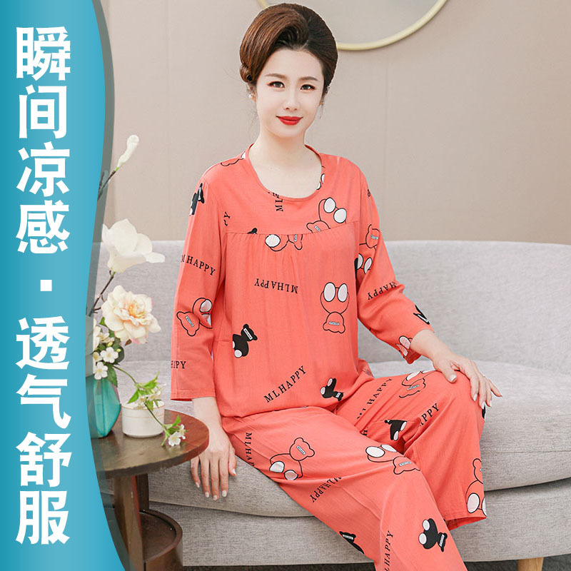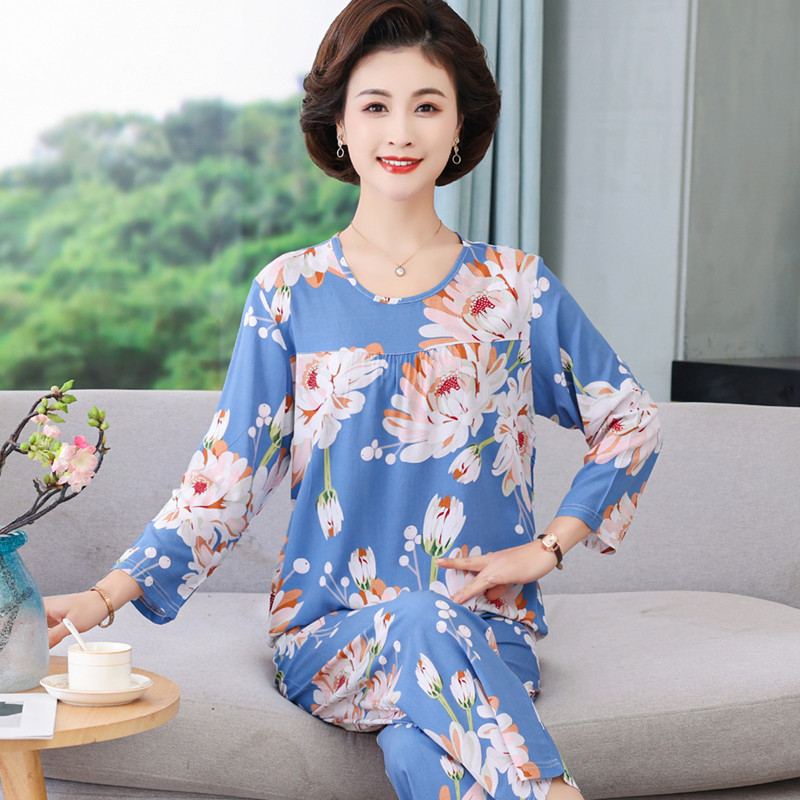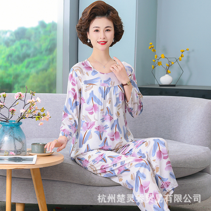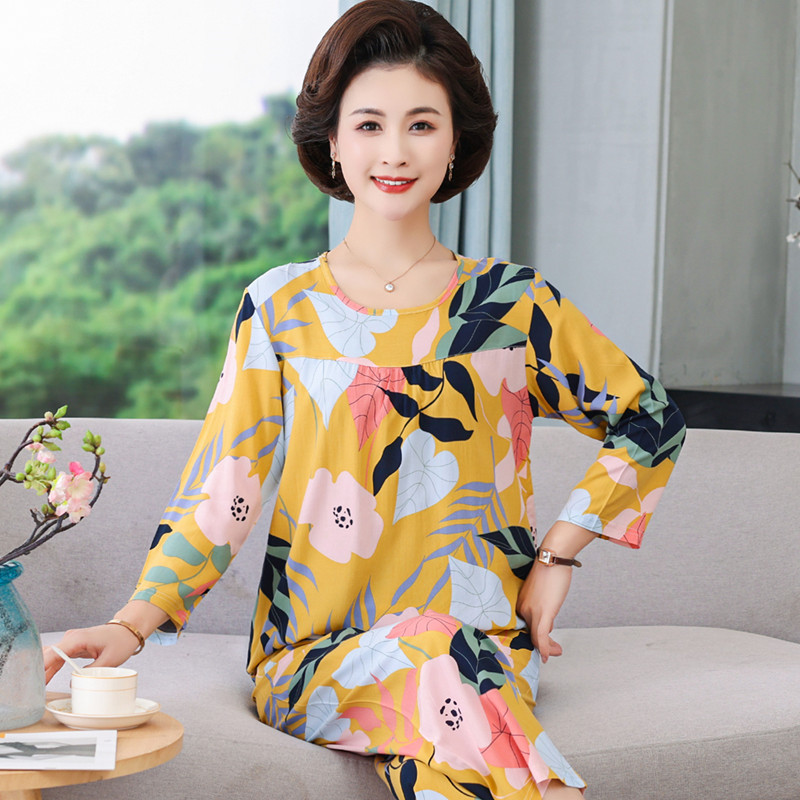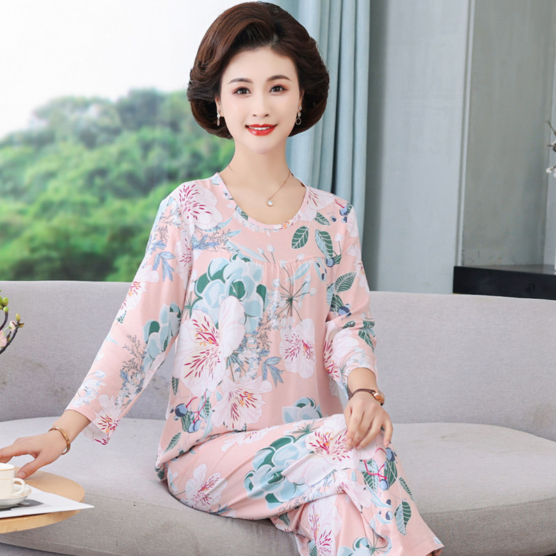 어머니의 면 실크 잠옷 여자의 봄과 가을 여름 긴팔 투피스 세트 중년 및 노인 인조 면 플러스 사이즈 인쇄 가정용 의류스토어 가기