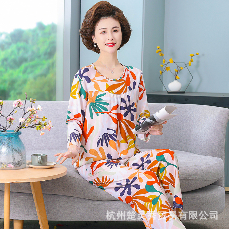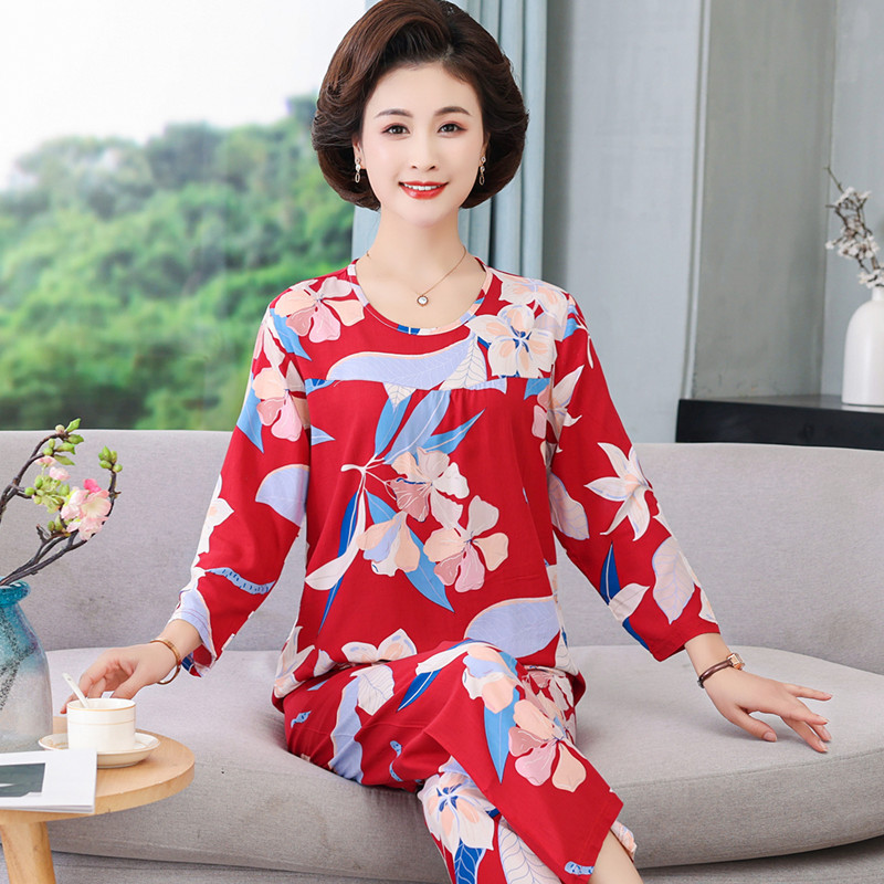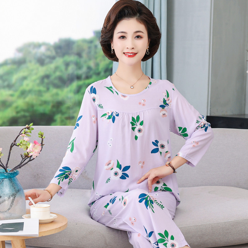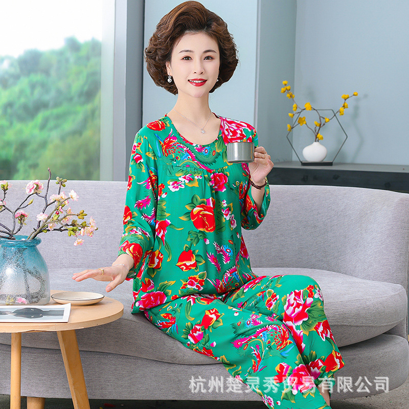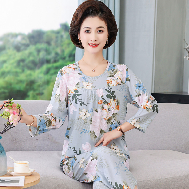 어머니의 면 실크 잠옷 여자의 봄과 가을 여름 긴팔 투피스 세트 중년 및 노인 인조 면 플러스 사이즈 인쇄 가정용 의류