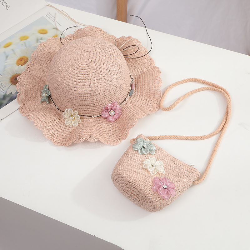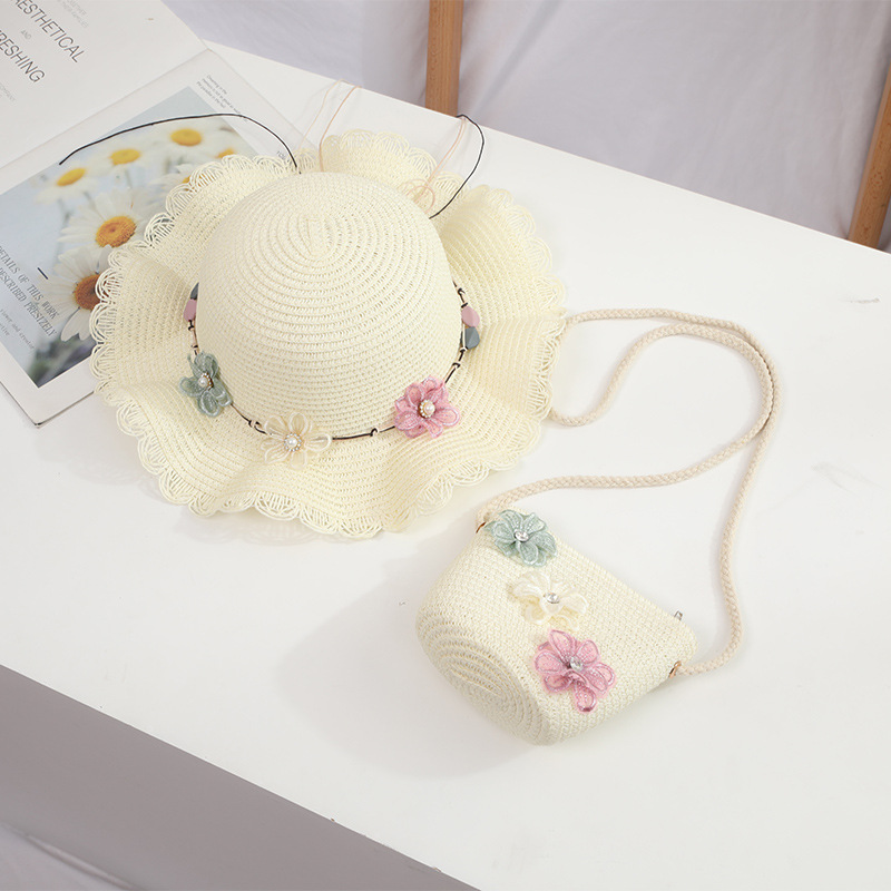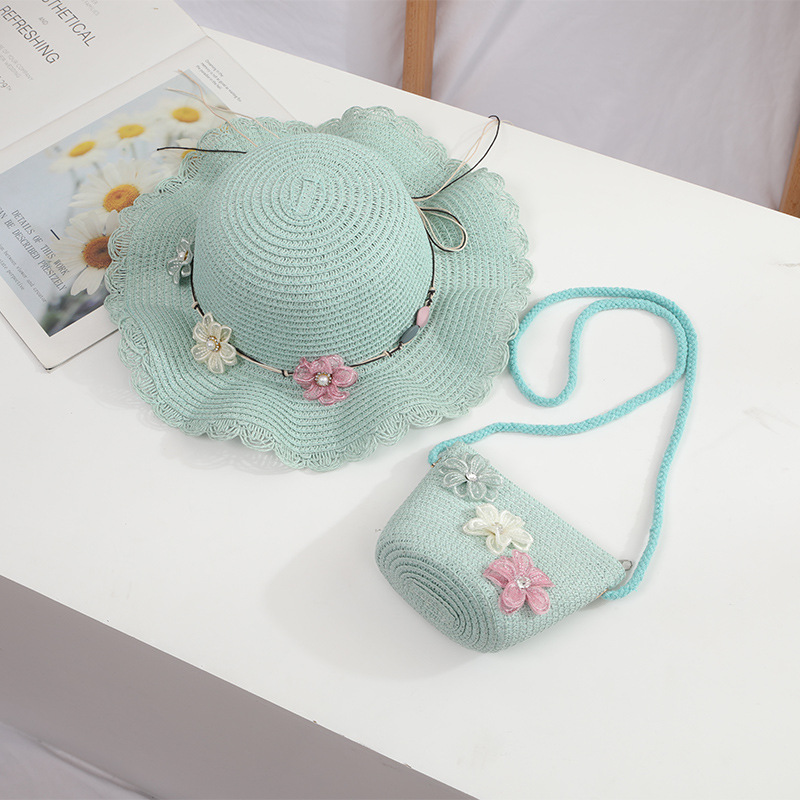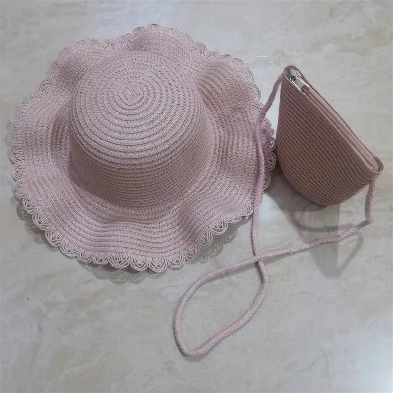 어린이 밀짚 모자 여름 차양 비치 모자 가방 세트 소녀 공주 꽃 태양 모자
