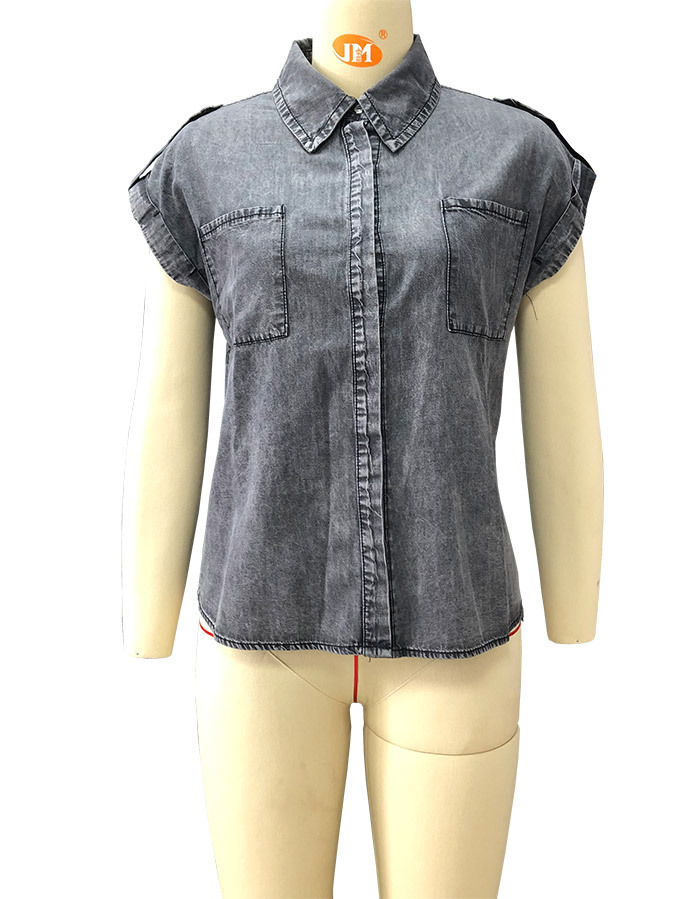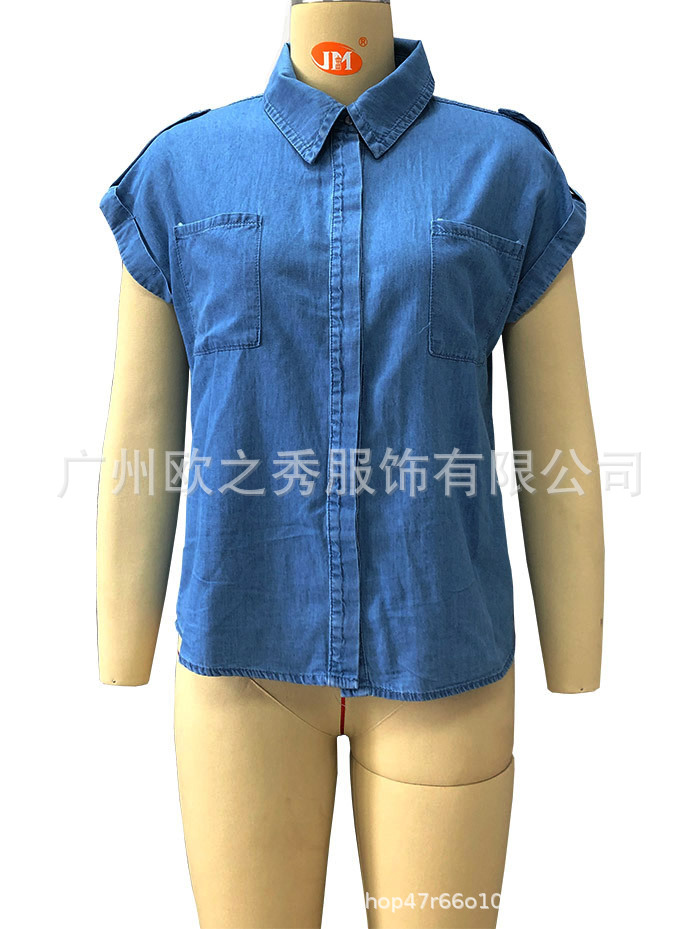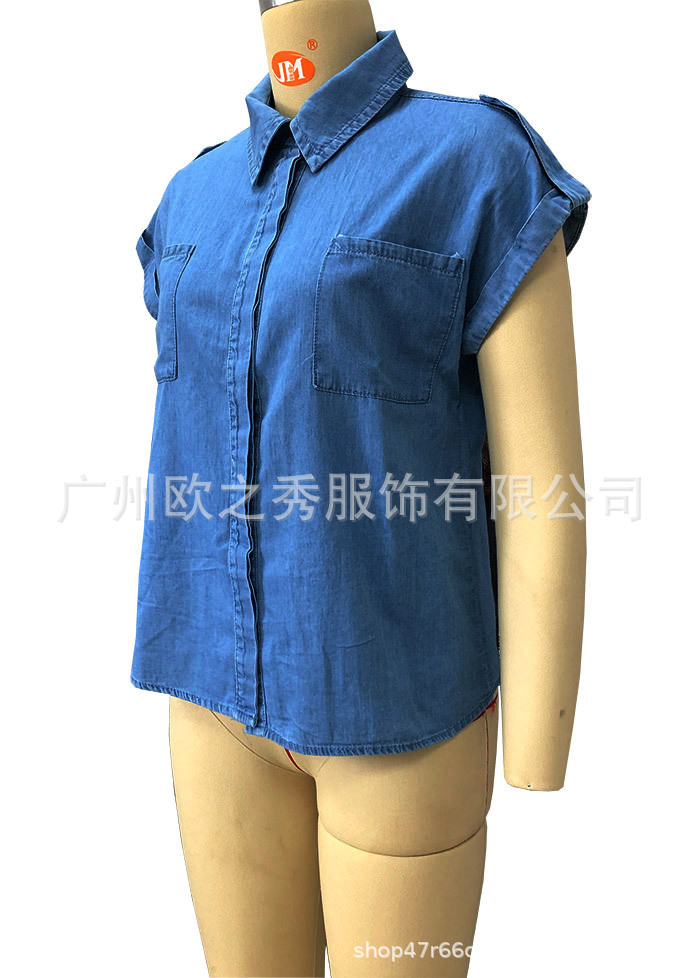 AliExpress 크로스보더 2024 여름 반팔 데님 셔츠 유럽과 미국의 복고풍 여성 솔리드 컬러 셔츠 슬리밍 탑