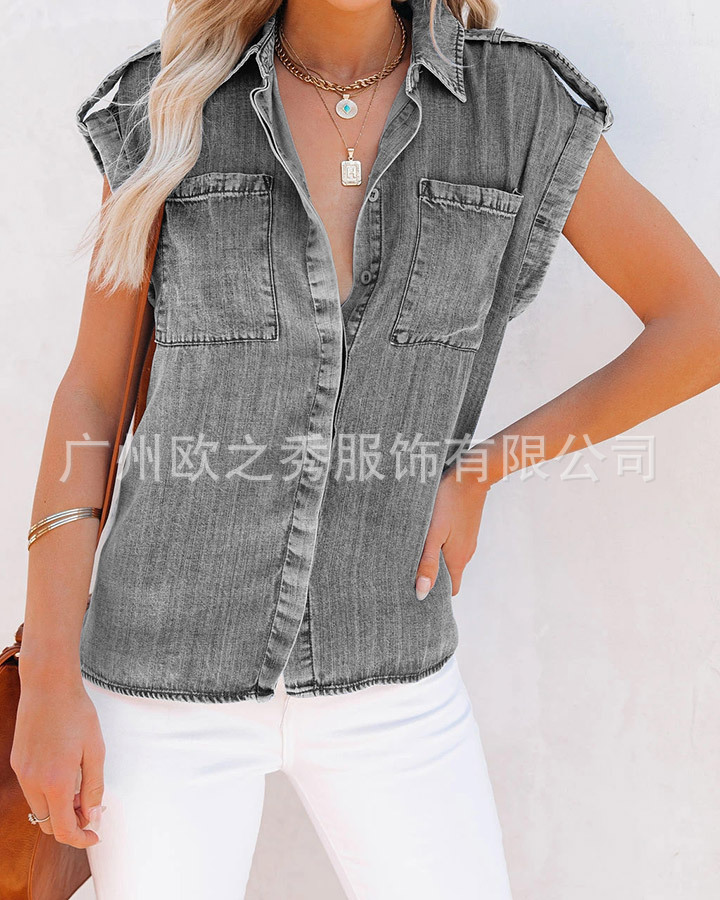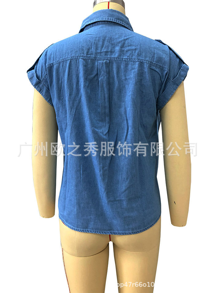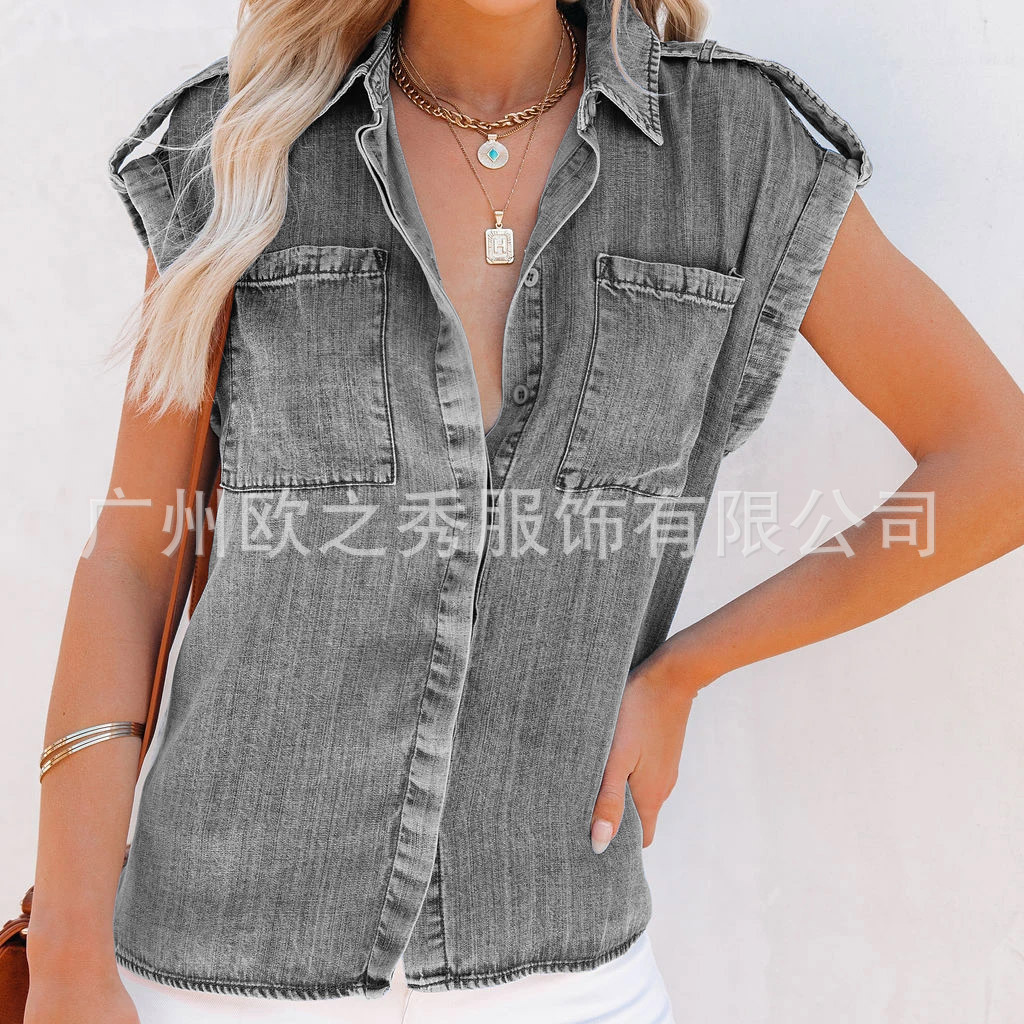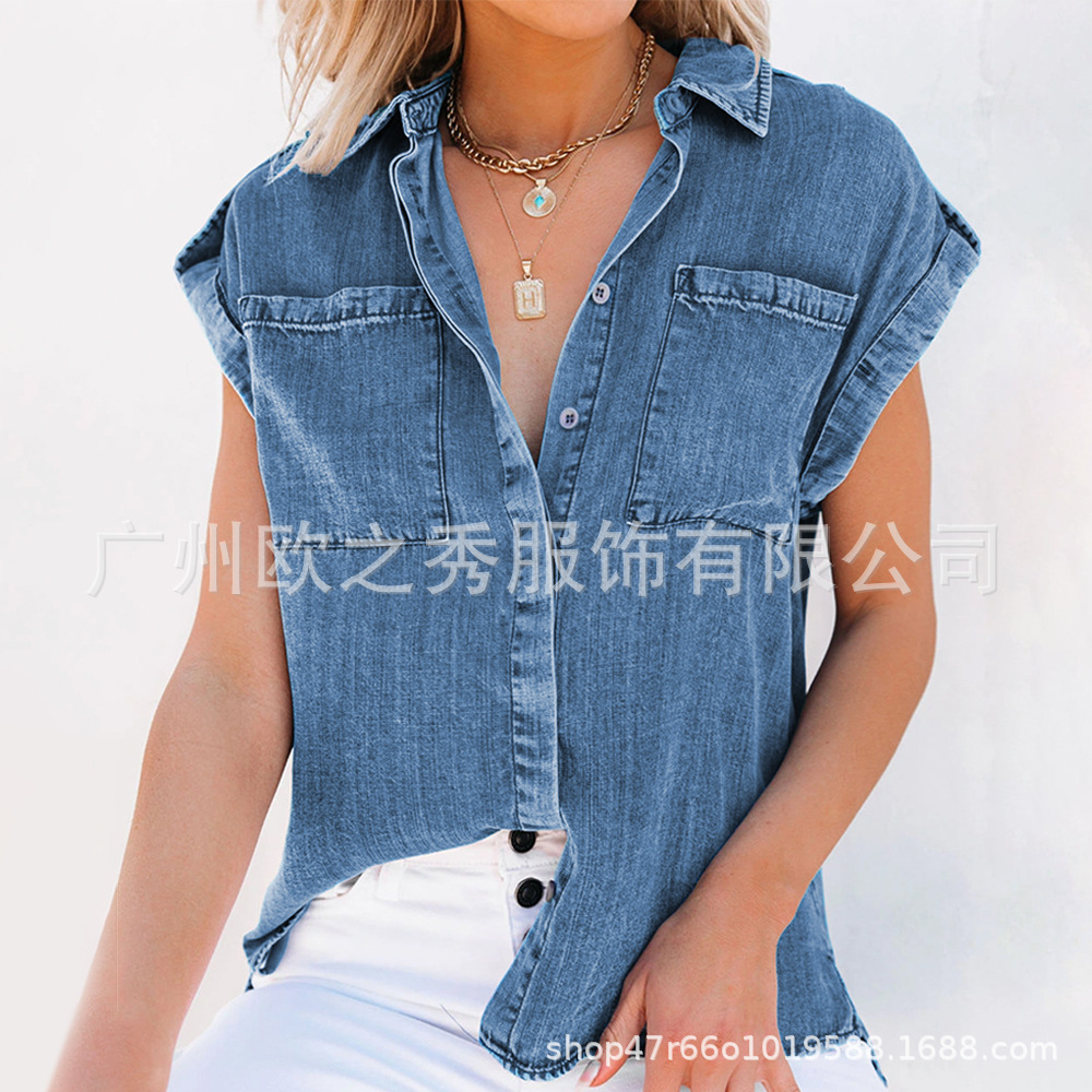 AliExpress 크로스보더 2024 여름 반팔 데님 셔츠 유럽과 미국의 복고풍 여성 솔리드 컬러 셔츠 슬리밍 탑스토어 가기