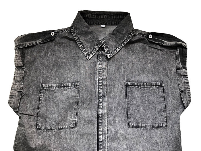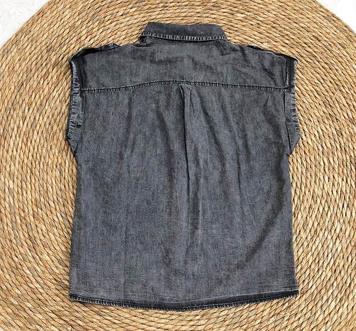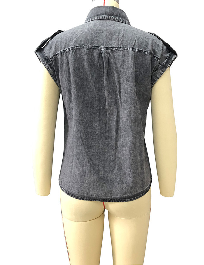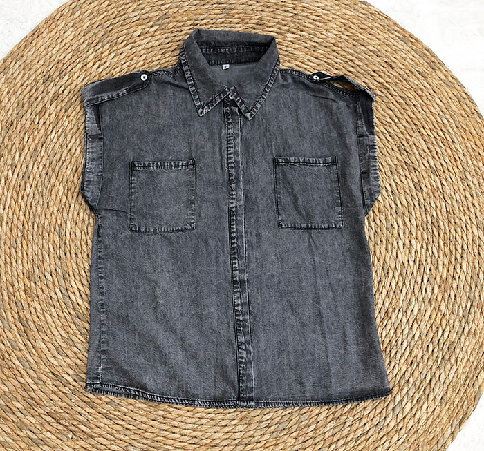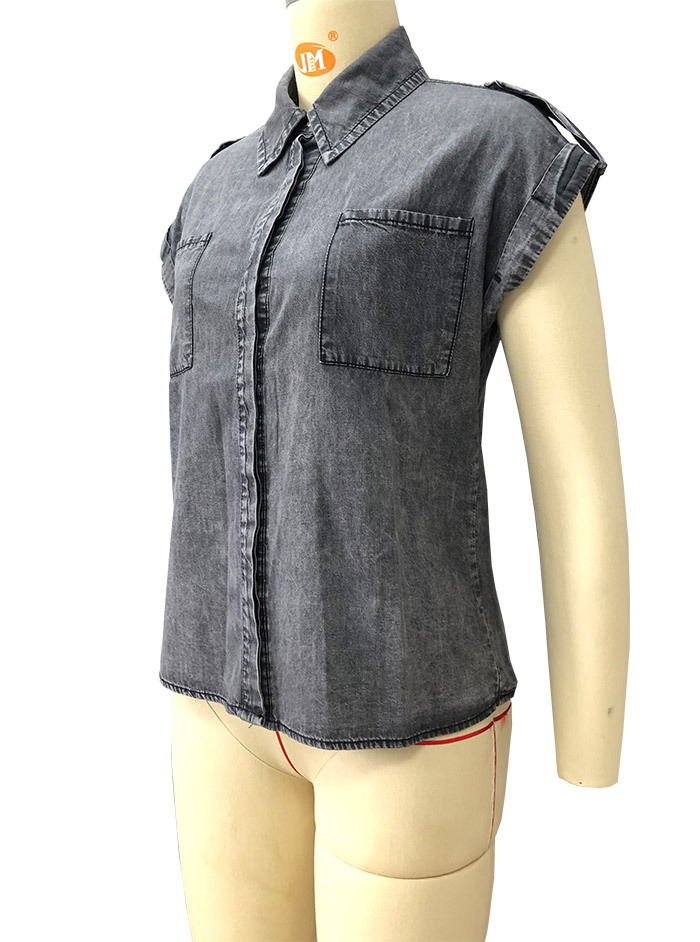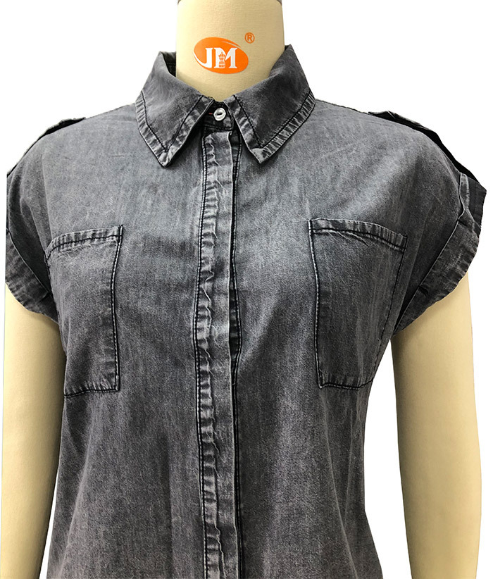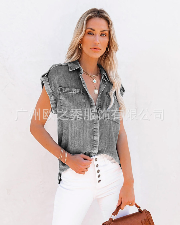AliExpress 크로스보더 2024 여름 반팔 데님 셔츠 유럽과 미국의 복고풍 여성 솔리드 컬러 셔츠 슬리밍 탑스토어 가기