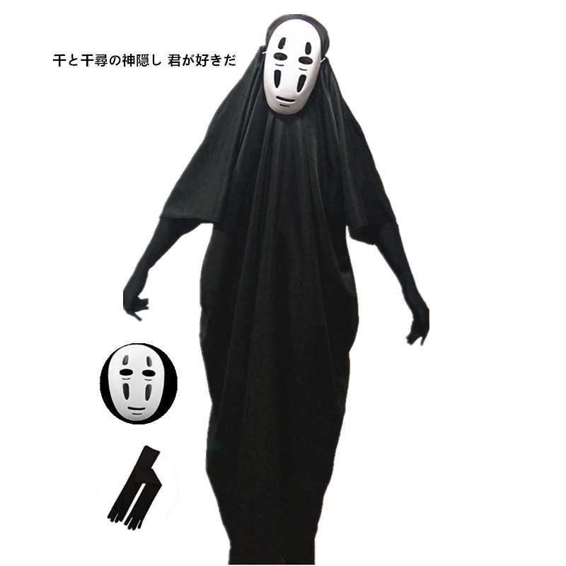 치히로의 치히로 얼굴없는 남성 코스프레 애니메이션 마스크 장갑 기모노 할로윈 유령 의상 망토 공연 의상