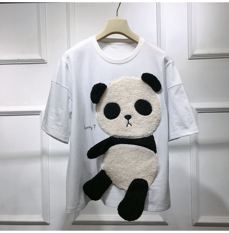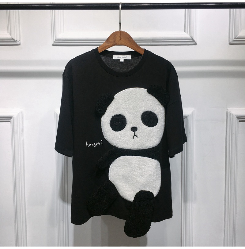 재고 2021 봄과 여름 새로운 한국 스타일 만화 팬더 세련된 홍콩 스타일 여성용 느슨한 탑 학생 반팔 티셔츠스토어 가기