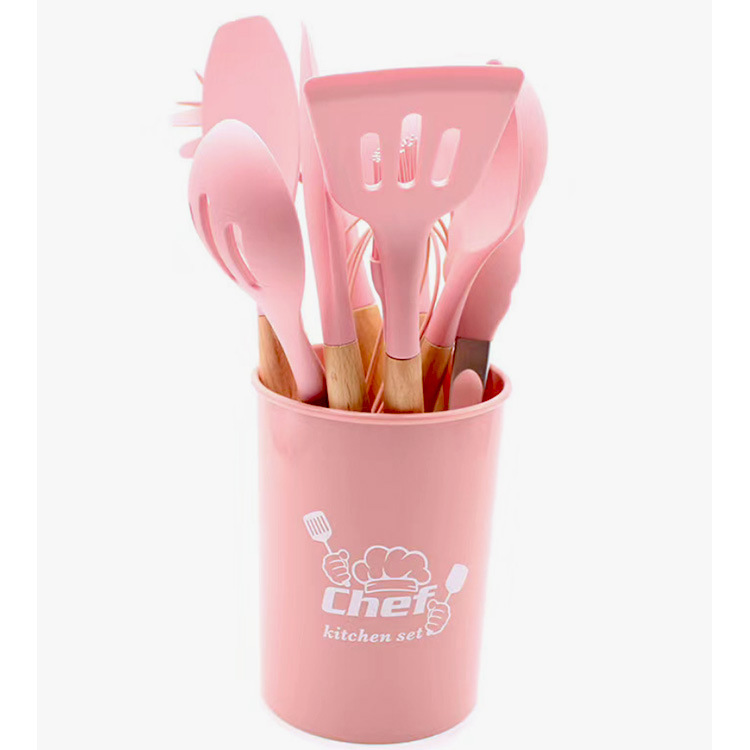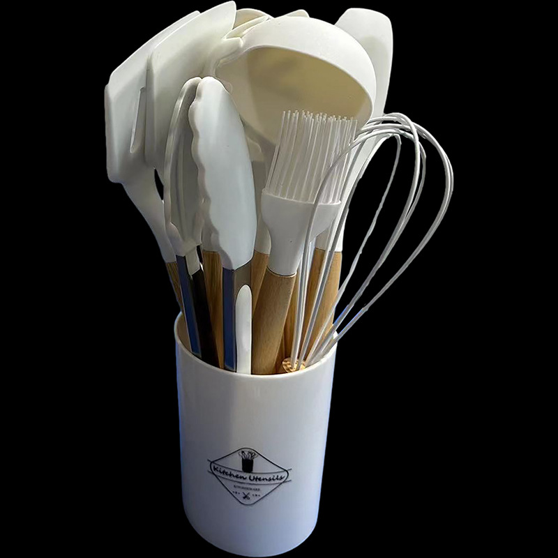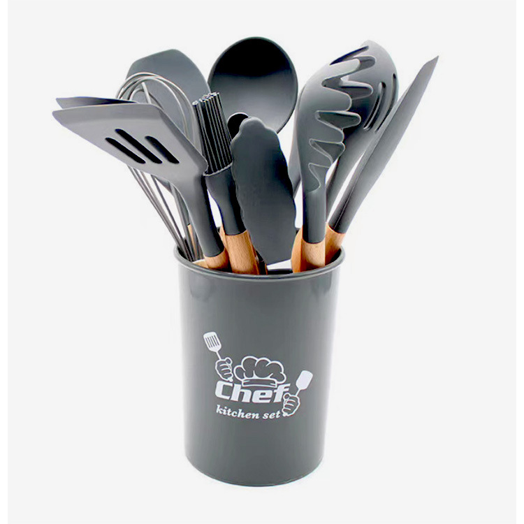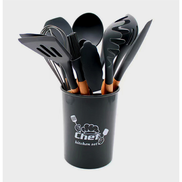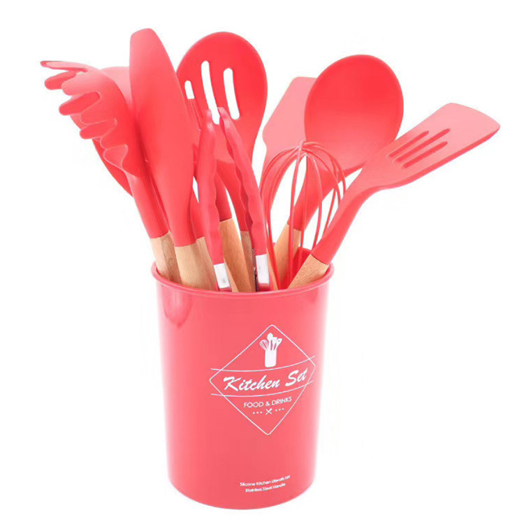 12피스 실리콘 주방용품 나일론 세트 보관통 나무 손잡이 실리콘 주걱 도구 요리용 숟가락 주걱 논스틱 팬