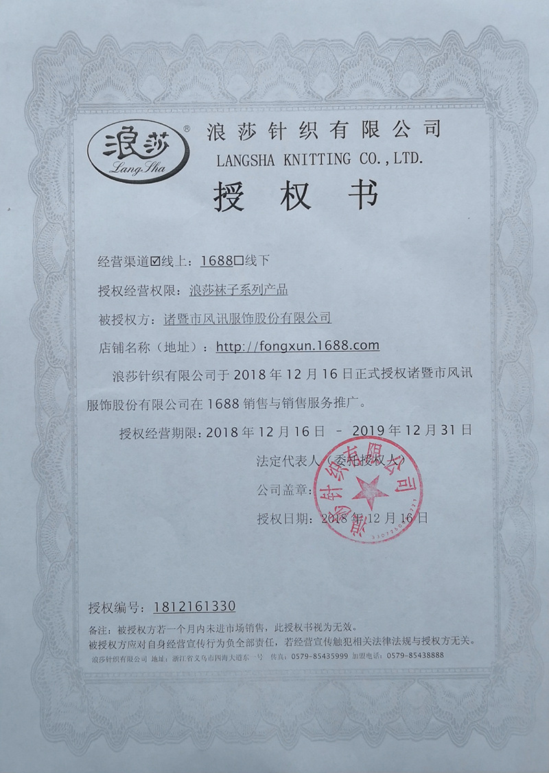 ♥单笔进货浪莎产品满2万元可开立浪莎授权一份♥