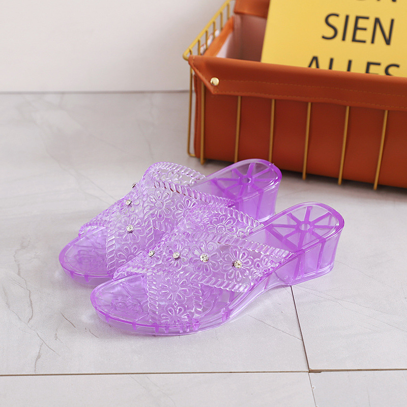 새로운 플라스틱 젤리 라인 석 슬리퍼 여성용 여름 미드 힐 타입 두꺼운 바닥 겉옷 캐주얼 어머니 신발스토어 가기
