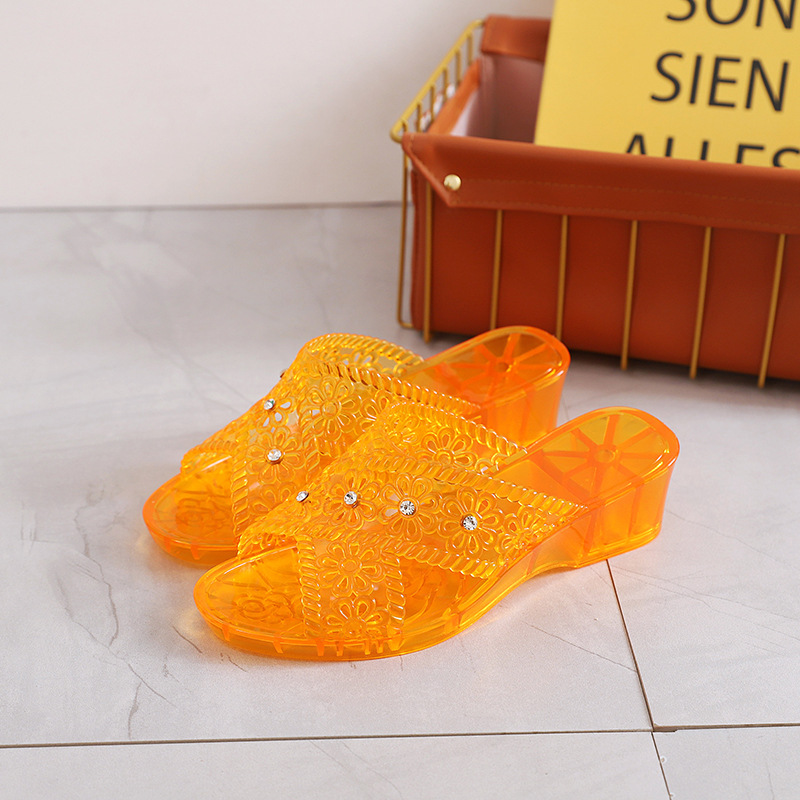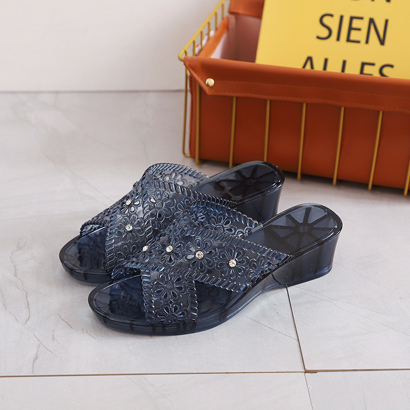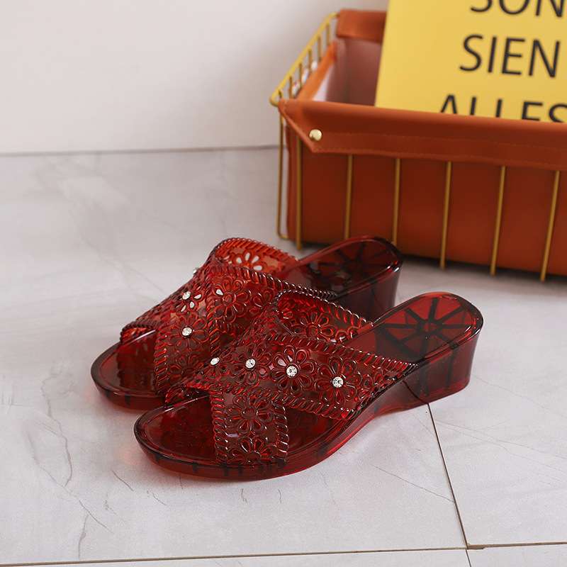 새로운 플라스틱 젤리 라인 석 슬리퍼 여성용 여름 미드 힐 타입 두꺼운 바닥 겉옷 캐주얼 어머니 신발