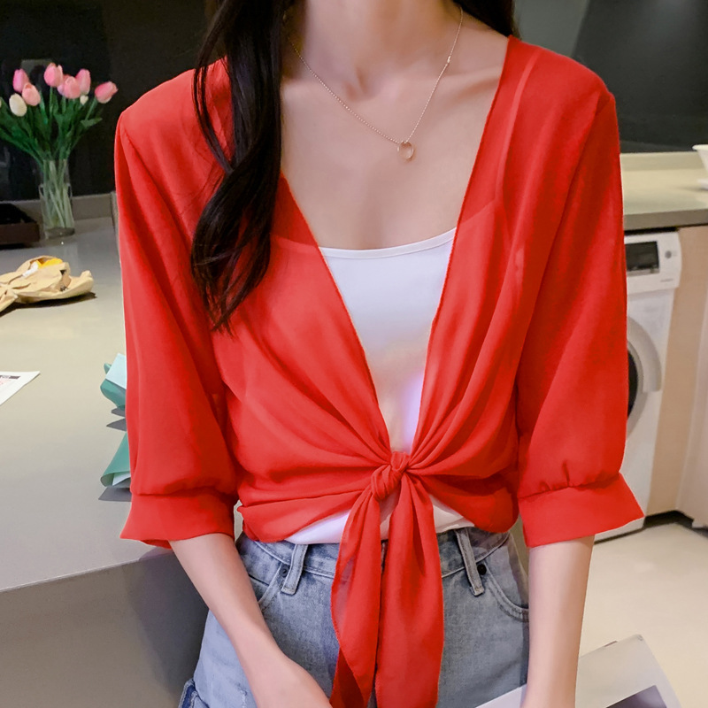 스트랩 스커트 스몰 코트 여름 새로운 모든 매치 여성용 반팔 쉬폰 자외선 차단제 카디건 얇은 숄 탑