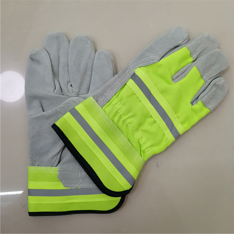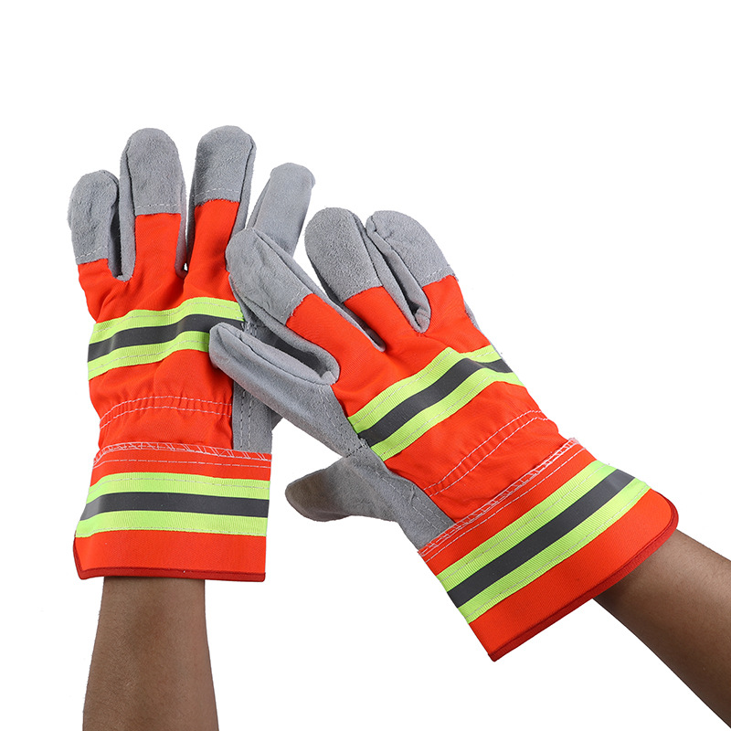 형광 스트립 용접 장갑 야외 노동 보호 원예 용접 장갑 단열 오렌지 천 소가죽 장갑 오래된 보호 용품