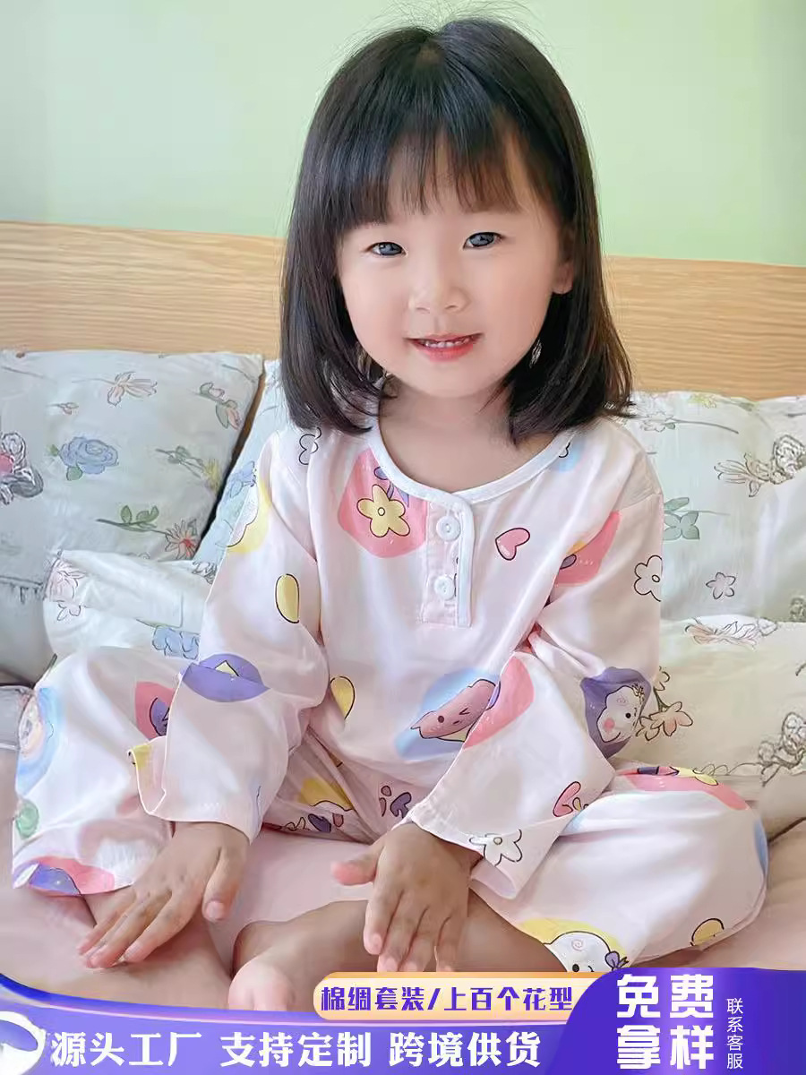 여름 얇은 어린이 잠옷 면 실크 긴팔 세트 어린이 소년 소녀 면 실크 아기 에어컨 의류 가정 의류