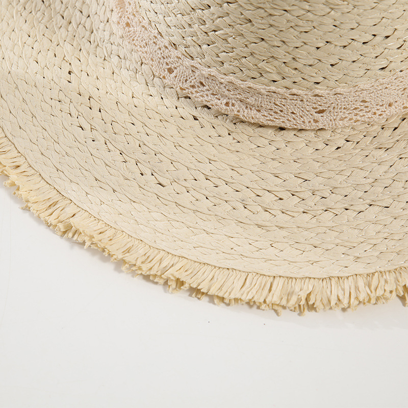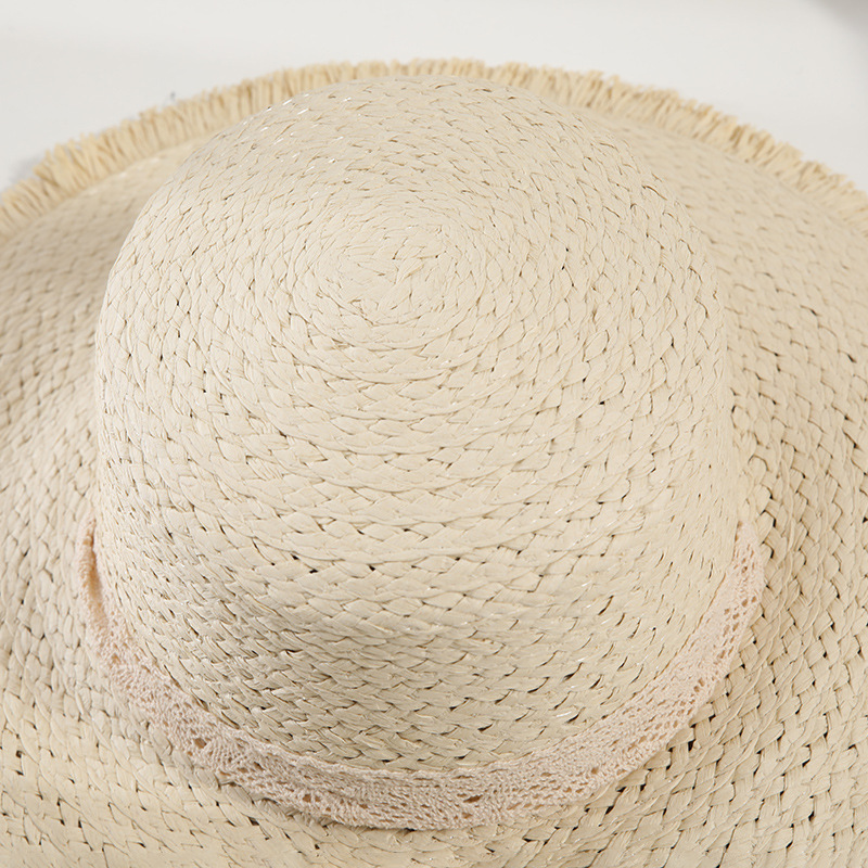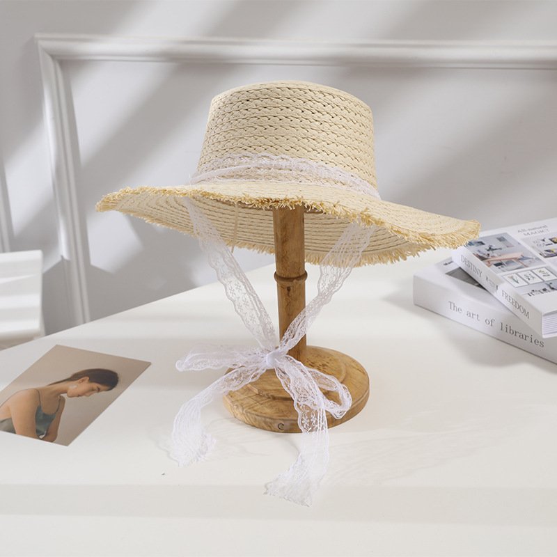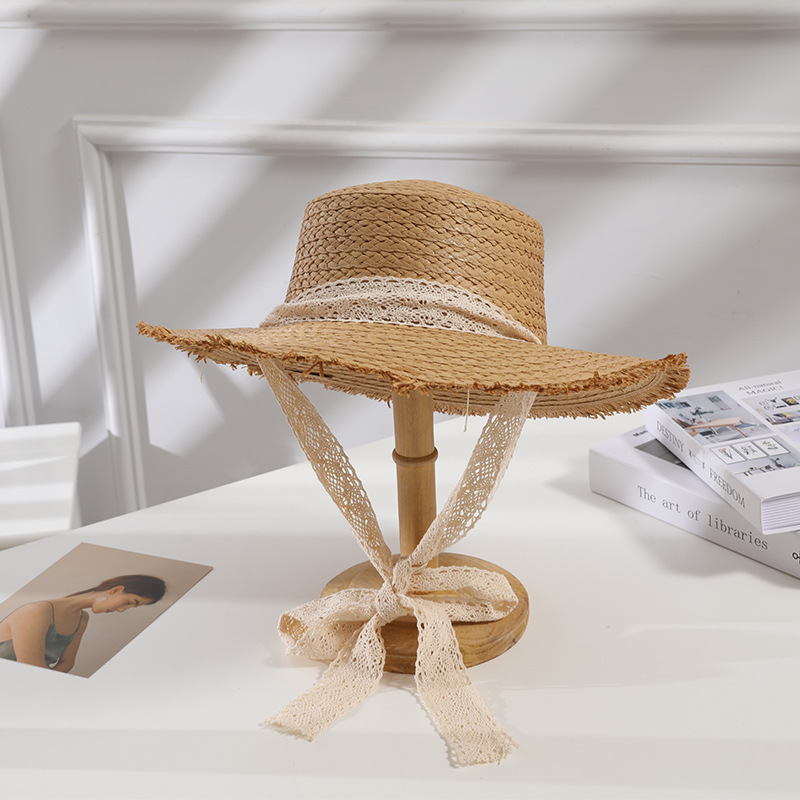 챙이 넓은 거친 짠 밀짚 모자 차양 모자 여름 플랫 탑 스 트리머 레이스 업 해변 휴가 태양 모자 비치 모자 조수