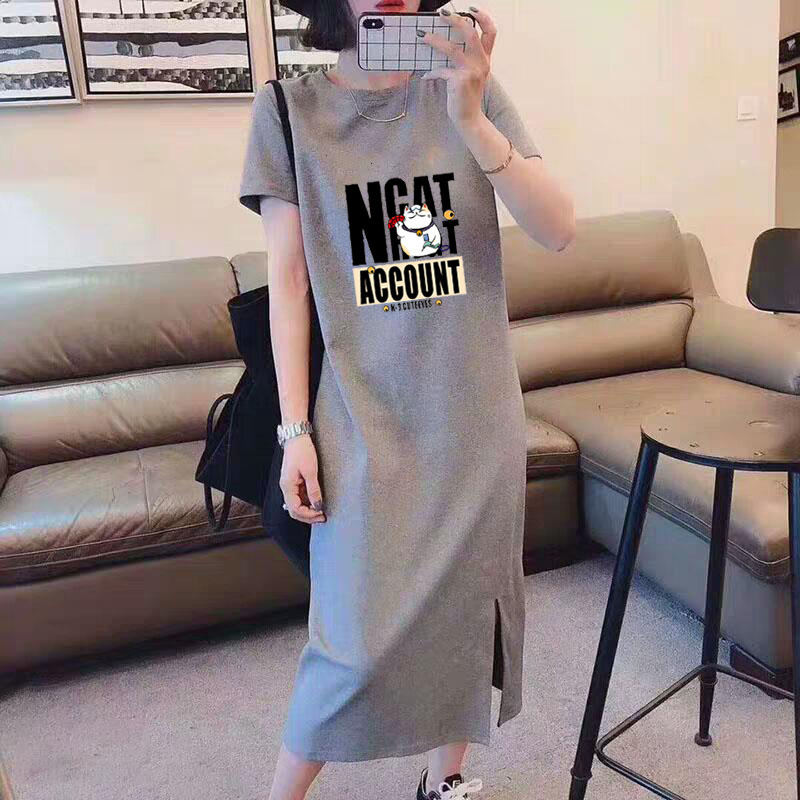 크로스 보더 여성의 2023 여름 새로운 느슨한 원피스 여자의 심플 프린트 스플릿 스커트 반팔 크로스 보더 대외 무역스토어 가기