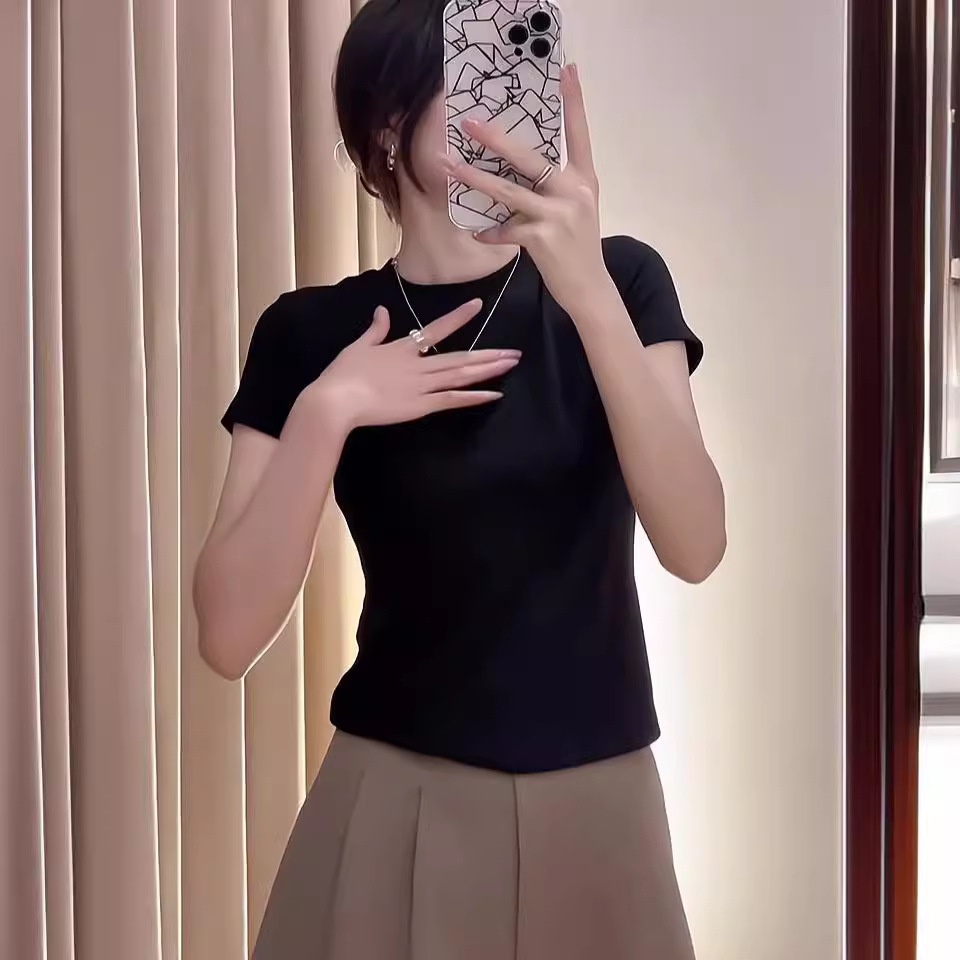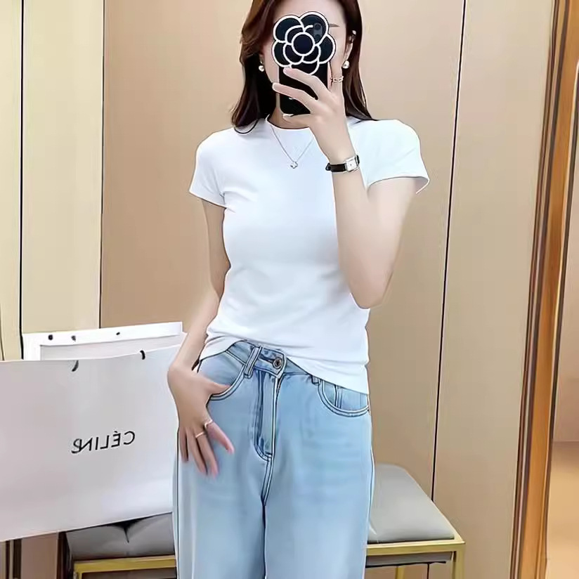 여름 짧은 순수한 흰색 티셔츠 여성 반팔 슬림 반팔 2025 새로운 95 탑 티셔츠 바닥 셔츠 유행스토어 가기