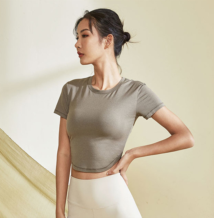 봄, 가을용 여성용 짧은 스포츠 탑, 런닝, 캐주얼, 반팔, 피트니스, 요가복, 크롭 티셔츠, 가슴 패드 포함